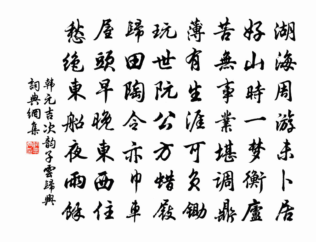 詩詞名句歷史字典書法欣賞書法字典國語詞典說文解字康熙字典古漢語字典標 題 作 者 詩 句 次韻子云歸興作者:韓元吉 朝代:宋代次韻子云歸興原文湖海週遊未卜居,好山時一夢衡廬。苦無事業堪調鼎,薄有生涯可負鋤。玩世阮公方蠟屐,歸田陶令亦巾車。屋頭早晚東西住,愁絕東船夜雨余。詩詞問答問:次韻子云歸興的作者是誰?答:韓元吉問:次韻子云歸興寫於哪個朝代?答:宋代問:韓元吉的名句有哪些?答:韓元吉名句大全韓元吉次韻子云歸興書法欣賞次韻子云歸興書法作品詩詞推薦秋月乘興游松江至垂虹亭登長橋夜泊南岸旦游朱長文〔唐代〕漠漠秋煙幕故園,沉沉暮色暝漁船。月華未出詩翁遠,樂事人間少十全。和張寺丞功父八絕句楊萬里〔宋代〕與子相望天一方,有書無使倩誰將。歸鴻欲下還飛去,不作書郵有底忙。武擔山感事孫應時〔宋代〕襟懷能坦坦,色笑更欣欣。似道黃叔度,草玄揚子云。歸舟真已具,別袂不能分。歲月愁邊雁,飛鳴報客聞。荀淑徐鈞〔宋代〕家號八龍名父子,學傳二李好師生。風標想見當時少,況是閒居絕宦情。春寄西山陳陶貫休〔唐代〕搔首復搔首,孤懷草萋萋。春光已滿目,君在西山西。塹水成文去,庭柯擎翠低。所思不可見,黃鳥花中啼。送趙端質歸朝王之道〔宋代〕聖治中興日,宗藩第一流。九重資共理,三載賴分憂。昨日交符虎,當時競帶牛。咄咄成藥石,談笑獲鋤耰。善政游柏谷寺寄范君武李復〔宋代〕絕塞初歸喜浣休,東城送客偶成游。山前欲訪青蘭若,林下初聞黃鷅鶹。雙屨高窮溪水出,一身輕共野雲浮。寄聲壽安雜詩十首且游司馬光〔宋代〕遊人巒山水,日晏澹忘歸。但愛雲煙好,那知仆馬飢。蠟梅二首吳芾〔宋代〕誰將栗玉刻蜂房,巧向梢頭取次妝。羞得江梅都避舍,滿園不見一枝芳。寄默庵胡仲弓〔宋代〕剩得吟身漫浪遊,機心猶在莫盟鷗。一枰碁里乾坤大,九節筇邊歲月流。涉世間關如履險,憂時感慨似悲秋。但營酬崔侍御期籍道士不至兼寄皇甫冉〔唐代〕一心求妙道,幾歲候真師。丹灶今何在,白雲無定期。崑崙煙景絕,汗漫往還遲。君但焚香待,人間到有時。論詩三十首·十三元好問〔金代〕萬古文章有坦途,縱橫誰似玉川盧? 真書不入今人眼,兒輩從教鬼畫符。寄賈元鎮並問楊似賢譚德稱李石〔宋代〕客子推移地,聞雞敢晏眠。酒樓春夜雨,柳岸早行天。龍臥風雷宅,蠶叢綿繡川。譚楊兩州教,記我別時年。奉和聖制送張說巡邊王光庭〔唐代〕賢相德符充,朝推文武雄。海波先若鏡,關草豫從風。鉞助將軍勇,威成天子功。瓊章九霄發,錫宴五衢通。玉輾峽中寓止二首鄭谷〔唐代〕荊州未解圍,小縣結茅茨。強對官人笑,甘為野鶴欺。江春鋪網闊,市晚鬻蔬遲。子美猶如此,翻然不敢悲。傳聞寄張諤招張安國金陵法曹王安石〔宋代〕我老願為臧丈人,君今少壯豈長貧。好須自致青冥上,可且相從寂寞濱。深谷黃鸝嬌引子,曲碕翠碧巧藏身。尋幽和浦城買舟趙希逢〔宋代〕丈夫償知命,身肯委虛舟。不為君親重,徒知道路憂。危機甘失腳,苦海莫回頭。接跡岩牆下,滔滔皆若流。送休公歸衡劉昭禹〔唐代〕草履初登南嶽船,銅瓶猶貯北山泉。衡陽舊寺春歸晚,門鎖寒潭幾樹蟬。楚城靖節祠洪咨夔〔宋代〕雨引莓苔上短垣,流泉無恙自涓涓。不如歸去來兮好,百世聞風只杜鵑。句洪邁〔宋代〕願儲翳國三年艾,不博江心百鍊銅。名句推薦料因循誤了,殘氈擁雪,故人心眼。張炎《解連環·孤雁》 明朝望鄉處,應見隴頭梅。宋之問《題大庾嶺北驛》 去年今日此門中,人面桃花相映紅。崔護《題都城南莊》 半天涼月色,一笛酒人心。袁枚《夜過借園見主人坐月下吹笛》 肅肅花絮晚,菲菲紅素輕。杜甫《春遠 / 春運》 罪至重而刑至輕,庸人不知惡矣,亂莫大焉。荀子《荀子·正論》 紛紛紅紫已成塵,布穀聲中夏令新。陸游《初夏絕句》 空勞縴手,解佩贈情人。牛希濟《臨江仙·柳帶搖風漢水濱》 黑髮不知勤學早,白首方悔讀書遲。顏真卿《勸學詩》 萬里歸船弄長笛,此心吾與白鷗盟。黃庭堅《登快閣》