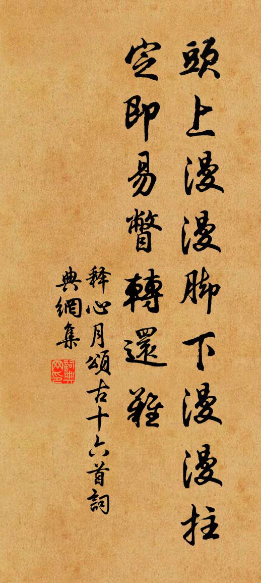 詩詞名句歷史字典書法欣賞書法字典國語詞典說文解字康熙字典古漢語字典標 題 作 者 詩 句 頌古十六首作者:釋心月 朝代:宋代頌古十六首原文頭上漫漫,腳下漫漫。拄定即易,瞥轉還難。詩詞問答問:頌古十六首的作者是誰?答:釋心月問:頌古十六首寫於哪個朝代?答:宋代釋心月頌古十六首書法欣賞頌古十六首書法作品詩詞推薦奉和虢州劉給事使君三堂新題二十一詠竹洞韓愈〔唐代〕竹洞何年有,公初斫竹開。洞門無鎖鑰,俗客不曾來。受恩深(大石調)柳永〔宋代〕雅致裝庭宇。黃花開淡濘。細香明艷盡天與。助秀色堪餐,向曉自有真珠露。剛被金錢妒。擬買斷秋天,容易獨步送台州沈虞卿使君入朝孫應時〔宋代〕靖康建炎事,嘗聞諸公言。志士日夕心,鳴咽聲氣吞。新亭五十年,塵埃尚中原。君王大經略,夢想天河翻。時情望鄉台范成大〔宋代〕千山已盡一峰孤,立馬行人莫疾驅。從此蜀川平似掌,更無高處望東吳。莫疑王安石〔宋代〕莫疑禪伯未知禪,莫笑仙翁不學仙。靈骨肯傳黃櫱燼,真心自放赤松煙。蓮華世界何關汝,楮葉工夫浪費年。露鶴又和歐陽修〔宋代〕憑高寓目偶乘閒,◇服遊人見往還。明月正臨雙闕上,行歌遙聽九衢間。黃金絡馬追朱幰,紅燭籠紗照玉顏。與世虢國夫人夜遊圖蘇軾〔宋代〕佳人自鞚玉花驄,翩如驚燕蹋飛龍。金鞭爭道寶釵落,何人先入明光宮。宮中羯鼓催花柳,玉奴弦索花奴手。坐中桂枝香佚名〔宋代〕恩袍草色。望滿目青青,光動阡陌。拂拂鞭絲散漫,錦韉玉勒。君王賜與瓊林宴,玩丹桂、香浮仙籍。舜韶清雅,宮詞王仲修〔宋代〕國家三歲一郊天,萬騎雲從錦繡鮮。陟降圓壇徹黃道,更虛小次待升煙。挽鄒彥明楊萬里〔宋代〕野渡無冰涉,荒民不木飢。橋橫侍郎記,墓立舍人碑。自古誰無死?何人沒後思?淙淙富川水,便是輓歌詞。舟行即事朱淑真〔宋代〕滿江流水萬重波,未似幽懷別恨多。目斷新闈瞻不到,臨風揮淚獨悲歌。雪後觀潩水韓維〔宋代〕微陽動泉脈,遠水來渙渙。斜日著底明,輕冰隨處斷。清函竹陰碎,綠與波紋亂。安得解扁舟,窮源事幽觀。辛酉大雪戲成二詩以千山鳥飛絕萬逕人蹤滅為周麟之〔宋代〕堆盤水精鹽,翻匙雲子飯。年年六出花,不必以瑞獻。浪言平地尺,貧亦非所顧。愁無儋石儲,安敢擲百萬。苦楝花溫庭筠〔唐代〕院裡鶯歌歇,牆頭蝶舞孤。天香薰羽葆,宮紫暈流蘇。晻曖迷青瑣,氤氳向畫圖。只應春惜別,留與博山爐。謝師恩 贈皇親四官人王處一〔元代〕出塵同結逍遙伴。更不爭長短。自有元初真容面。增延福壽,妙通玄奧,品位重遷換。靜調龍虎常交戰。靈寶攢心盱眙蔡戡〔宋代〕自古東南第一山,於今無異玉門關。亂雲衰草蒼茫外,赤縣神州指顧間。擊楫何人酬壯志,憑欄終日慘愁顏。中原劉世疏庵陳岩〔宋代〕亂草枯茅町疃場,寒風捲地日荒荒。有來提起山庵話,又是先生朽骨香。送轉運判官李公恕還朝蘇轍〔宋代〕我行未厭山東遠,昔遊歷下今梁苑。官如雞肋浪賓士,政似牛毛常黽勉。幸公四年持使節,按行千里長相見。鷹掣去杭十五年復游西湖用歐陽察判韻蘇軾〔宋代〕我識南屏金鯽魚,重來拊檻散齋余。還從舊社得心印,似省前生覓手書。葑合平湖久蕪漫,人經豐歲尚凋疏。誰憐醉吟酒肆布衣〔唐代〕陽春時節天氣和,萬物芳盛人如何。素秋時節天地肅,榮秀叢林立衰促。有同人世當少年,壯心儀貌皆儼然。一旦名句推薦田家占氣候,共說此年豐。孟浩然《田家元日》 西北望長安,可憐無數山辛棄疾《菩薩蠻·書江西造口壁》 俯皇都之宏麗兮,瞰雲霞之浮動。曹植《銅雀台賦》 每圓處即良宵,甚此夕偏饒,對歌臨怨。吳文英《玉漏遲·瓜涇度中秋夕賦》 相逢成夜宿,隴月向人圓。杜甫《宿贊公房》 香聞流水處,影落野人家。道源《早梅》 幾度紅窗,誤認鳴鑣。斷腸風月可憐宵。蔡伸《一剪梅·堆枕烏雲墮翠翹》 天與三台座,人當萬里城。張九齡《奉和聖制送尚書燕國公赴朔方》 長條短葉翠濛濛,才過西風,又過東風。夏完淳《一剪梅·詠柳》 宦情羈思共淒淒,春半如秋意轉迷柳宗元《柳州二月榕葉落盡偶題》