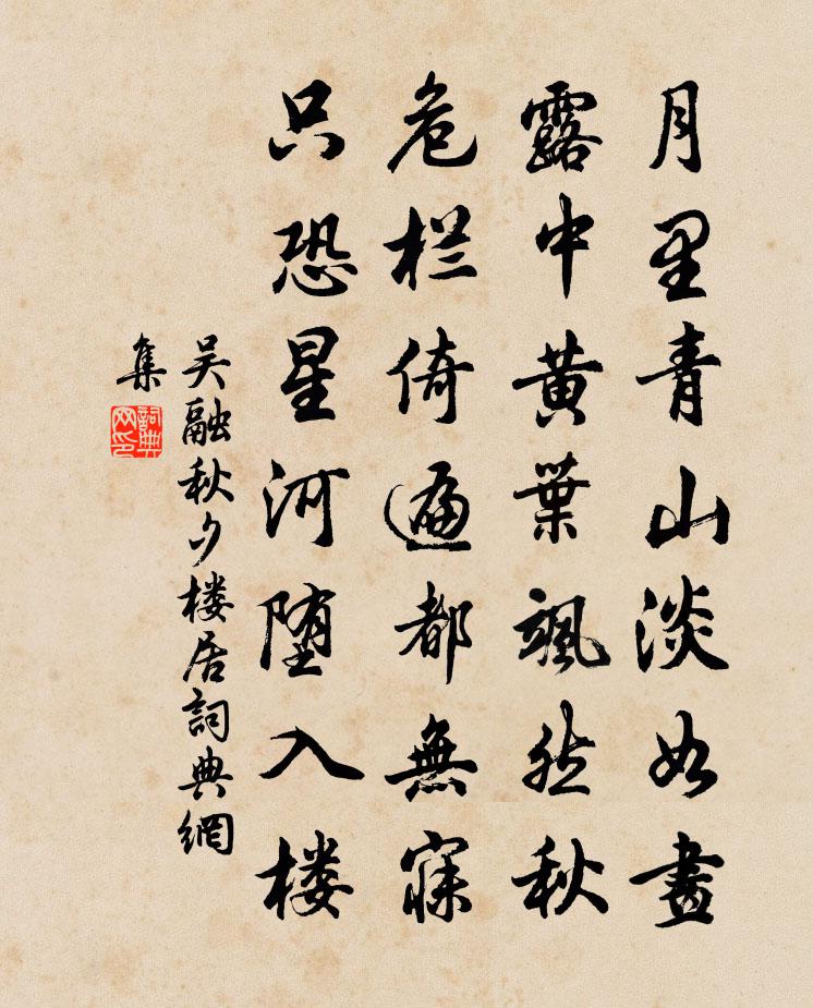 詩詞名句歷史字典書法欣賞書法字典國語詞典說文解字康熙字典古漢語字典標 題 作 者 詩 句 秋夕樓居作者:吳融 朝代:唐代秋夕樓居原文月里青山淡如畫,露中黃葉颯然秋。危欄倚遍都無寐,只恐星河墮入樓。詩詞問答問:秋夕樓居的作者是誰?答:吳融問:秋夕樓居寫於哪個朝代?答:唐代問:秋夕樓居是什麼體裁?答:七絕吳融秋夕樓居書法欣賞秋夕樓居書法作品注釋全唐詩:卷685-62詩詞推薦偶成李流謙〔宋代〕離家記得臘前時,吹盡飛花了不知。傍枕厭聽連曉雨,援毫愁賦送春詩。百年直好平章看,萬事仍須爛熟思。臣朔踏莎行佚名〔宋代〕月朏銀河,秋生玉宙。金風叢桂香生袖。兒孫重侍戲斑蘭,霞觴共慶公家壽。學問從心,希年誰有。東之行應賢良贈道流陸游〔宋代〕羽人邂逅飲旗亭,自說經年醉不醒。曾伴翰林游赤壁,仍邀內史寫黃庭。古琴蛇蚹評無價,寶劍魚腸托有靈。太華句晏殊〔宋代〕靜尋啄木藏身處,間看遊絲到地時。送王十五判官扶侍還黔中(得開字)杜甫〔唐代〕大家東徵逐子回,風生洲渚錦帆開。青青竹筍迎船出,日日江魚入饌來。離別不堪無限意,艱危深仗濟時才。黔陽寄王承務釋祖先〔宋代〕經年相別無他囑,莫只波波意里求。病去藥除訊息盡,紅塵堆里等閒游。春日西興道中張栻〔宋代〕江梅已過杏花初,尚怯余寒著萼疎。待得重來幾枝在,半隨蝶翅半蜂須。山中春思獨孤及〔唐代〕獺祭川水大,人家春日長。獨謠晝不暮,搔首慚年芳。靡草知節換,含葩向新陽。不嫌三徑深,為我生池塘。亭午奉和御製甘雨應祈夏竦〔宋代〕少臯九秋當季月,成湯六禱動靈心。中宵甘澍均豐浸,盡日層雲結遠陰。銷去驕陽為瑞重,招來嘉應感人深。側身題袁州東湖盧肇石祖無擇〔宋代〕袁山之陽秀水側,草覆遺基誰氏宅。皆雲子發其姓盧,往往文章名籍籍。宅中舊物何所存,惟有嶙峋一區石。闊才觀講師有感王洋〔宋代〕一僧據幾坐,眾僧列其間。紛紛士與女,其外復相環。娟娟誰家婦,粉面垂煙鬟。既為時俗妝,復著道士冠。一聞淮南秋夜呈周侃(一作呈同僚)李嶷〔唐代〕天淨河漢高,夜閒砧杵發。清秋忽如此,離恨應難歇。風亂池上萍,露光竹間月。與君共游處,勿作他鄉別。游彭城公白蓮莊歐陽修〔宋代〕謝墅多幽賞,華軒曾共尋。人閒聊載酒,台迥獨披襟。水落陂光淡,城當山氣陰。惟餘桃李樹,日覺翠蹊深。寄新定蘇七太守張伯玉〔宋代〕聞道銀符渡睦溪,桐山應為長清暉。漁翁幾十迎舟拜,沙鳥成雙夾旆飛。檢點簿書茶貢蚤,體量風物橘奴肥。題輿友人朱淵出示廷對策不顧忌諱讀之使人凜凜受戴復古〔宋代〕龍墀射策對明君,憂國忠言駭見聞。皎皎一心如白日,寥寥千古再朱雲。時危諸老皆求去,兵滿三邊未解紛。要使同李二十八員外從裴相公野宿西界韓愈〔唐代〕四面星辰著地明,散燒煙火宿天兵。不關破賊須歸奏,自趁新年賀太平。偈頌六十首釋曇華〔宋代〕德章老瞎禿,從來沒滋味。拈得口,失卻鼻。三更二點唱巴歌,無端驚起梵王睡。入華山訪隱者經仙人石壇李益〔唐代〕三考四岳下,官曹少休沐。久負青山諾,今還獲所欲。嘗聞玉清洞,金簡受玄籙。夙駕升天行,雲遊恣霞宿。平明失調名佚名〔宋代〕燕子引雛飛。筆徐寅〔唐代〕君子三端擅一名,秋毫雖細握非輕。軍書羽檄教誰錄,帝命王言待我成。勢健豈饒肥水陣,鋒聒還學歷山耕。毛乾名句推薦三百年間同曉夢,鐘山何處有龍盤。李商隱《詠史二首·其一》 忘卻成都來十載,因君未免思量。蘇軾《臨江仙·送王緘》 浮雲蔽白日,遊子不顧返。佚名《行行重行行》 路入南中,桄榔葉暗蓼花紅。歐陽炯《南鄉子·路入南中》 艷歌餘響,繞雲縈水蘇軾《水龍吟·黃州夢過棲霞樓》 子規啼,不如歸,道是春歸人未歸。關漢卿《大德歌·春》 翹思慕遠人,願欲托遺音。曹植《雜詩六首·其一》 黯與山僧別,低頭禮白雲。李白《秋浦歌十七首》 相見易得好,久住難為人。佚名《增廣賢文·上集》 西風酒旗市,細雨菊花天。歐陽修《秋懷》