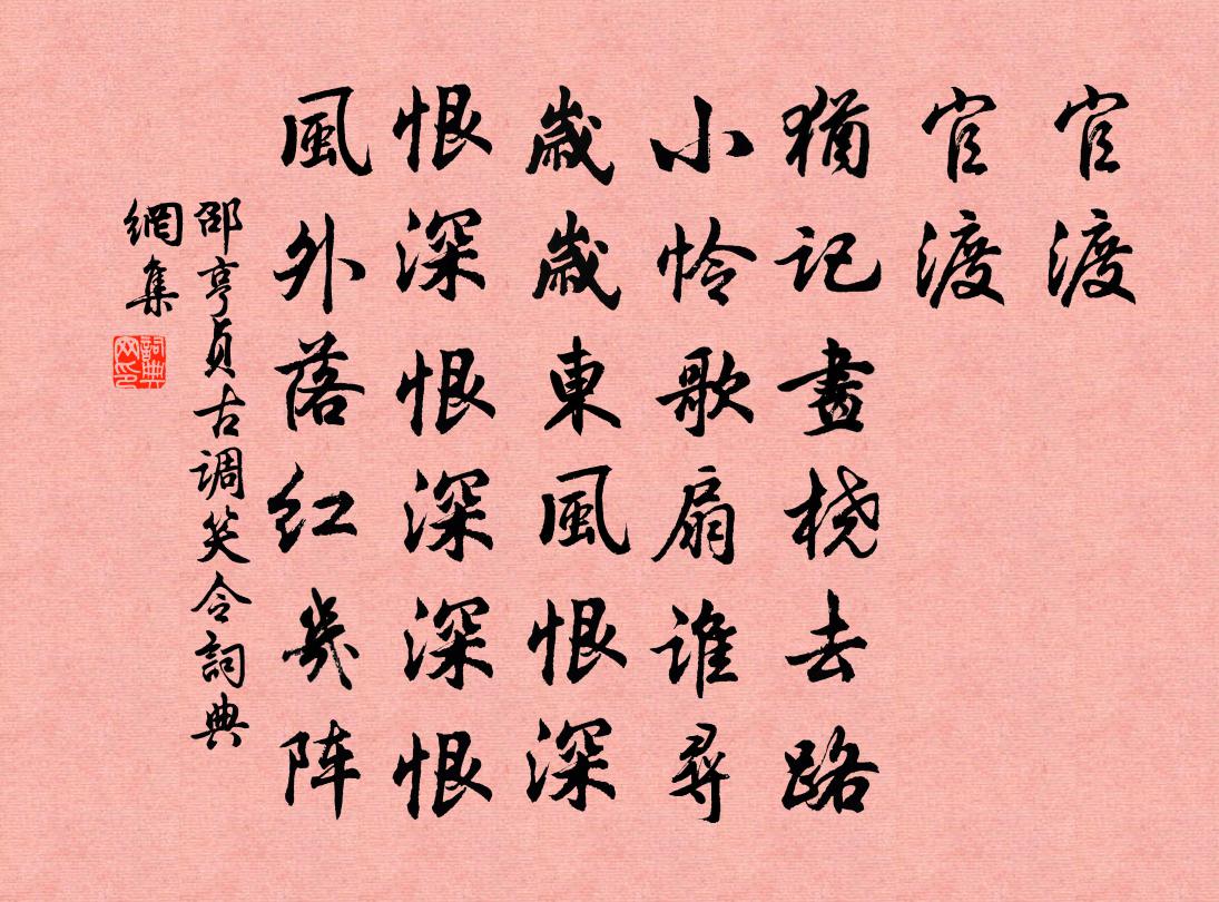 詩詞名句歷史字典書法欣賞書法字典國語詞典說文解字康熙字典古漢語字典標 題 作 者 詩 句 古調笑令作者:邵亨貞 朝代:元代古調笑令原文官渡。官渡。猶記畫橈去路。小憐歌扇誰尋。歲歲東風恨深。恨深恨深深恨。風外落紅幾陣。詩詞問答問:古調笑令的作者是誰?答:邵亨貞問:古調笑令寫於哪個朝代?答:元代問:古調笑令是什麼體裁?答:詞邵亨貞古調笑令書法欣賞古調笑令書法作品詩詞推薦賀新郎 次范君鐸詔後喜雨韻王結〔元代〕露下天如洗。正新晴、明河如練,月華如水。獨據胡床秋夜永,耿耿佳人千里。空悵望、丰容旖旎。萬斛清愁縈懷減字木蘭花黃庭堅〔宋代〕巫山古縣。老杜淹留情始見。撥悶題詩。千古神交世不知。雲陽台下。更值清明風雨夜。知道愁辛。果是當時作賦法曲獻仙音陳允平〔宋代〕風籜晴暄,晝桐陰早,燕閣新香時度。沁月樓台,帶山城郭,西湖翠嬌紅嫵。甚愛此閒中趣,尋盟舊鷗鷺。共容與和思故人趙希逢〔宋代〕蹤跡江湖任所之,雄文到處寫明璣。詩書未得一兒用,豪傑空令眾譽歸。千里雲山飛不到,寸心日惄如飢。幾番清夜坐陸游〔宋代〕耿耿殘燈夜未央,負牆閒對篆盤香。風號東北河冰合,月落西南竹影長。孤鵲欲棲頻繞樹,寒龜無息穩搘床。頹然巫山廟上下數十里有烏鳶無數取食於行舟之上蘇軾〔宋代〕群飛來去噪行人,得食無憂便可馴。江上飢烏無足怪,野鷹何事亦頻頻。清平樂(代使相勸酒)史浩〔宋代〕南陽賓友。道舊須尊酒。一曲為公千歲壽。弦索春風縴手。忠謀黼黻明昌。英詞錦繡甘腸。帝所盛推頗牧,人間尤西城馬上賀鑄〔宋代〕燭冷塵消過上元,晴明風日柳初繁。偷閒偶到西城陌,喜見青山似故園。臨江仙黃機〔宋代〕上巳清明都過了,客愁惟有心知。子規昨夜忽催歸。驛程那復記,魂夢已先飛。回首故園花與柳,枝枝葉葉相思。不赴拾遺召費冠卿〔唐代〕君親同是先王道,何如骨肉一處老。也知臣子合佐時,自古榮華誰可保。芍藥五首張嵲〔宋代〕淺白輕黃皆異態,還如妬寵各低垂。暖風一陣塗香烈,午酒醺酣嗅蕊時。答曾無疑校勘劉克莊〔宋代〕詩到黃初字永和,半生西望遡明河。已招學士來儒館,更欠山人拜諫坡。四庫舊書存有幾,五朝遺老苦無多。傳聞泊沙市袁說友〔宋代〕雪浪雲煙日卷舒,去城遠近聚廛居。千年堤岸園沙市,十里人煙半竹廬。荊國平分荊水闊,楚樓遙接楚天余。江民題胡運乾別墅二首白玉蟾〔宋代〕博山一炷小蛇寒,無人獨自從 * 。柴門卻倩冷風關,檐外白雲時往還。蘇學十題公堂槐朱長文〔唐代〕五紀栽培後,三春長育中。靈根蟠故國,密葉蔭儒宮。患與般斤遠,歌宜魯藻同。先儒垂意遠,期此出三公。和聖俞詠昌言五物括蒼石屏司馬光〔宋代〕主人小石屏,得之括蒼山。括蒼道里遠,致此良變難。層崖萬仞余,勝出浮雲端。吳兒採石時,蘿蔓愁攀緣。石文答謝中書書陶弘景〔南北朝〕山川之美,古來共談。高峰入雲,清流見底。兩岸石壁,五色交輝。青林翠竹,四時俱備。曉霧將歇,猿鳥亂鳴;客窗夜雨林元卿〔宋代〕萬里辭家春復秋。異鄉何日夢刀頭。業如獻豕從渠笑,藝學屠龍只自羞。香盡一爐聞夜雨,燈殘半壁數更籌。斷腸題黃司理園王安石〔宋代〕為憶去年梅,凌寒特地來。閏前空臘盡,渾未有花開。沁園春(代壽直院陳文昌)李曾伯〔宋代〕今代清流,北斗以南,文昌一星。對露門進讀,鑾坡演翰,瑣闈批敕,寶牒成文。筆下權衡,胸中律度,禮樂人才名句推薦郵亭無人處,聽檐聲不斷,困眠初熟。周邦彥《大酺·越調春雨》 鳥飛反鄉,兔走歸窟,狐死首丘,寒將翔水,各哀其所生。劉安及其門客《淮南子·說林訓》 思君若汶水,浩蕩寄南征。李白《沙丘城下寄杜甫》 浮天滄海遠,去世法舟輕。錢起《送僧歸日本》 坐開桑落酒,來把菊花枝。杜甫《九日楊奉先會白水崔明府》 風定落花深,簾外擁紅堆雪。李清照《好事近·風定落花深》 居必擇鄉,游必就士。荀子《荀子·勸學》 故大人之務,將在於眾賢而已。墨子《墨子·08章 尚賢(上)》 若到江南趕上春,千萬和春住。王觀《卜運算元·送鮑浩然之浙東》 將贍才力,務在博見劉勰《文心雕龍·事類》
