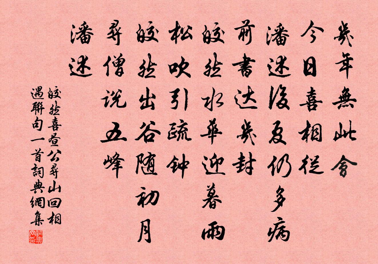 詩詞名句歷史字典書法欣賞書法字典國語詞典說文解字康熙字典古漢語字典標 題 作 者 詩 句 喜晝公尋山回相遇聯句一首作者:皎然 朝代:唐代喜晝公尋山回相遇聯句一首原文幾年無此會,今日喜相從。 ——潘述後夏仍多病,前書達幾封。 ——皎然水華迎暮雨,松吹引疏鍾。 ——皎然出谷隨初月,尋僧說五峰。 ——潘述詩詞問答問:喜晝公尋山回相遇聯句一首的作者是誰?答:皎然問:喜晝公尋山回相遇聯句一首寫於哪個朝代?答:唐代問:喜晝公尋山回相遇聯句一首是什麼體裁?答:聯句皎然喜晝公尋山回相遇聯句一首書法欣賞喜晝公尋山回相遇聯句一首書法作品注釋全唐詩:卷794-30詩詞推薦陪郡侯出郊勸農六絕洪咨夔〔宋代〕勸農冠蓋出江乾,馬上東風觱栗寒。珍重春衫唾花碧,畫眉狼籍道傍看。{左酉右倉}蟹高似孫〔宋代〕西風送冷出湖田,一夢酣春落酒泉。介甲盡為香玉軟,脂膏猶作紫霞堅。魂迷楊柳灘頭月,身老松花瓮里天。不是謝關景仁送紅梅栽二首蘇軾〔宋代〕為君栽向南堂下,記取他年著子時。酸釅不堪調眾口,使君風味好攢眉。又和答雲岩李曾伯〔宋代〕冰柱劉叉素有聲,詩筒毋惜仆頻更。鴛鴦瓦上猶留伴,一霎南風又釀成。和裴僕射朝回寄韓吏部張籍〔唐代〕獨愛南關里,山晴竹杪風。從容朝早退,蕭灑客常通。案曲新亭上,移花遠寺中。唯應有吏部,詩酒每相同。秋日寄李支使姚合〔唐代〕秋思朝來起,侵人暑稍微。曉眠離北戶,午飯尚生衣。山靜雲初白,枝高果漸稀。聞君家海上,莫與燕同歸。次韻遲初入宣河蘇轍〔宋代〕遠客安長道,低蓬稱小溪。雲添濕帆雨,舟滯沒篙泥。草綠耕牛健,村深侯鳥啼。陶翁方作令,歸去未成題。秋原野望楊凌〔唐代〕客雁秋來次第逢,家書頻寄兩三封。夕陽天外雲歸盡,亂見青山無數峰。贈明州霍員外黃滔〔唐代〕惠化如施雨,鄰州亦可依。正衙無吏近,高會覺人稀。海日旗邊出,沙禽角外歸。四明多隱客,閒約到岩扉。喜雨陸游〔宋代〕入夏久不雨,旱勢已岌岌。蛙蛤徒自喧,蛟龍臥如蟄。何由白水滿,但守青秧泣。上天忽悔禍,川雲起呼吸。虛檐湖陵與劉生別陳師道〔宋代〕觸寒歷險來特特,愧無以當欣有得。向來憂患不相舍,知子用心堅鐵石。人畏有心事無難,此語雖鄙理則然。君今偈頌三首釋先〔宋代〕三 * 於大千,其輪本來常清淨。若能奉持 * ,急急如律令。九日思杭州舊遊寄周判官及諸客白居易〔唐代〕忽憶郡南山頂上,昔時同醉是今辰。笙歌委曲聲延耳,金翠動搖光照身。風景不隨宮相去,歡娛應逐使君新。江山西江月郭應祥〔宋代〕賞月幾成喜雨,開尊仍間圍棋。令人卻憶敬齋詞。小飲不妨文字。底事冰輪未放,猶教銀幕低垂。休言動是隔年期中秋月寄子由三首蘇軾〔宋代〕舒子在汶上,閉門相對清。鄭子向河朔,孤舟連夜行。頓子雖咫尺,兀如在牢扃。趙子寄書來,水調有餘聲。悠哉三月初五日孟君復王元俞治中十人同會分韻得方回〔宋代〕春光九十日,半為風雨欺。人生一百年,懷抱無好時。茲辰復何辰,晴煙霏柳絲。佳友可我意,閒愁忽如遺。座客送鄭判官王昌齡〔唐代〕東楚吳山驛樹微,軺車銜命奉恩輝。英僚攜出新豐酒,半道遙看驄馬歸。懷寄潘孝本兼簡其子言賀鑄〔宋代〕春色先梅嶺,秋聲後桂林。溪通五羊險,雲近九疑陰。無雁難逢信,有猿能伴吟。一樽燒酒美,應對阿戎斟。菩薩蠻陸游〔宋代〕小院蠶眠春欲老。新巢燕乳花如掃。幽夢錦城西。海棠如舊時。當年真草草。一棹還吳早。題罷惜春詩。鏡中添鬢石鼓詩佚名〔先秦〕汧繄泛泛。烝彼淖淵。鰋鯉處之。君子漁之。漫漫有鯊。其游(左走右散)(左走右散)。白魚(左帛右樂)(左名句推薦任是春風吹不展。困倚危樓。秦觀《減字木蘭花·天涯舊恨》 春蠶到死絲方盡,蠟炬成灰淚始乾。李商隱《無題·相見時難別亦難》 念去來、歲月如流,徘徊久、嘆息愁思盈。周邦彥《綺寮怨·上馬人扶殘醉》 歲夜高堂列明燭,美酒一杯聲一曲。李頎《聽安萬善吹觱篥歌》 生當作人傑,死亦為鬼雄。李清照《夏日絕句》 臣強則死,念妄則亡。來俊臣《羅織經·事上卷第二》 君子和而不同,小人同而不和。孔子弟子《論語·子路篇》 此時瞻白兔,直欲數秋毫。杜甫《八月十五夜月二首》 小池寒綠欲生漪,雨晴還日西。秦觀《阮郎歸·春風吹雨繞殘枝》 魂來楓葉青,魂返關塞蒙杜甫《夢李白二首·其一》