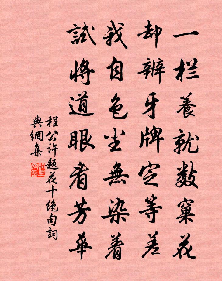 詩詞名句歷史字典書法欣賞書法字典國語詞典說文解字康熙字典古漢語字典標 題 作 者 詩 句 題花十絕句作者:程公許 朝代:宋代題花十絕句原文一欄養就數窠花,卻辨牙牌定等差。我自色塵無染著,試將道眼看芳華。詩詞問答問:題花十絕句的作者是誰?答:程公許問:題花十絕句寫於哪個朝代?答:宋代程公許題花十絕句書法欣賞題花十絕句書法作品詩詞推薦頌古四十四首釋師範〔宋代〕一片荊山璞,分明辨者難。幾人偷眼覷,只作石頭看。蝶戀花張先〔宋代〕移得綠楊栽後院。學舞宮腰,二月青猶短。不比灞陵多送遠。殘絲亂絮東西岸。幾葉小眉寒不展。莫唱陽關,真箇送杜子問歸明州連文鳳〔宋代〕未酬行道志,抱道復東歸。老入江湖鬢,寒深雨雪衣。客程煙樹晚,鄉夢海魚肥。所恨交情淺,臨岐別語稀。寶鼎現(筠翁李似之作此詞見招因賦其事,使歌之者想像風味如到山中也)張元乾〔宋代〕山莊圖畫,錦囊吟詠,胸中丘壑。年少日、如虹豪氣,吐鳳詞華渾忘卻。便袖手、向岩前溪畔,種滿煙梢霧籜。想感遇之三陳子昂〔唐代〕蒼蒼丁零塞。今古緬荒途。亭堠何摧兀。暴骨無全軀。黃沙幕南起。白日隱西隅。漢甲三十萬。曾以事凶奴。但見送表弟朱拙夫以縣尉赴新安薛揚祖〔宋代〕散金結客不求償,落落生平此勢腸。七尺許君何慷慨,一朝用世果循良。滿城山色侵官舍,遍地溪聲度女牆。邑長奉和御製看毛詩詩三章二章十二句一章八句夏竦〔宋代〕溫柔之教,政治之源。瞽能誦兮可以諫,士不學兮無以言。蓋成衰之所系,故諷諭之攸存。惟聖心兮垂思,永大庇蜀捷劉克莊〔宋代〕吠南初謂予堪侮,折北俄聞彼不支。撻覽果殲強弩下,鬼章有入檻車時。鍾繇捷表前無古,班固銘詩繼者誰。白髮跋某人詩卷劉克莊〔宋代〕元祐賦律古,熙寧經義新。請君忙改藝,詩好誤終身。漁家傲·小雨纖纖風細朱服〔宋代〕小雨纖纖風細細,萬家楊柳青煙里。戀樹濕花飛不起,秋無際,和春付與東流水。九十光陰能有幾?金龜解盡留無客有追嘆後時者作詩勉之聶夷中〔唐代〕後達多晚榮,速得多疾傾。君看構大廈,何曾一日成。在暖須在桑,在飽須在耕。君子貴弘道,道弘無不亨。太陽和程泰之閣學泛舟南溪遇雪韻三首袁說友〔宋代〕孤雁聲悲南浦,漁人冷徹歸蓑。獨有耐寒瓊玉,一枝先奪陽和。御製乃眷儲闈方崇學術錫群書於冊府勵至業於寇準〔宋代〕景命昭彰佑德基,元儲敦裕協祥期。寢門劭至嘗無怠,學肆多聞詎有疑。金玉騰音鏘睿律,簡編申錫振良規。河圖泛江玩月十二韻元稹〔唐代〕楚塞分形勢,羊公壓大邦。因依多士子,參畫盡敦厖。岳璧閒相對,荀龍自有雙。共將船載酒,同泛月臨江。遠樹讀書罷小酌偶賦陸游〔宋代〕歲晚淒涼冰雪晨,頹垣破屋鏡湖濱。浮生亦念古有死,壯氣要使胡無人。黃卷展殘三太息,綠尊酌罷一嚬伸。躬耕使至汴州喜逢宋之問李夔〔唐代〕阮籍蓬池上,孤韻竹林才。巨源從吏道,正擁使車來。相逢且交臂,相命且銜杯。醉後長歌畢,餘聲繞吹台。挽湯仲能二首劉克莊〔宋代〕訃至聾三日,悲來贖百身。太丘州里化,伯起子孫貧。零落歐門士,消磨濮議人。殷勤齎掬淚,一灑素車塵。點絳唇謝應芳〔元代〕弧矢休懸,舉杯聊適棲遲意。明朝冬至。有酒還沉醉。堪笑神仙,要作長生計。人間世。金鳥西墜。難把長繩系。絕句四首陳師道〔宋代〕芒鞋竹杖最關身,散發披衣不待人。三兩作鄰堪共活,五千插架未為貧。十二月十五夜袁枚〔清代〕沉沉更鼓急,漸漸人聲絕。吹燈窗更明,月照一天雪。名句推薦白骨如山忘姓氏,無非公子與紅妝。曹雪芹《紅樓夢·第八回》 風光人不覺,已著後園梅。史青《應詔賦得除夜》 鴻雁幾時到,江湖秋水多。杜甫《天末懷李白》 漢女輸橦布,巴人訟芋田。王維《送梓州李使君》 年少萬兜鍪,坐斷東南戰未休。辛棄疾《南鄉子·登京口北固亭有懷》 寒英坐銷落,何用慰遠客。柳宗元《早梅》 關山多雨雪,風水損毛衣。李遠《詠雁》 浮天滄海遠,去世法舟輕。錢起《送僧歸日本》 中年親友難別,絲竹緩離愁。蘇軾《水調歌頭·安石在東海》 蜂須輕惹百花心,蕙風蘭思寄清琴。薛昭蘊《浣溪沙·握手河橋柳似金》