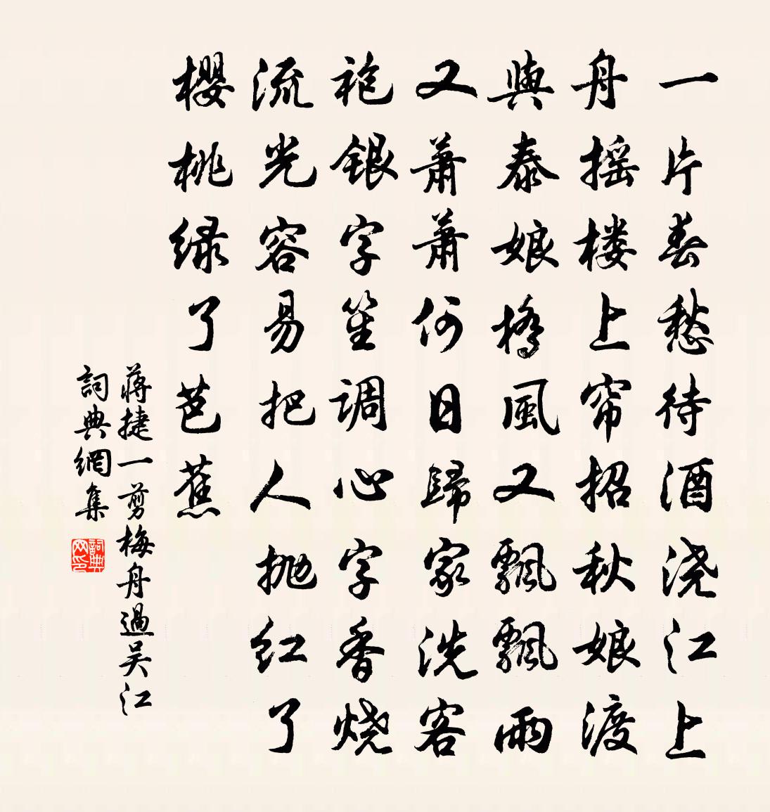 一片春愁待酒澆。江上舟搖,樓上簾招。秋娘渡與泰娘橋,風又飄飄,雨又蕭蕭。(渡 一作:度。橋 一作:嬌)