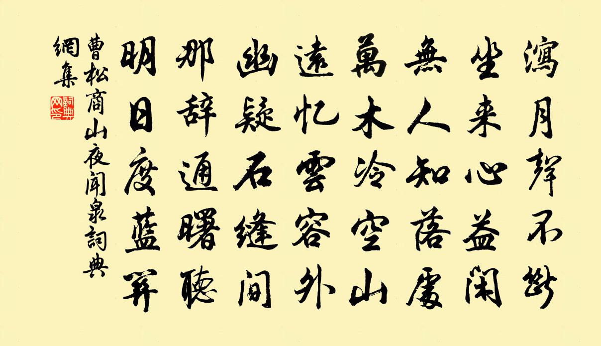 詩詞名句歷史字典書法欣賞書法字典國語詞典說文解字康熙字典古漢語字典標 題 作 者 詩 句 商山夜聞泉作者:曹松 朝代:唐代商山夜聞泉原文瀉月聲不斷,坐來心益閒。無人知落處,萬木冷空山。遠憶雲容外,幽疑石縫間。那辭通曙聽,明日度藍關。詩詞問答問:商山夜聞泉的作者是誰?答:曹松問:商山夜聞泉寫於哪個朝代?答:唐代問:商山夜聞泉是什麼體裁?答:五律曹松商山夜聞泉書法欣賞商山夜聞泉書法作品注釋全唐詩:卷716-12詩詞推薦九日三首蘇轍〔宋代〕解衣換村酒,酒薄不須嫌。節到勿空過,杯行且強拈。得閒身尚健,適意事難兼。醉臥南窗日,誰知酸與甜。水鶴齊己〔唐代〕鴛鴦與鸂鶒,相狎豈慚君。比雪還勝雪,同群亦出群。靜巢孤島月,寒夢九皋雲。歸路分明過,飛鳴即可聞。游俞氏庵次叔祖韻張鎡〔宋代〕青山穩處衲僧家,得趣應難向客夸。春砌浪生金鳳草,夏窗低映木龍花。安禪舊日參臨濟,照影新游愛水涯。酩酊滿江紅 示眾王玠〔元代〕一點性靈光,因性形降、來性居心竅。本玄玄幽微,朗朗晃耀。只為貪生多 * ,漸教習性忘真妙。算不如、直下道院雜興陸游〔宋代〕江上霜風吹角巾,東歸不獨為吳蓴。掃除長劍華纓夢,收拾孤颿短棹身。勾漏丹砂開灶晚,商顏芝草滿山春。東封題陳宗陽梅花全韻詩集王義山〔宋代〕騷經比興殆無遺,何獨於梅靳一辭。從遜以來方有司,到逋而後愈難詩。形容雖巧跡之淺,吟狀愈多天者漓。獨在游桓山會者十人以春水滿四澤夏雲多奇峰為韻蘇軾〔宋代〕東郊欲尋春,未見鶯花跡。春風在流水,鳧雁先拍拍。孤帆信溶漾,弄此半篙碧。艤舟桓山下,長嘯理輕策。彈琴法曲歌頭/法曲曹勛〔宋代〕柱史乘車,青牛駕軛,紫雲覆頂,函關令已前知。西升稍駐,尹喜虔恭誓。求老子。親談道德微旨。五千餘言,俱再游廬山三首蘇轍〔宋代〕當年五月訪廬山,山翠溪聲寢食間。藤杖復隨春色到,寒泉頓與客心閒。岩頭懸布煎茶足,峽口驚雷泛葉慳。待得杭州天竺、靈隱二寺頃歲亦布衣一游…追思為詩二首李紳〔唐代〕翠岩幽谷高低寺,十里松風碧嶂連。開盡春花芳草澗,遍通秋水月明泉。石文照日分霞壁,竹影侵雲拂暮煙。時有句張徽〔宋代〕雲蒸洞穴秋成雨,泉落庭除夏結冰。大用釋紹曇〔宋代〕二三四七惡機關,互逞辭鋒斗熱瞞。不必山僧一彈指,盡情貶向鐵圍山。柏林寺南望郎士元〔唐代〕溪上遙聞精舍鍾,泊舟微徑度深松。青山霽後雲猶在,畫出東南四五峰。雜感陸游〔宋代〕艱危寧度瘦驢嶺,奔走莫隨肥馬麈。困厄終身元自好,可憐痴子恨無津。婆羅門引·春盡夜夏完淳〔明代〕晚鴉飛去,一枝花影送黃昏。春歸不阻重門。辭卻江南三月,何處夢堪溫。更階前新綠,空鎖芳塵。隨風搖曳雲,柳梢青佚名〔宋代〕有個人人。海棠標韻,飛燕輕盈。酒暈潮紅,羞娥凝綠,一笑生春。為伊無限傷心。更說甚、巫山楚雲。斗帳香消錢塘八月潮陳允平〔宋代〕五丁椎碎爛銀堆,注作東南水一杯。秋半忽疑天外雪,夜深俄聽月中雷。大鵬擊浪驚龍臥,老蜃噓雲誤燕來。日日寄成父趙蕃〔宋代〕屢約過茅舍,終成覓順舟。書來勤問訊,病去苦淹留。邂逅行人往,丁寧藥物求。那知空悵望,直恐遂沈浮。籬菊端午感懷舒岳祥〔宋代〕曾飲昌陽七十三,老來大布當輕衫。豫儲當采三年艾,緩計空尋六日蟾。楚俗舊時沉黍恨,唐宮此日賜衣沾。梔香卜運算元(中秋前一日和昌甫所寄)韓淲〔宋代〕一雨已秋深,月色寒而靜。夜半披衣草樹間,玉露團清影。長笛倚樓聲,聽徹還重省。手啟柴門倦復關,雲臥衣裳名句推薦賈傳自憐多感慨,東門何意泥孤虛。王惲《送姬仲實隱士北還》 雁聚河流濁,羊群磧草膻。齊己《送人游塞》 他人有心,予忖度之。佚名《巧言》 故人應念,杜鵑枝上殘月。文天祥《酹江月·和友驛中言別》 烈士暮年,壯心不已。曹操《龜雖壽》 慷慨惟平生,俯仰獨悲傷。陸機《門有車馬客行》 凡與敵戰,若有形勢便利之處,宜爭先據之,以戰則勝。佚名《百戰奇略·第四卷·爭戰》 秋風吹到江村,正黃昏,寂寞梧桐夜雨不開門。顧彩《相見歡·秋風吹到江村》 自重者然後人重,人輕者便是自輕。佚名《增廣賢文·下集》 天秋月又滿,城闕夜千重。戴叔倫《客夜與故人偶集 / 江鄉故人偶集客舍》