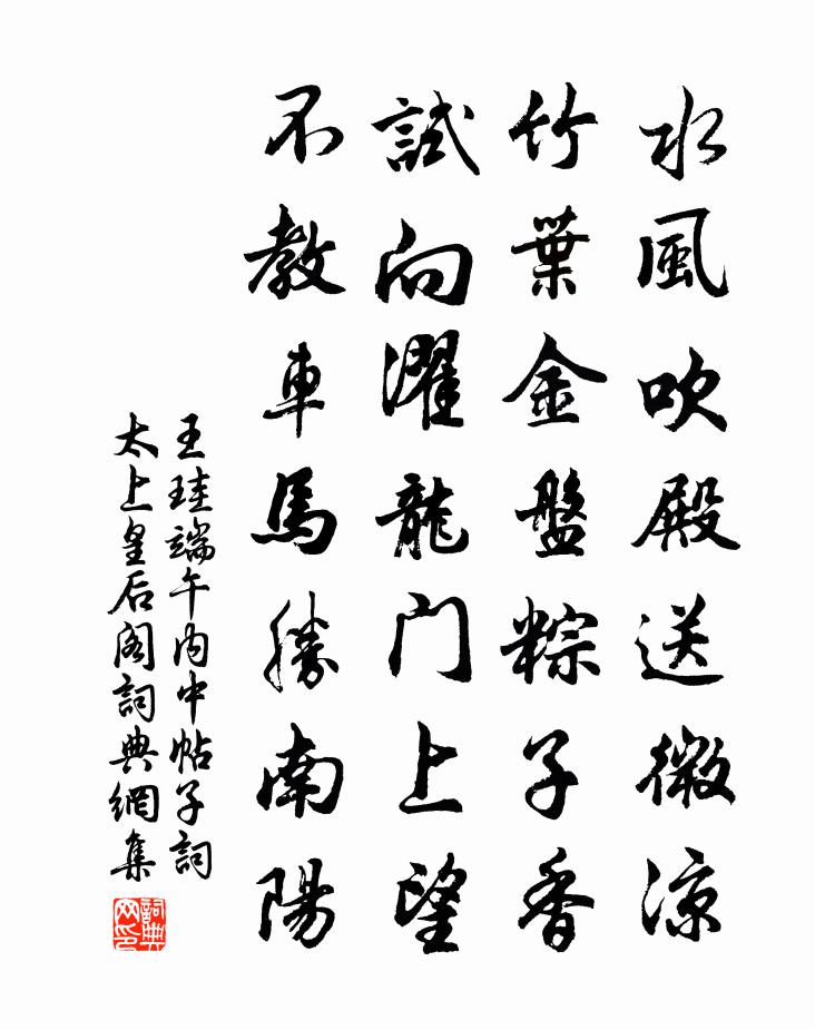 詩詞名句歷史字典書法欣賞書法字典國語詞典說文解字康熙字典古漢語字典標 題 作 者 詩 句 端午內中帖子詞太上皇后閣作者:王珪 朝代:唐代端午內中帖子詞太上皇后閣原文水風吹殿送微涼,竹葉金盤粽子香。試向濯龍門上望,不教車馬勝南陽。詩詞問答問:端午內中帖子詞太上皇后閣的作者是誰?答:王珪問:端午內中帖子詞太上皇后閣寫於哪個朝代?答:唐代王珪端午內中帖子詞太上皇后閣書法欣賞端午內中帖子詞太上皇后閣書法作品詩詞推薦省中和何子溫見寄洪咨夔〔宋代〕東風婉娩燕來雙,禁漏無聲萬綠香。寶鴨炷雲朝太紫,玉蜍挹露校鉛黃。聖賢不斷千年脈,宇宙長存一點光。老鶴次王帥韻後詩呈葉教授陳造〔宋代〕業履冰壺器鏌邪,元戎韜略況儒家。功名自昔須橫草,南北於今賴灌瓜。村墅稻田黃罷亞,塞垣榆樹老丫叉。為公次韻記馬耳峰舊遊舒岳祥〔宋代〕牙軸珠聯秘簽滕,曉窗開卷見詩朋。曲渠荷葦鳴新雨,深院茶梅響落冰。山市雪晴邀試酒,溪橋月好近燒燈。玉泓壬申十二月二十八夜雷王炎〔宋代〕殘臘方淫雨,中宵忽怒雷。更長頻展轉,夢斷但驚猜。凍雪何時解,春風幾日來。龍蛇今在蟄,墐戶不宜開。祭酒芮公既歿四年門人呂某始以十詩哭之呂祖謙〔宋代〕聞人有善己伸眉,倒廩傾囷更不疑。菶菶萋萋竟何許,卷阿空老鳳皇枝。右史殿撰吳之平挽章二首曹彥約〔宋代〕生長均江左,游從集豫章。官曹推掃溉,人望極軒昂。讜論暌違後,休聲涕淚傍。鳳池綸綍手,揮翰發幽光。揚州送別薛廷玉〔宋代〕匹馬揚州路,香開幾樹花。春光無揀擇,淮池亦繁華。日沸長江水,風昏古戰沙。爭雄舊時事,君去莫思家。登姑蘇台李嘯軒〔宋代〕規模高敞俯城池,未必斯台是故基。風月只招人感慨,江山不管國興衰。幾年勾踐仇思復,終日吳王醉不知。卻使謝潘端叔惠紅梅樓鑰〔宋代〕前身施粉忌太白,今日施朱恐太紅。說似旁人剛不信,清香萬斛在花中。黎陽作詩曹丕〔魏晉〕朝發鄴城。夕宿韓陵。霖雨載塗。輿人困窮。載馳載驅。沐雨櫛風。舍我高殿。何為泥中。在昔周武。爰暨公旦。送山甫李覯〔宋代〕喜爾年將壯,為儒志可嘉。鄉閭知行實,場屋見辭華。公道方無{上雍下土},君門況不遐。直應千里足,世世出訪自牧上人不遇齊己〔唐代〕然諾竟如何,諸侯見重多。高房度江雨,經月長寒莎。道本同騷雅,書曾到薜蘿。相尋未相見,危閣望滄波。奉賦德修西充大夫成都新園詠歸堂二首葉適〔宋代〕我生海旁州,古言江來鋪。力浮萬頃盡,坐識一溜初。之子酌彼源,紺潔玉斗奭。雅韻舒煩憂,逸駕陵趦趄。詠歸贈臨汝曾醫士史彌寧〔宋代〕有客譚醫驚四座,指下玄微應識破。藥市棲遲三十年,安知不是伯休那。挽高宗皇帝詞喻良能〔宋代〕天地重開闢,民人拱德馨。奎文贊元聖,宸翰列群經。禮樂盈三紀,光華亞九齡。龍髯攀莫及,臣子涕交零。小苑春望宮池柳色張季略〔唐代〕韶光歸漢苑,柳色發春城。半見離宮出,才分遠水明。青蔥當淑景,隱映媚新晴。積翠煙初合,微黃葉未生。迎春撫州城外作趙蕃〔宋代〕城中一雨僅飄灑,城外此雨乃霈滂。分龍古語信不妄,不爾惠施何偏方。我行驅車一何忙,早起猶乘昨夜涼。舊聞挽永康守成寺簿同年二首程公許〔宋代〕友愛根天性,今人古與俱。棣華雖殄瘁,玉樹更扶疏。經濟終齎恨,循良誰讀書。茲恩共心賞,霜月淚沾裾。齡叟招飲醉中陳著〔宋代〕一笠出雲深,因緣坐到今。寺窮僧自飯,山古樹方林。借酒看人醉,燒香駐客吟。相攜不覺笑,門外少知心。八聲甘州(壬子餞帥機沈好問)李曾伯〔宋代〕正蓴鱸佳夢繞吳鄉,牙檣忍輕離。向仲宣樓上,憑高舉酒,幾共燈棋。曾記少陵留詠,出幕合持麾。飛蓋長安去,名句推薦元宵佳節,融和天氣,次第豈無風雨。李清照《永遇樂·落日熔金》 年年郡縣送征人,將與遼東作丘坂。王建《遼東行》 窣地春袍,嫩色宜相照。梅堯臣《蘇幕遮·草》 不忍登高臨遠,望故鄉渺邈,歸思難收。柳永《八聲甘州·對瀟瀟暮雨灑江天》 秋風起兮白雲飛,草木黃落兮雁南歸。劉徹《秋風辭》 一往情深深幾許?深山夕照深秋雨。納蘭性德《蝶戀花·出塞》 江碧鳥逾白,山青花欲燃。杜甫《絕句二首》 獨抱濃愁無好夢,夜闌猶剪燈花弄。李清照《蝶戀花·暖雨晴風初破凍》 不是暗塵明月,那時元夜。蔣捷《女冠子·元夕》 千古興亡多少事?悠悠。不盡長江滾滾流。辛棄疾《南鄉子·登京口北固亭有懷》