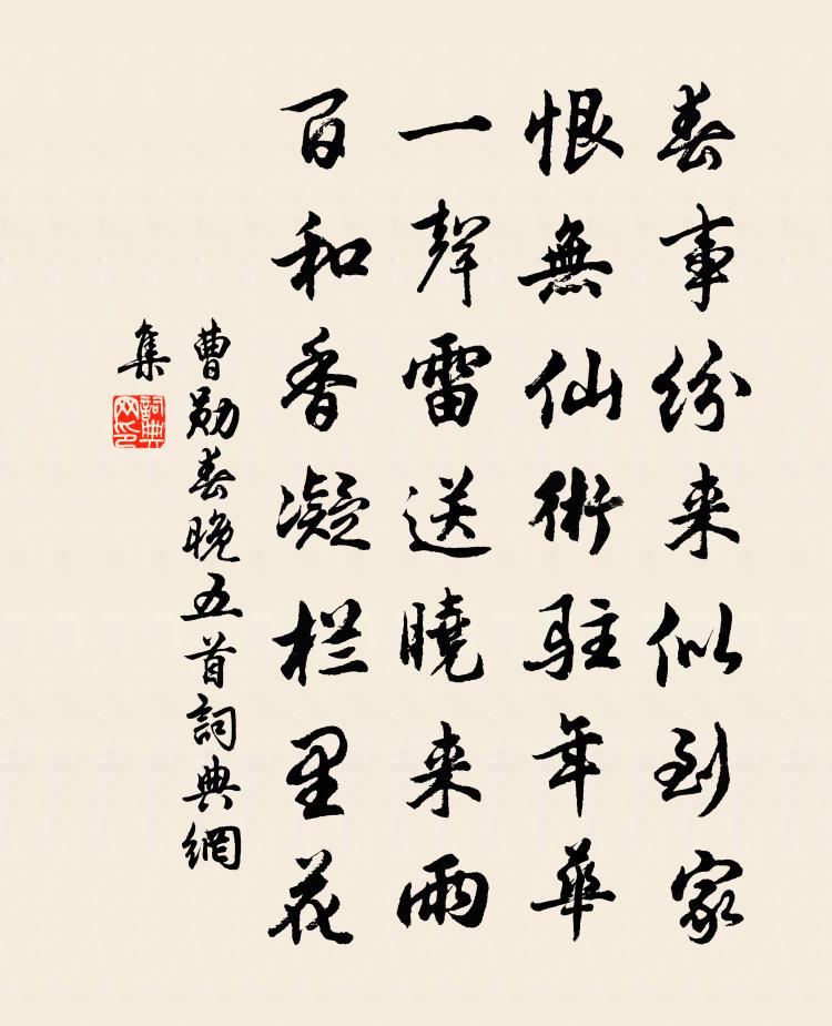 詩詞名句歷史字典書法欣賞書法字典國語詞典說文解字康熙字典古漢語字典標 題 作 者 詩 句 春晚五首作者:曹勛 朝代:宋代春晚五首原文春事紛來似到家,恨無仙術駐年華。一聲雷送曉來雨,百和香凝欄里花。詩詞問答問:春晚五首的作者是誰?答:曹勛問:春晚五首寫於哪個朝代?答:宋代曹勛春晚五首書法欣賞春晚五首書法作品詩詞推薦寄盧式項斯〔唐代〕到處久南望,未知何日回。寄書頻到海,得夢忽聞雷。嶺日當秋暗,蠻花近臘開。白身居瘴癘,誰不惜君才。秋晚雜書三十首方回〔宋代〕周誥惡沈湎,禮設萍氏禁。愚夫或敗德,賢者故克敬。上有朝廷燕,下有鄉黨飲。倍食與無算,豈聞起酗競。但此泊崇德縣曉作方回〔宋代〕岸上馬蹄響,縣中更鼓清。篷背雨亦止,意當明旦晴。夢記所泊處,喬木枯崢嶸。天色果開否,浩浩惟風聲。篙師時賢有爵高名重而不自由者再念閒居這可樂為張鎡〔宋代〕多幸因愚得養恬,林扃風變陡寒天。杯傳蕉葉溫成酒,襖織梅花軟入綿。經室爐添羊脛炭,道床屏護鷓斑煙。遙思次韻子瞻病中贈提刑段繹蘇轍〔宋代〕京東分東西,中劃齊魯半。兄來本相從,路絕一長嘆。前朝使者還,手把新詩玩。憐我久別離,卷帙為舒散。誰言沈十四拾遺新竹生讀經處同諸公之作王維〔唐代〕閒居日清靜,修竹自檀欒。嫩節留餘籜,新業出舊闌。細枝風響亂,疏影月光寒。樂府裁龍笛,漁家伐釣竿。何如初春夙興宋庠〔宋代〕戍城官柝應營笳,愁枕無眠感曙鴉。料峭風頭猶助凍,蒼涼天角欲成霞。離離弈局殘星墜,脈脈刀環片月斜。尚喜登總持閣岑參〔唐代〕高閣逼諸天,登臨近日邊。晴開萬井樹,愁看五陵煙。檻外低秦嶺,窗中小渭川。早知清淨理,常願奉金仙。法華院僧祖月寫余真戲贊周必大〔宋代〕老子七十七,到處遮人壁。住世更十年,化身千百億。雜曲歌辭。古離別二首孟郊〔唐代〕松山雲繚繞,萍路水分離。雲去有歸日,水分無合時。春芳役雙眼,春色柔四支。楊柳織別愁,千條萬條絲。山川壬子歲旱強至〔宋代〕熙寧歲壬子,春旱初可怪。不雨訖夏尾,天地一爐鞴。赤日裂厚土,黃埃沒經界。農夫望雲霓,脰折意未懈。侍中雙峰二偈樓鑰〔宋代〕道非身外亦非中,左右逢原作麽逢。繞寺尋山無好處,不知門外有雙峰。和龔翠岩雨中述懷韻陳深〔宋代〕風流翰墨傅千古,議論文章自一家。靜愛雲林披白苧,懶趙閨闔草黃麻。江山故國閒停櫂,風雨僧窗自淪茶。甚欲四日夜雞未鳴起作陸游〔宋代〕放翁病過秋,忽起作醉墨。正如久蟄龍,青天飛霹靂。雖雲墮怪奇,要勝常憫默。一朝此翁死,千金求不得。句劉接〔宋代〕獵叟藤編戶,傜人草結庵。物我李復〔宋代〕萬物生芸芸,與我本同氣。氤氳隨所感,形體偶然異。丘岳孰為高,塵粒孰為細。忘物亦忘我,優遊河所覬。岳陽樓江為〔唐代〕倚樓高望極,展轉念前途。晚葉紅殘楚,秋江碧入吳。雲中來雁急,天末去帆孤。明月誰同我,悠悠上帝都。宿猿洞和程師孟韻張徽〔宋代〕日上高台雲半屏,洞門休喚夕陽扃。巍冠不整跏趺坐,秋楮斕斑數點星。山居雜詩九十首曹勛〔宋代〕造化致有生,旋亦致凋瘁。草木方薿薿,枝葉忽靡靡。初發白玉滌,接以赤日熾。末為飈風吹,從是即委翳。朝中措(月季)趙師俠〔宋代〕開隨律琯度芳辰。鮮艷見天真。不比浮花浪蕊,天教月月常新。薔薇顏色,玫瑰態度,寶相精神。休數歲時月季,名句推薦人不見,春在綠蕪中。祖可《小重山·誰向江頭遺恨濃》 東風夜放花千樹。更吹落、星如雨。辛棄疾《青玉案·元夕》 江村獨歸處,寂寞養殘生。杜甫《奉濟驛重送嚴公四韻》 青蒲銜紫茸,長葉復從風。佚名《拔蒲二首》 黃衫飛白馬,日日青樓下。陳克《菩薩蠻·赤闌橋盡香街直》 不茶不飯,不言不語,一味供他憔悴。蜀妓《鵲橋仙·說盟說誓》 謂學不暇者,雖暇亦不能學矣。劉安及其門客《淮南子·說山訓》 富貴易生禍端,必忠厚謙恭,才無大患王永彬《圍爐夜話·第六三則》 爭渡,爭渡,驚起一灘鷗鷺。李清照《如夢令·常記溪亭日暮》 夕陽西下,斷腸人在天涯。馬致遠《天淨沙·秋思》