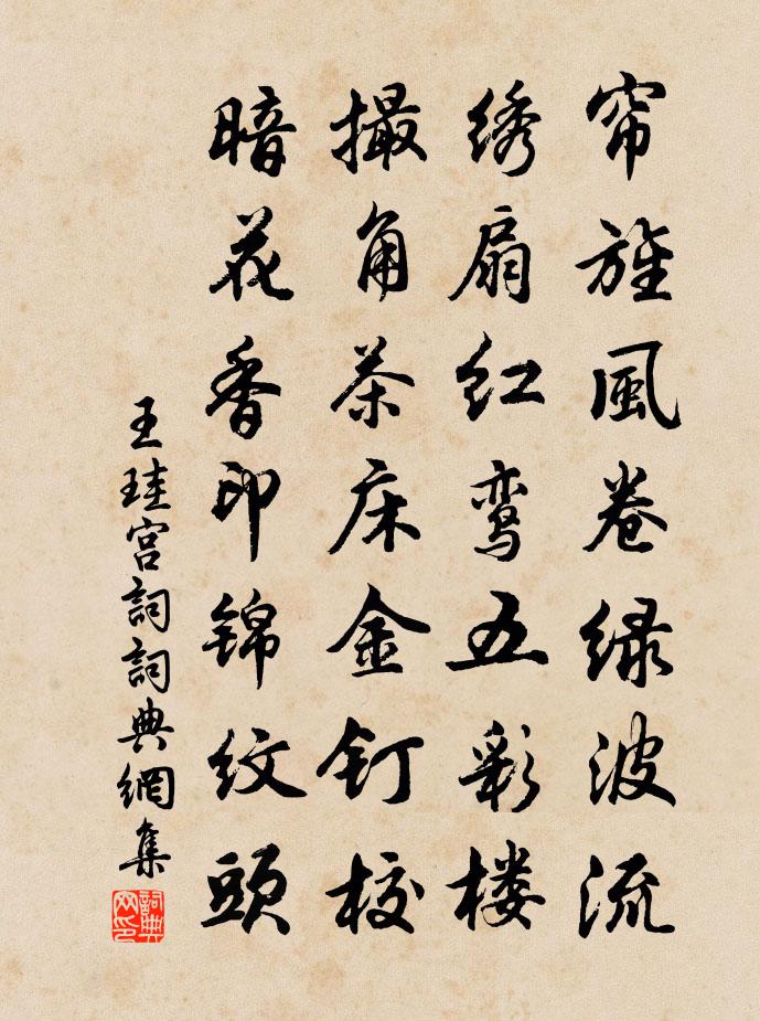 詩詞名句歷史字典書法欣賞書法字典國語詞典說文解字康熙字典古漢語字典標 題 作 者 詩 句 宮詞作者:王珪 朝代:唐代宮詞原文簾旌風卷綠波流,繡扇紅鸞五彩樓。撮角茶床金釘校,暗花香印錦紋頭。詩詞問答問:宮詞的作者是誰?答:王珪問:宮詞寫於哪個朝代?答:唐代王珪宮詞書法欣賞宮詞書法作品詩詞推薦無淮和尚贊釋智朋〔宋代〕奪身鐵色,飛崖倒戈,欠蹄少角。得聵翁之聰而震忽雷,乘雲巢之雲而撒巨雹。遠若可親,邇而逾邈。拈死柴頭,挽師步理牟巘五〔宋代〕卓爾見成鐻,超然驚絕塵。形骸脫邊幅,肝膈炯精神。正自關天分,應難語俗人。誰收身後稿,雋逸更清新。同友人尋澗花白居易〔唐代〕聞有澗底花,貰得村中酒。與君來校遲,已逢搖落後。臨觴有遺恨,悵望空溪口。記取花發時,期君重攜手。我生嘆葵花戴叔倫〔唐代〕今日見花落,明日見花開。花開能向日,花落委蒼苔。自不同凡卉,看時幾日回。縣舍不種花惟栽楠木冬青茶竹之類因戲書七言歐陽修〔宋代〕結綬當年仕兩京,自憐年少體猶輕。伊川洛浦尋芳◇,魏紫姚黃照眼明。客思病來生白髮,山城春至少紅英。芳叢詠史上伏生陳普〔宋代〕睢陽東苑三百里,中山後宮三百人。漢家制度無窮極,僅有寬仁不是秦。病起始浴二首曾幾〔宋代〕無數塵埃一病身,不蒙湔拂幾經旬。政須皁莢相料理,可笑梁州陰子春。池上雙鳥薛濤〔唐代〕雙棲綠池上,朝暮共飛還。更憶將雛日,同心蓮葉間。如夢令吳潛〔宋代〕昨日春衫初試。今日春寒猶殢。待得晚風收,獨上危樓閒倚。閒倚。閒倚。目斷半空煙水。拾得磨墨贊釋紹曇〔宋代〕麵皮頑惡發須忪,磨墨元來也不中。冷看他人書淡字,不知污得布裙濃。百子池張諤〔唐代〕舊聞百子漢家池,漢家淥水今逶迤。宮女厭鏡笑窺池,身前影后不相見,無數容華空自知。廢井梅堯臣〔宋代〕陻廢不知年,石欄蒼蘚澀。渴心空自煩,長綆曾誰汲。無復語滄波,坎蛙奚所及。哭裘司直劉克莊〔宋代〕築室西山下,孤標未易親。長閒如野鶴,偶出似祥麟。屬者陪髦士,嗟呼瘞玉人。北風吹老淚,空滴暮江濱。天申節致語口號陸游〔宋代〕嘉會千齡豈易逢,珮聲俱集未央宮。九重鳳闕曈曨日,百尺龍旗掩苒風。奇瑞屢書圖牒上,太平長在詠歌中。區區夢中賦裙帶蘇軾〔宋代〕百疊漪漪風皺,六銖縱縱雲輕。植立含風廣殿,微聞環佩搖聲。【黃鐘】紅錦袍徐再思〔元代〕那老子愛清閒主意別,釣桐江江上雪,泛桐江江上月。君王想念者;宣到鳳凰闕。想著七里漁灘,將著一鉤香餌,追憶王詹事何知錄喻良能〔宋代〕平生師友子王子,四海襟期錄事君。白髮紅顏俱異物,高山流水欲誰聞。飲良翁宮教新第二首劉克莊〔宋代〕負郭依山遠市廛,高宜台榭下宜田。徑當外膏從盤谷,似向丹青見輞川。別墅暮年□□□,□□□□□南遷。與君有翅天馬圖牟巘五〔宋代〕何年塵鏡昏乍洗,金背湧出差主怪詭。自古空言馬生角,今乃見馬生兩翅。恐是渥窪種,往往感龍氣。龍惟神,飛同賦龍沙墅戴叔倫〔唐代〕迴轉沙岸近,欹斜林嶺重。因君訪遺蹟,此日見真龍。名句推薦黃昏院落,淒悽惶惶,酒醒時往事愁腸。李清照《行香子·天與秋光》 子胥既棄吳江上,屈原終投湘水濱。李白《行路難三首》 祖宗雖遠,祭祀不可不誠;子孫雖愚,經書不可不讀。朱柏廬《朱子家訓·全文》 縱被無情棄,不能羞。韋莊《思帝鄉·春日游》 銜霜當路發,映雪擬寒開。何遜《詠早梅 / 揚州法曹梅花盛開》 親戚或余悲,他人亦已歌。陶淵明《擬輓歌辭三首》 舍其所爭,取其所棄,不亦君子乎?王通《中說·卷四·事君篇》 松下問童子,言師採藥去。賈島《尋隱者不遇 / 孫革訪羊尊師詩》 因依老宿發心初,半學修心半讀書。王建《寄舊山僧》 秋陰不散霜飛晚,留得枯荷聽雨聲。李商隱《宿駱氏亭寄懷崔雍崔袞》