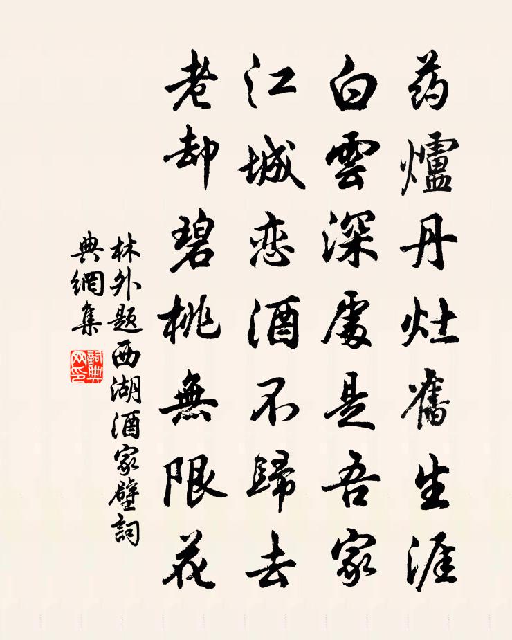 詩詞名句歷史字典書法欣賞書法字典國語詞典說文解字康熙字典古漢語字典標 題 作 者 詩 句 題西湖酒家壁作者:林外 朝代:宋代題西湖酒家壁原文藥爐丹灶舊生涯,白雲深處是吾家。江城戀酒不歸去,老卻碧桃無限花。詩詞問答問:題西湖酒家壁的作者是誰?答:林外問:題西湖酒家壁寫於哪個朝代?答:宋代林外題西湖酒家壁書法欣賞題西湖酒家壁書法作品詩詞推薦慶充自黃山歸,索其道中詩,書一絕問之范成大〔宋代〕鳴騶如電馬如雷,知是婆娑醉尉回。常日錦囊猶有句,況從三十六峰來。江夏八詠賀鑄〔宋代〕祖龍礪長劍,昔道此南巡。徒挾雄鋩利,湘川奈水神。頌古二十一首釋鼎需〔宋代〕堪笑當年陸大夫,獨夸身外更無餘,不因指出花如夢,爭得雙眸翳盡除。失題胡仲弓〔宋代〕年來古道不堪行,盡避君廚俊傑名。莫枉錐刀鞭算手,且調金石擊撞聲。和米芾越竹紙詩薛紹彭〔宋代〕書便瑩滑如碑版,古來精紙惟聞繭。杵成剡竹光凌亂,何用區區書素練。細分濃淡可評墨,副以溪岩難乏硯。世間古泉驛張說〔唐代〕昔聞陳仲子,守義辭三公。身賃妻織屨,樂亦在其中。豈無窮賤苦,羞與傾巧同。長白臨河上,於陵入濟東。我行次韻謝王君方回〔宋代〕妙年富才藻,亹亹迫淵雲。逸勢波瀾闊,神功混沌分。百為爭細故,一笑付微醺。天地江河在,終垂萬古文。夏日聯句李昂〔唐代〕人皆苦炎熱,我愛夏日長。——李昂薰風自南來,殿閣生微涼。——柳公權和姚正字用趙信庵韻題召星館劉黻〔宋代〕朔風吹客上江西,歷遍山厓與石溪。野鳥不知言有禍,晚窗猶自向人啼。都下呈叔表兄項安世〔宋代〕相望五千里,話別十三年。知我到江左,煩兄來日邊。朋游俱健否,鬚髮已卷然。共說兒童事,分明在目前。春日雜詠九首李彌遜〔宋代〕懶慢嵇中散,寬閒得自怡。抱衾長恨晚,倒屐不嫌遲。網日蛛絲掛,梳煙柳發垂。朝來被花惱,浪走習家池。官舍胸有鸂鶒遺二宣二首蘇轍〔宋代〕半畝清池藻荇香,一雙鸂鶒競悠揚。來從碧澗巢安在,飛過重城母自將。野鳥似非官舍物,宰君昔是釣魚郎。直言洗馬池楊備〔宋代〕一一牽來種是龍,臨深欲下更嘶風。金鞍玉勒拋何處,騰踏渥窪寒影中。春暮劉克莊〔宋代〕一畝青苔半落英,蜂忙蝶懶互卿卿。燕泥乾後兒初落,魚尾輕時子遍成。閒拂午窗驚野馬,夢遊天竺聽華鯨。舍南次韻陳履常張公龍潭蘇軾〔宋代〕經明宣城宰,家此百尺瀾。鄭翁不量力,敢以非意乾。玄黃雜兩戰,絳青表雙蟠。(事見《龍公碑》。)烈氣斃強偶題喻良能〔宋代〕少陵五十六,負暄候樵牧。我今年與齊,而亦處幽獨。小亭數椽淨,新月半鉤曲。聊將萬斛愁,付與一杯綠。雜曲歌辭。悲哉行孟雲卿〔唐代〕孤兒去慈親,遠客喪主人。莫吟苦辛曲,此曲誰忍聞。可聞不可說,去去無期別。行人念前程,不待參辰沒。朝亦提刑勸農使者還嘉州宋祁〔宋代〕案部聊北征,肅舲復東下。江溜澹泱泱,檣烏紛雅雅。離醑不餘杯,征棹亟沿洄。還岫隨時見,幽花無候開。清氛秋日山中王梅窗〔宋代〕客疏吟友少,終日掩柴門。冒雨自分菊,帶泥移上盆。泉添渾井脈,砧響動山根。片片西風葉,飛來有病添。三次韻答江西美周必大〔宋代〕菲飲簞壺食與漿,淡交非復世炎涼。佳名誰合戎州綠,妙語端由太史黃。無怨不須移孔議,有情未可老徐娘。荷香名句推薦素娥無賴,西去曾不為人留。蘇轍《水調歌頭·徐州中秋》 春透水波明,寒峭花枝瘦。秦湛《卜運算元·春情》 望極春愁,黯黯生天際。柳永《蝶戀花·佇倚危樓風細細》 櫪馬苦踡跼,籠禽念遐征。張九齡《秋晚登樓望南江入始興郡路》 楚江湄,湘娥乍見,無言灑清淚周密《繡鸞鳳花犯·賦水仙》 至若救渴,飲之以漿;蠲憂忿,飲之以酒;盪昏寐,飲之以茶。陸羽《茶經·六之飲》 客思似楊柳,春風千萬條。王安石《壬辰寒食》 我有三寶,持而保之。一曰慈,二曰儉,三曰不敢為天下先。老子《老子·德經·第六十七章》 何處營巢夏將半,茅檐煙里語雙雙。杜牧《村舍燕》 今夫飛蓬遇飄風而行千里,乘風之勢也。商鞅《商君書·禁使》