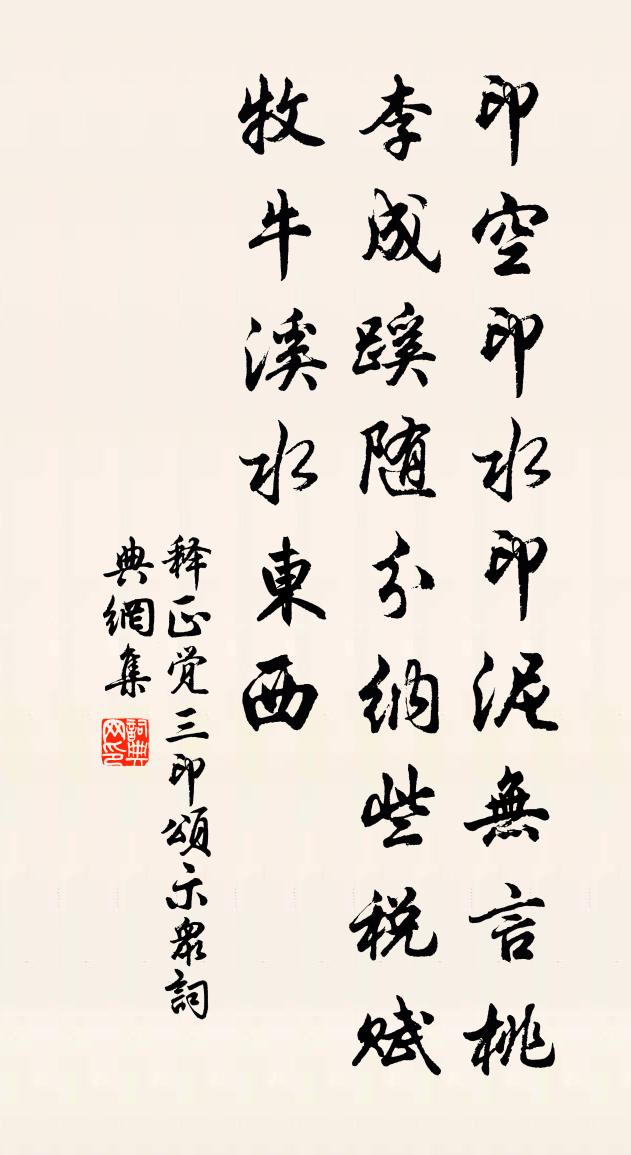 詩詞名句歷史字典書法欣賞書法字典國語詞典說文解字康熙字典古漢語字典標 題 作 者 詩 句 三印頌示眾作者:釋正覺 朝代:宋代三印頌示眾原文印空印水印泥,無言桃李成蹊。隨分納些稅賦,牧牛溪水東西。詩詞問答問:三印頌示眾的作者是誰?答:釋正覺問:三印頌示眾寫於哪個朝代?答:宋代釋正覺三印頌示眾書法欣賞三印頌示眾書法作品詩詞推薦紹興祀大火十二首佚名〔宋代〕[姑洗為羽]於赫我宋,以火德王。永永丕圖,翳神之相。神之來矣,維其時矣。禮備樂奏,神其如矣。久不到流惠楊至之相訪邀游楊以乾亟歸因呈之陳宓〔宋代〕眾峰奇秀四圍旁,擁出千尋月樣塘。只鷺雙鳧自來往,圓荷細草競高長。密雲帶雨天應近,晚照酣春水自香。幸有沁園春(庚寅為親庭壽)李曾伯〔宋代〕鴻禧主人,一閒半年,未嘗厭閒。謂有溪可釣,有田可秣,有蘭堪佩,有菊堪餐。羽檄秋風,胡笳夜月,多少勛名養疾釋智圓〔宋代〕深院無人疾漸輕,西風黃葉滿閒庭。行披老子五千字,坐讀楞嚴十軸經。籬下清香寒有菊,窗間微影夜無螢。誰知春日江村五首杜甫〔唐代〕農務村村急,春流岸岸深。乾坤萬里眼,時序百年心。茅屋還堪賦,桃源自可尋。艱難賤生理,飄泊到如今。迢遞送王深道歸黃岩雲霞居並簡李微之周子靖吳毅劉宰〔宋代〕之子云霞居,地隔千萬山。三年三過我,一見一開顏。袖出西遊編,字字破天慳。可憐東門享,不及海上閒。後會頌證道歌證道歌釋印肅〔宋代〕有無俱遣不空空,空本無空針不容。阿彌陀佛真金色,相好無邊我等同。奉酬韋祭酒嗣立偶游龍門北溪忽懷驪山別業呈諸留守之作張說〔唐代〕石澗泉虛落,松崖路曲回。聞君北溪下,想像南山隈。近念鼎湖別,遙思雲嶂陪。不同奇覯往,空睹斯文來。歲後少年行四首令狐楚〔唐代〕少小邊州慣放狂,驏騎蕃馬射黃羊。如今年老無筋力,猶倚營門數雁行。家本清河住五城,須憑弓箭得功名。等閒赴連州途經洛陽諸公置酒相送張員外賈…率爾酬之劉禹錫〔唐代〕謫在三湘最遠州,邊鴻不到水南流。如今暫寄樽前笑,明日辭君步步愁。一落索(九日)方岳〔宋代〕瘦得黃花能小。一簾香杳。東籬雲冷正愁予,猶幸是、西風少。葉下亭皋渺渺。秋何為者。無錢持蟹對黃花,又孤送高景仁之廣德連文鳳〔宋代〕不愁離別難,江浙片雲間,黃葉晚秋徑,白茅深處山。有詩連夢遠,無累得身間。若遇西風便,安書寄雁還。沁園春 泉南初度,伯時將北歸,諸友宴次,張翥〔元代〕天上玉堂,海外瀛洲,山中蛻岩。甚六十四歲,出持使節,八千餘里,來駐征驂。香火緣深,功名意薄,夢覺仙家依御史溫飛卿華清宮二十二韻徐夤〔唐代〕地靈蒸水暖,天氣待宸游。岳拱蓮花秀,峰高玉蕊秋。朝元雕翠閣,乞巧繡瓊樓。碧海供驪嶺,黃金絡馬頭。五王題義門胡氏華林書院宋琪〔宋代〕賢良肄業文方盛,孝友傳家族更豪。旌表特恩門第貴,御書新賜姓名高。謀孫有後榮非數,待士無疏眾豈勞。我想明月篇贈張文潛黃庭堅〔宋代〕天地具美兮生此明月,升白虹兮貫朝日。工師告余曰斯不可以為佩,棄捐櫝中兮三歲不會。霜露下兮百草休,抱此正仲有詩因次和再別舒岳祥〔宋代〕好客分明為我來,不嫌茅舍似雞棲。歸雲古樹如新畫,久雨蒼崖失舊題。別我此行正月盡,懷君老眼兩行啼。丈夫醵飲劉園趙汝鐩〔宋代〕隨意攜盤饌,毋煩事禮文。燕飛沖幕過,鶯語隔牆聞。興自樽前發,韻從花下分。詩成似供課,醉墨競紛紜。和李致政花石山詩魏了翁〔宋代〕春風挽征衣,淑景薦蓮實。山中之奇觀,變態紛襞積。或劃然以舒,或蒙然以密。或嫵如修眉,或突如巨跡。或鷙巫山高曹勛〔宋代〕巫山高,望不極。飛鴻欲度愁無力,我欲絕之乏羽翼。峽江水急荊門遠,魚龍游之不能轉。下無舟楫上無梁,我欲名句推薦刻薄成家,理無久享;倫常乖舛,立見消亡。朱柏廬《朱子家訓·全文》 殘燈孤枕夢,輕浪五更風。徐昌圖《臨江仙·飲散離亭西去》 望斷金馬門,勞歌采樵路。孟浩然《田園作》 日落君山雲氣,春到沅湘草木,遠思渺難收。張孝祥《水調歌頭·過岳陽樓作》 東風有信無人見,露微意、柳際花邊。蘇軾《一叢花·今年春淺侵年》 富貴非榮,富貴而利濟於世者為榮。王永彬《圍爐夜話·第三一則》 使能,國之利也。左丘明《左傳·文公·文公六年》 君子贈人以言,庶人贈人以財。荀子《荀子·大略》 君為女蘿草,妾作菟絲花。李白《古意》 日習則學不忘,自勉則身不墮徐幹《中論·上卷·治學》
