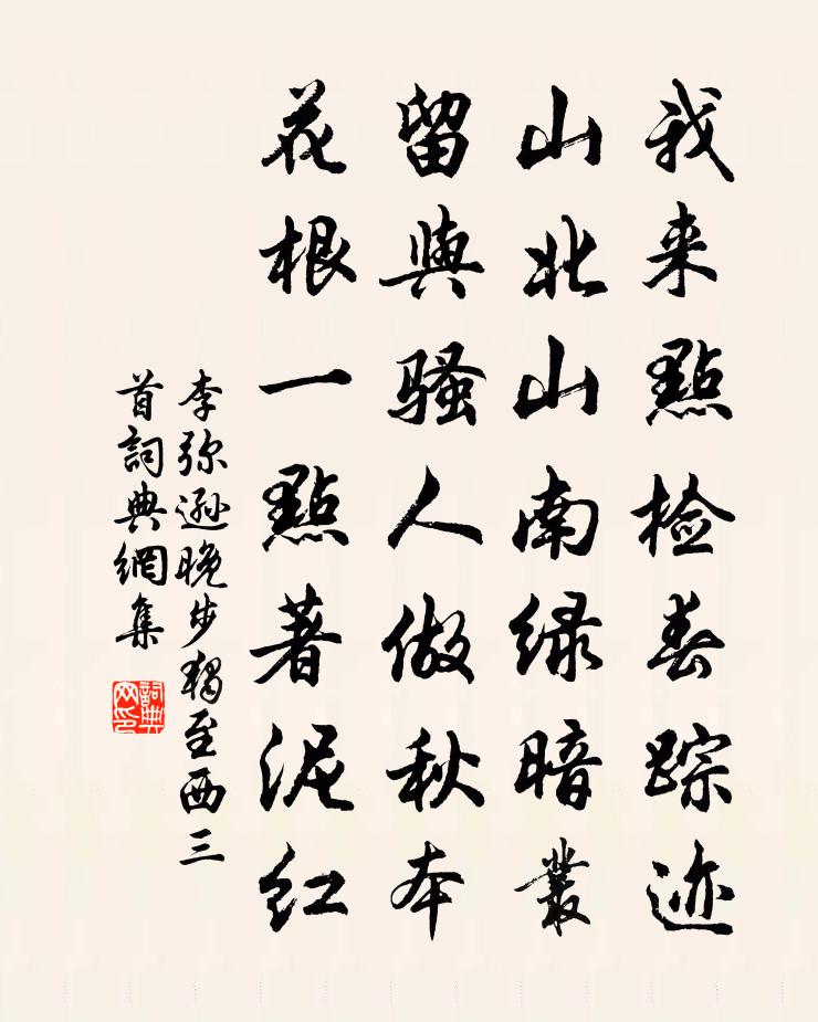 詩詞名句歷史字典書法欣賞書法字典國語詞典說文解字康熙字典古漢語字典標 題 作 者 詩 句 晚步獨至西三首作者:李彌遜 朝代:宋代晚步獨至西三首原文我來點檢春蹤跡,山北山南綠暗叢。留與騷人做秋本,花根一點著泥紅。詩詞問答問:晚步獨至西三首的作者是誰?答:李彌遜問:晚步獨至西三首寫於哪個朝代?答:宋代李彌遜晚步獨至西三首書法欣賞晚步獨至西三首書法作品詩詞推薦十二月二十七日病起行花下聞春禽有感舒岳祥〔宋代〕昨日立春節,今晨春鳥鳴。前峰宿蒼靄,風聲和且平。南翁病來久,起繞花枝行。花枝向人笑,婉孌感幽情。摩挲朝中措(月季)趙師俠〔宋代〕開隨律琯度芳辰。鮮艷見天真。不比浮花浪蕊,天教月月常新。薔薇顏色,玫瑰態度,寶相精神。休數歲時月季,戀香衾呂渭老〔宋代〕記花得花陰同花攜手,指花定日、許花我同歡。喚做真成,耳熱心安。打疊從來不成器,待做個、平地神仙。又卻眼兒媚(南叔兄生日用前韻五月六日)魏了翁〔宋代〕不居上界列仙班。梅隱寄幽閒。玉堂雲曉,玉珍雨夜,總是真歡。如兄才譽居人上,鵬路正看看。只祈兄弟,長隨旅中思家王炎〔宋代〕野田既雨水皆滿,山路無風花自香。且復將身供世事,也能隨處對春光。絕嫌俗物眼多白,未辦生涯髯已蒼。待看有感吳芾〔宋代〕自度吾生不久長,老懷猶自愛風光。春來扶杖觀花急,夏到穿林看筍忙。無限故人成鬼錄,幾多逐客寓他鄉。我今唐封泰山樂章。凱和佚名〔唐代〕烈祖順三靈,文宗威四海。黃鉞誅群盜,朱旗掃多罪。戢兵天下安,約法人心改。大哉乾羽意,長見風雲在。春詞毛滂〔宋代〕日射觚稜氣鬱蔥,露華猶冷玉芙蓉。瑣窗朱戶春光暖,珠蕊瓊花無數重。送沙學正歸松江王冕〔元代〕范蠡岩前雲似錦,吳松江上水如天。送君去去青霄近,老我蕭蕭白髮懸。楊柳風清千里夢,梅花雪落五更船。對人游茶山廣教寺趙蕃〔宋代〕在昔鴻漸宅,當年東野詩。兩賢雖可象,二士豈難追。汩汩泉鳴谷,青青竹守墀。平生志獨往,晚歲敢乖期。溪村朱繼芳〔宋代〕櫸柳正當官道,漁舟偏系柴門。今年春水深淺,看取層層岸痕。送人出塞楊凝〔唐代〕北風吹雨雪,舉目已淒淒。戰鬼秋頻哭,征鴻夜不棲。沙平關路直,磧廣郡樓低。此去非東魯,人多事鼓鼙。和孔教授武仲濟南四詠 北渚亭蘇轍〔宋代〕西湖已過百花汀,未厭相攜上古城。雲放連山瞻嶽麓,雪消平野看春耕。臨風舉酒千鍾盡,步月吹笳十里聲。猶恨尋春文同〔宋代〕馬行如疾輪,十里去尋春。盎盎日光麗,鮮鮮雲色新。樓台出花木,道路夾松筠。欲買前村酒,陶然作醉人。紹興以後祀五方帝六十首佚名〔宋代〕[姑洗為羽]燁燁其光,炳炳其靈。窅其如容,剡其如聲。扇以景風,導以朱游。我德匪類,神其安留。河西送李十七高適〔唐代〕邊城多遠別,此去莫徒然。問禮知才子,登科及少年。出門看落日,驅馬向秋天。高價人爭重,行當早著鞭。岩桂盛開感而有作吳芾〔宋代〕抱痾三月未能瘳,樂事都無只有愁。忽覺天香參鼻觀,頓令病客展眉頭。擬招賓佐同歡賞,奈怯壺觴且罷休。卻憶詠晴李新〔宋代〕髯老新詩錦自裁,雨綃煙帳玉屏開。風摩團碧陰雲破,檐倒斜紅晚景來。蟻陣爭雄人未覺,蚊雷強聒夜相陪。請君素梅 五十王冕〔元代〕西湖湖上水如天,狂客長吟夜不眠騎鶴歸來清興好,梅花無影月娟娟。失調名佚名〔宋代〕千門燈火,九街風月。名句推薦前村後壟桑柘深,東鄰西舍無相侵。貫休《春晚書山家屋壁二首》 綠陰不減來時路,添得黃鸝四五聲。曾幾《三衢道中》 強欲登高去,無人送酒來。岑參《行軍九日思長安故園》 恩疏寵不及,桃李傷春風。李白《上之回》 言極則怒,怒則說者危。呂不韋《呂氏春秋·論·貴直論》 錦里開芳宴,蘭缸艷早年。盧照鄰《十五夜觀燈》 雨色秋來寒,風嚴清江爽。李白《酬裴侍御對雨感時見贈》 桂林之一枝,崑山之片玉。房玄齡《晉書·列傳·第二十二章》 水軟櫓聲柔,草綠芳洲,碧桃幾樹隱紅樓。左輔《浪淘沙·曹溪驛折桃花一枝數日零落裹花片投之涪江歌此送之》 青衫匹馬萬人呼,幕府當年急急符。辛棄疾《送湖南部曲》