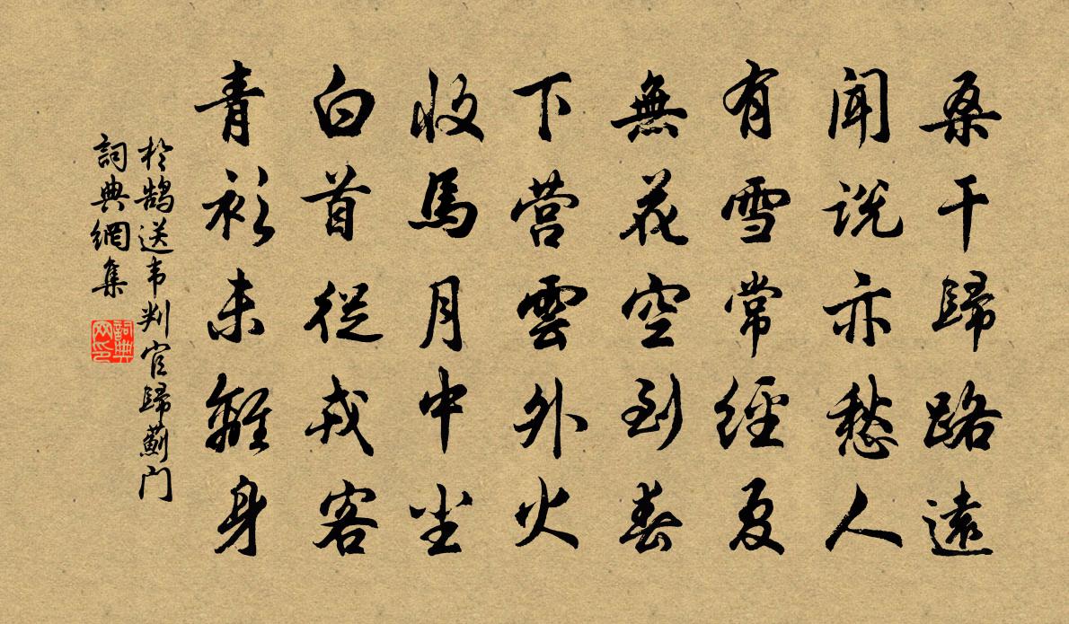詩詞名句歷史字典書法欣賞書法字典國語詞典說文解字康熙字典古漢語字典標 題 作 者 詩 句 送韋判官歸薊門作者:於鵠 朝代:唐代送韋判官歸薊門原文桑乾歸路遠,聞說亦愁人。有雪常經夏,無花空到春。下營雲外火,收馬月中塵。白首從戎客,青衫未離身。詩詞問答問:送韋判官歸薊門的作者是誰?答:於鵠問:送韋判官歸薊門寫於哪個朝代?答:唐代問:送韋判官歸薊門是什麼體裁?答:五律於鵠送韋判官歸薊門書法欣賞送韋判官歸薊門書法作品注釋全唐詩:卷310-20詩詞推薦右省僕射相公垂覽和詩,復貽長句,輒次來韻徐鉉〔唐代〕西院春歸道思深,披衣閒聽暝猿吟。鋪陳政事留黃閣,偃息神機在素琴。玉柄暫時疏末座,瑤華頻復惠清音。開晴松賈似道〔宋代〕城中得此觀,不用遠尋幽。松影半壇月,竹色一簾秋。和黃門舅十五夜作蘇頲〔唐代〕聞君陌上來,歌管沸相催。孤月連明照,千燈合暗開。寶裝游騎出,香繞看車回。獨有歸閒意,春庭伴落梅。臨江亭五詠儲光羲〔唐代〕晉家南作帝,京鎮北為關。江水中分地,城樓下帶山。金陵事已往,青蓋理無還。落日空亭上,愁看龍尾灣。山橫梅花絕句陸游〔宋代〕高韻知難折簡呼,溪頭掃地置芳壺。梅如解語應惆悵,昔日名流一個無。回中作溫庭筠〔唐代〕蒼莽寒空遠色愁,嗚嗚戍角上高樓。吳姬怨思吹雙管,燕客悲歌別五侯。千里關山邊草暮,一星烽火朔雲秋。夜來登湓城浦望廬山初晴,直省齎敕催赴江陰李嘉祐〔唐代〕西望香爐雪,千峰晚色新。白頭悲作吏,黃紙苦催人。多負登山屐,深藏漉酒巾。傷心公府內,手板日相親。絕句九首張耒〔宋代〕千林黃葉總飛霜,寂歷疏梅未肯妝。誰信輪囷臥山木,心知九地有微陽。支詩佚名〔先秦〕天之所支。不可壞也。其所壞亦不可支也。應天長(花港觀魚)張矩〔宋代〕岸容浣錦,波影墮紅,纖鱗巧避鳧唼。禹浪未成頭角,吞舟膽猶怯。湖山外,江海匝。怕自有、暗泉流接。楚天遠望江南戴復古〔宋代〕壺山好,文字滿胸中。詩律變成長慶體,歌詞漸有稼軒風。最會說窮通。中年後,雖老未成翁。兒大相傳書種在,依韻和景仁聞喜席上作兼呈司馬君實內翰王珪〔唐代〕奉詔華林事最榮,門前幾度放門生。三朝遇主惟文翰,十榜傳家有姓名。碧海蟠桃和露重,丹山雛鳳入雲清。詩書賀李昌時禁苑新命唐彥謙〔唐代〕振鷺翔鸞集禁闈,玉堂珠樹瑩風儀。不知新到靈和殿,張緒何如柳一枝?寄夾谷書隱何夢桂〔宋代〕當年曾憶賦高唐,回首邯鄲事渺茫。黃閣故人千里月,青山老我半頭霜。交情脈脈園中柳,憂思悠悠陌上桑。吹斷題高麗字跡牟巘五〔宋代〕片紙殷勤贈跋篇,來從箕子舊朝鮮。六經原不經秦火,好為刊傳惠後賢。飲百花洲四首黎廷瑞〔宋代〕桃花繞屋竹參天,曾向湖西住五年。回首但余葵麥在,古今何必更桑田。寧陵阻風雨寄都下親舊梅堯臣〔宋代〕晝夜風不止,寒樹嚎未休。人言雨殺風,雨急風未柔。獨扶慈母喪,淚與河水流。河水有冬竭,淚泉長在眸。予生喜郭希范上自癢歸胡仲參〔宋代〕馬蹄明日是君家,千里歸來傍節華。幾夜深閨寒寂寂,有人和淚卜燈花。東坡姜特立〔宋代〕文章聲價有東坡,歲晚親逢春夢婆。一聞千悟無餘事,背負大瓢還唱歌。惜哉龍眠不好事,不為寫東坡海外郊行圖春暮詠懷寄集賢韋起居袞鄭谷〔唐代〕寂寂風簾信自垂,楊花筍籜正離披。長安一夜殘春雨,右省三年老拾遺。坐看群賢爭得路,退量孤分且吟詩。五湖名句推薦蛇無頭而不行,鳥無翅而不飛。施耐庵《水滸傳·第六十回》 冬無愆陽,夏無伏陰,春無淒風,秋無苦雨左丘明《左傳·昭公·昭公四年》 雪中何以贈君別,惟有青青松樹枝。岑參《天山雪歌送蕭治歸京》 同心一人去,坐覺長安空。白居易《別元九後詠所懷》 反者道之動;弱者道之用。老子《老子·德經·第四十章》 年年躍馬長安市。客舍似家家似寄。劉克莊《玉樓春·戲林推》 長簟迎風早,空城澹月華韓翃《酬程延秋夜即事見贈》 亂點碎紅山杏發,平鋪新綠水蘋生。白居易《南湖早春》 危樓高百尺,手可摘星辰。李白《夜宿山寺》 芙蓉老秋霜,團扇羞網塵。李白《中山孺子妾歌》