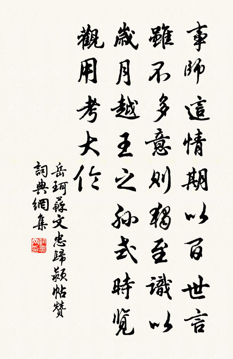 詩詞名句歷史字典書法欣賞書法字典國語詞典說文解字康熙字典古漢語字典標 題 作 者 詩 句 蘇文忠歸潁帖贊作者:岳珂 朝代:宋代蘇文忠歸潁帖贊原文事師這情,期以百世。言雖不多,意則獨至。識以歲月,越王之孫。式時覽觀,用考大倫。詩詞問答問:蘇文忠歸潁帖贊的作者是誰?答:岳珂問:蘇文忠歸潁帖贊寫於哪個朝代?答:宋代岳珂蘇文忠歸潁帖贊書法欣賞蘇文忠歸潁帖贊書法作品詩詞推薦杏園聯句李絳〔唐代〕杏園千樹欲隨風,一醉同人此暫同。 ——群上司空老態忽忘高宗祀明堂前朝享太廟二十一首真宗〔宋代〕孫哉維後,繼明的神。定章文武,宜民宜人。經世之道,功格於天。子孫嚴祀,無窮之傅。郊壇聽雅樂佚名〔宋代〕泰壇恭祀事,彩仗下寒坰。展禮陳嘉樂,齋心動眾靈。韻長飄更遠,曲度靜宜聽。泛響何清越,隨風散杳冥。徹懸水仙花二首來氏〔宋代〕瑤池來宴老仙家,醉倒風流萼綠華。白玉斷笄金暈頂,幻成痴絕女兒花。次韻孔著作常父館中喜雪晁補之〔宋代〕冬旱及茲雪,都人銷百憂。牆根有宿草,余綠尚去秋。新陽解薄冰,大潤升介丘。夜聞窗響紗,高雲正綢繆。明旦喜翟穎先輩至有感宋祁〔宋代〕門下客逾落,胡為君見從。墜餘仍顧甑,寒罷始知松。休計流光邁,聊欣此地逢。已甘漂似梗,寧止啞如鍾。仕路寄題鹽城方令君搖碧閣方岳〔宋代〕有山無水山枯杭,有閣無書閣未清。作計者誰三太息,美君於此四難並。宰官身落秋城柝,處士星寒雪墅耕。蚤晚贈李秀才順之葉適〔宋代〕怒漲爭茅笑,安流節斗門。行苗存水則,縮板護河源。士李昔陳義,守奚能聽言。便當生廟食,禾熟賽雞豚。真珠花張舜民〔宋代〕風中的皪月中看,解作人間五月寒。一似漢宮梳洗了,玉瓏璁壓翠雲冠。浣溪沙(陳少逸席上用聯句韻有贈)吳文英〔宋代〕秦黛橫愁送暮雲。越波秋淺暗啼昏。空庭春草綠如裙。彩扇不歌原上酒,青門頻返月中魂。花開空憶倚闌人。劍客行陸游〔宋代〕我友劍俠非常人,袖中青蛇生細鱗。騰空頃刻已千里,手決風雲驚鬼神。荊軻專諸何足數,正晝入燕誅逆虜。一身初夏曲三首劉禹錫〔唐代〕銅壺方促夜,斗柄暫南回。稍嫌單衣重,初憐北戶開。西園花已盡,新月為誰來。時節過繁華,陰陰千萬家。巢禽壽皇太子三首趙彥端〔宋代〕子晉吹笙未是仙,阿丕橫槊少全篇。小吟青著梅梢句,一日東風西海傳。再用韻呈帥機就寄仁溥吳泳〔宋代〕少學東坡頗愛奇,夜抄燈疏爇松脂。老隨年度幾弦瑟,愁怕月窺雙鬢髮。蠶市已非吾故國,菜園猶得子新詩。閒人雜曲歌辭。大酺樂(商調曲)佚名〔唐代〕淚滴珠難盡,容殘玉易銷。儻隨明月去,莫道夢魂遙。句織錦人〔唐代〕如今不重文章士,莫把文章夸向人。用十梅韻簽馮簿王炎〔宋代〕霏霏玉麈談,鄙吝堪澡雪。每見輒有聞,敢憚頻磬折。送從叔重赴海南從事馬戴〔唐代〕又從連帥請,還作嶺南行。窮海何時到,孤帆累月程。亂蟬吟暮色,哀狖落秋聲。晚路潮波起,寒葭霧雨聲。沙埋東屯洪咨夔〔宋代〕犖砍嶔岑轉百盤,峽天深處得平寬。秋風策策醾花老,暮雨蕭蕭稻子寒。仁者樂山心本靜,碩人在澗體俱胖。農家題曾幼度詩集後二首趙蕃〔宋代〕江南山水盡宜詩,幾欲經營竟不奇。不料此編能到手,意曾關處輒能知。名句推薦荷花開後西湖好,載酒來時。歐陽修《採桑子·荷花開後西湖好》 道傍榆莢仍似錢,摘來沽酒君肯否。岑參《戲問花門酒家翁》 人無千日好,花無百日紅。馮夢龍《醒世恆言·卷一》 多謝浣紗人未折,雨中留得蓋鴛鴦。鄭谷《蓮葉》 少室眾峰幾峰別,一峰晴見一峰雪。李頎《少室雪晴送王寧》 天下三分明月夜,二分無賴是揚州。徐凝《憶揚州》 眼前直下三千字,胸次全無一點塵。于謙《觀書》 竹籬茅舍,淡煙衰草孤村。白樸《天淨沙·冬》 夢繞神州路。張元乾《賀新郎·送胡邦衡待制赴新州》 月兒彎彎照九州,幾家歡樂幾家愁。佚名《月兒彎彎照九州》