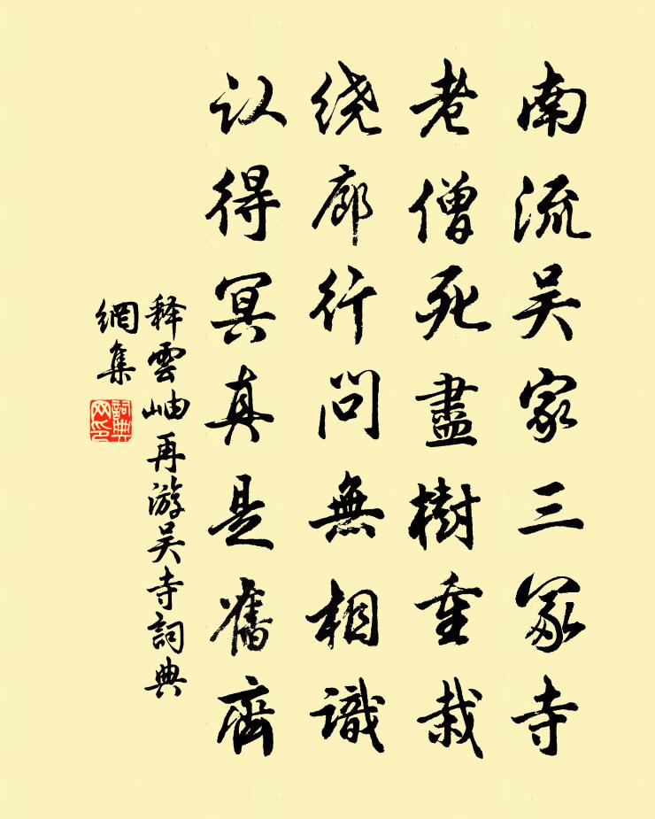 詩詞名句歷史字典書法欣賞書法字典國語詞典說文解字康熙字典古漢語字典標 題 作 者 詩 句 再游吳寺作者:釋雲岫 朝代:宋代再游吳寺原文南流吳家三冢寺,老僧死盡樹重栽。繞廊行問無相識,認得冥真是舊齊。詩詞問答問:再游吳寺的作者是誰?答:釋雲岫問:再游吳寺寫於哪個朝代?答:宋代釋雲岫再游吳寺書法欣賞再游吳寺書法作品詩詞推薦又和令公新開龍泉晉水二池白居易〔唐代〕舊有潢污泊,今為白水塘。[詩云:方塘含白水。]笙歌聞四面,樓閣在中央。春變煙波色,晴添樹木光。龍泉信溯江至武昌孟浩然〔唐代〕家本洞庭上,歲時歸思催。客心徒欲速,江路苦邅回。殘凍因風解,新正度臘開。行看武昌柳,仿佛映樓台。營屋杜甫〔唐代〕我有陰江竹,能令朱夏寒。陰通積水內,高入浮雲端。甚疑鬼物憑,不顧翦伐殘。東偏若面勢,戶牖永可安。愛惜臨江使君陳華叟哀詩二首劉克莊〔宋代〕眾聞鳴鏑驚麕散,獨奮空拳躍馬迎。嚼齒罵聲殊未絕,歸元血面尚如生。睢陽合祀無南八,河北諸城有杲卿。可惜游金山寄揚州鮮于子駿從事邵光蘇轍〔宋代〕揚州望金山,隱隱大如幞。朅來長江上,孤高二千尺。僧居厭山小,面面貼蒼石。虛樓三百間,正壓江潮白。清風次韻陳叔永山居二首范浚〔宋代〕子方夸小隱,我亦愛深居。出補登山屐,歸攜帶月鋤。旋沽新漉酒,聊駐故人車。有此幽棲樂,雖貧亦晏如。謝載悟庵釋智愚〔宋代〕深荷城東老淨名,菜園舍了雙齋僧。磨刀石子看看盡,居士肝心鐵打成。含笑花蕭崱〔宋代〕肥樣凋成玉色仙,碧瑤幢里粲嬋娟。道渠解笑何曾笑,只合更名小白蓮。次韻和西堂風霾宋庠〔宋代〕霧氣疑成雨,終風亟挫春。祗驚天灑礫,寧是暮吹塵。大旆亡空澤,奔車僨要津。高樓非可望,偏汗扇中人。戲呈聞善黃庭堅〔宋代〕堆豗病鶴怯雞群,見酒特地生精神。坐中索起時被肘,亦任旁人嫌我真。水龍吟(壽劉無競·十月三十)王邁〔宋代〕橙黃橘綠佳期,詰朝又報陽來復。籠蔥瑞氣,天教蟠繞,名門喬木。上界仙人,來游西塾,驂鸞跨鶴。有如椽彩筆次韻李大著春日雜詩十首喻良能〔宋代〕偏親須寸祿,匠院敢辭留。頗愧花經眼,還應草喚愁。身唯親布被,交已絕牙籌。詩興抽毫足,無勞入海求。挽謝公王方岳〔宋代〕白鹿遺書山澤癯,歸來花木盡堪娛。功名之夢晦庵晦,禮樂其家迂叟迂。雪屋一燈春夜半,竹山千古暮雲孤。雨寒自淨土步至功臣寺蘇軾〔宋代〕落日岸葛巾,晚風吹羽扇。松間野步穩,竹外飛橋轉。神功鑿橫嶺,岩石得巨片。直渡千人溝,下有微流泫。岡巒投王饒州日勤四首趙蕃〔宋代〕福星誰遣出虛危,帝念鄱人因數飢。試問公來若為政,皆言吏瘠與民肥。次吳長文見寄時有衡山之役裘萬頃〔宋代〕夜半詩成欲寄君,夢魂飛渡楚江津。怡怡前日如兄弟,今作東西南北人。游山五題留題龍潭余靖〔宋代〕峭嶺盤遠郊,幽泉生石罅。沮洳成深潭,神龍隱其下。氣昏雲霧朝,光寒風雨夜。絕境鄰梵宮,餘波沃農稼。秋態遣僧澄收刈潼陽朱翌〔宋代〕不潠田將獲,東屯稼亦收。厭煩吾老矣,為眾子行不。一粒生何處,千箱慶有秋。灌溪明月飯,今日已無愁。己卯十月一日至燕越五日罹狴犴有感而賦文天祥〔宋代〕落落南冠自結纓,桁楊臥起影縱橫。坐移白石知何世,夢斷青燈問幾更。國破家亡雙淚暗,天荒地老一身輕。黃粱雪中方岳〔宋代〕行纏不了醉生涯,空宿沙頭賣酒家。最是曉寒吟未穩,雪深無面見梅花。名句推薦唯有長江水,無語東流。柳永《八聲甘州·對瀟瀟暮雨灑江天》 殘雪庭陰,輕寒簾影,霏霏玉管春葭。王沂孫《高陽台·和周草窗寄越中諸友韻》 關河無限清愁,不堪臨鑒岳珂《祝英台近·北固亭》 重岩疊嶂,隱天蔽日。酈道元《三峽》 柳帶搖風漢水濱,平蕪兩岸爭勻。牛希濟《臨江仙·柳帶搖風漢水濱》 飛光飛光,勸爾一杯酒。李賀《苦晝短》 吾生也有涯,而知也無涯。莊子《莊子·內篇·養生主原文》 是非只為多開口,煩惱皆因強出頭。佚名《增廣賢文·上集》 萬物並育而不相害。道並行而不相悖。小德川流;大德敦化。子思《中庸·第三十章》 年年春日異鄉悲,杜曲黃鶯可得知。韋莊《江外思鄉》