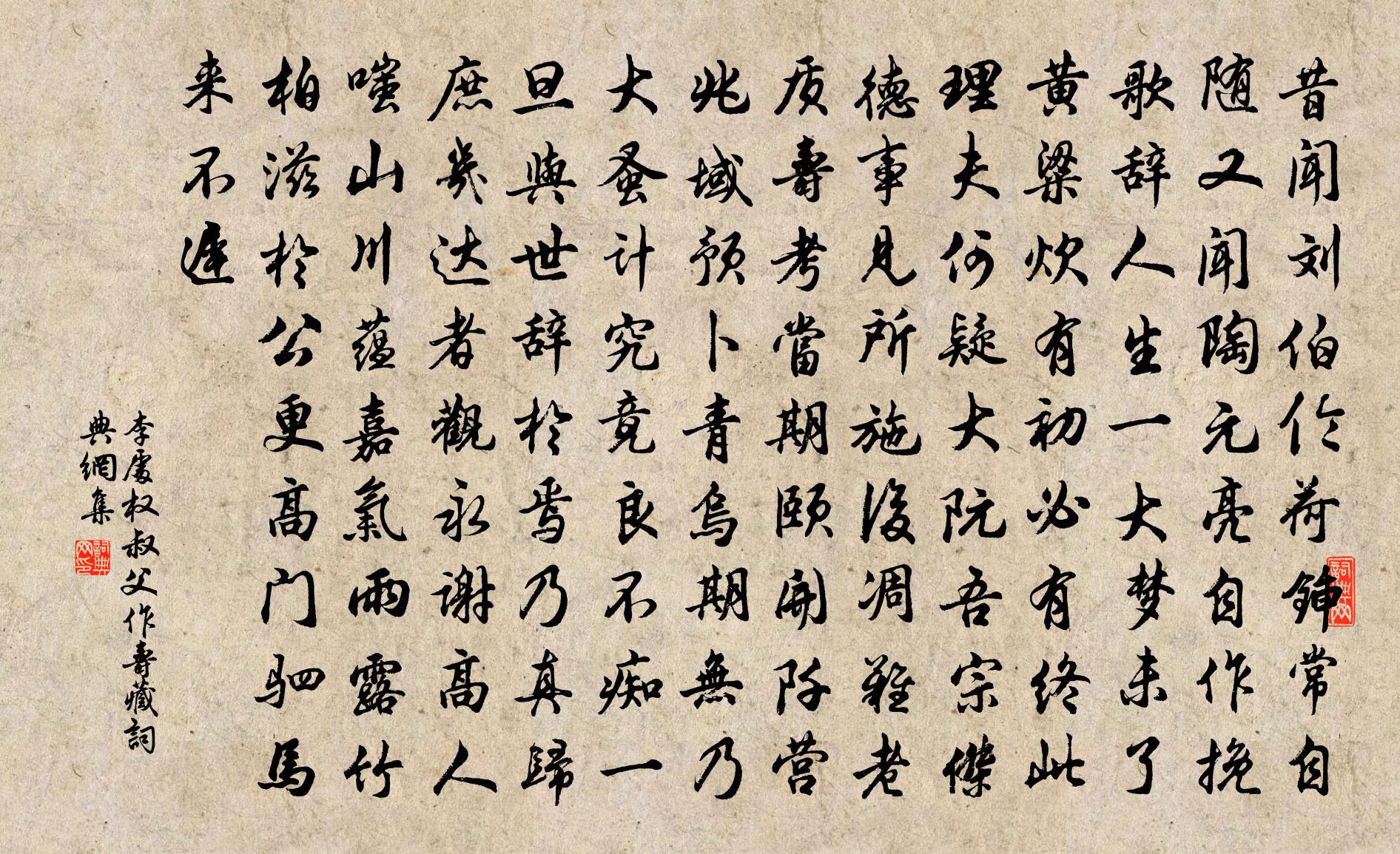 詩詞名句歷史字典書法欣賞書法字典國語詞典說文解字康熙字典古漢語字典標 題 作 者 詩 句 叔父作壽藏作者:李處權 朝代:宋代叔父作壽藏原文昔聞劉伯倫,荷鍤常自隨。又聞陶元亮,自作輓歌辭。人生一大夢,未了黃粱炊。有初必有終,此理夫何疑。大阮吾宗傑,德事見所施。後凋難老質,壽考當期頤。開阡營兆域,預卜青烏期。無乃大蚤計,究竟良不痴。一旦與世辭,於焉乃真歸。庶幾達者觀,永謝高人嗤。山川蘊嘉氣,雨露竹柏滋,於公更高門,駟馬來不遲。詩詞問答問:叔父作壽藏的作者是誰?答:李處權問:叔父作壽藏寫於哪個朝代?答:宋代李處權叔父作壽藏書法欣賞叔父作壽藏書法作品詩詞推薦漢宮春(慈寧殿元夕被旨作)康與之〔宋代〕雲海沈沈,峭寒收建章,雪殘DE32鵲。華燈照夜,萬井禁城行樂。春隨鬢影,映參差、柳絲梅萼。丹禁杳,鰲戒飲三詩陳造〔宋代〕毒痡痛受辛,斬刈憎暴秦。杜康與儀狄,賊物其罪均。商毒烈火炎,岐鎬方陽春。秦暴虓虎搏,歐粵無顰呻。二子送元晟歸潛山所居(一作送王山人歸別業)皇甫冉〔唐代〕深山秋事早,君去復何如。裛露收新稼,迎寒葺舊廬。題詩即招隱,作賦是閒居。別後空相憶,嵇康懶寄書。魚樂樓趙孟頫〔元代〕樓下南來水,清泠百尺深。菰蒲終夜響,楊柳半溪陰。日月驅人世,江湖動客心。向來歌舞宴,達曉看橫參。送仙客李中〔唐代〕危言危行是男兒,倚伏相牽豈足悲。莫向汀洲時獨立,悠悠斜日照江蘺。遊仙曲陳允平〔宋代〕中秋月正明,夜半飛紫瓊。拂袖天上去,攬衣朝太清。縹緲黃金闕,迢遙白玉京。離離百寶幢,裊裊九華旌。簫韶頌古一○一首釋子淳〔宋代〕一點靈明六不收,照然何用更凝眸。箇中訊息人難委,獨有虛空暗點頭。安分釋文珦〔宋代〕鷃鵬雖有異,小大各逍遙。靜處安吾分,塵緣坐見消。煙霞開古色,松柏尚高標。更愛無生侶,時來伴寂寥。王殿丞赴莫州日就余求釣竿數莖以往今因其使梅堯臣〔宋代〕去日覓釣竿,定能垂釣否。若不暇釣魚,釣竿當去取。和大參相公劉過〔宋代〕氣壓三千界,雲橫百尺樓。地靈絕興替,木老閱春秋。杖屨逍遙步,琴書汗漫遊。利名空役役,回首愧禪流。去郡三思方岳〔宋代〕我思種明逸,與帝自賓友。歸眠青山雲,未醒紫宸酒。誰何敢譏彈,乃有此健守。天心本無私,以一調眾口。徙之跋範文公與尹師魯帖楊萬里〔宋代〕佳客千山得得來,主人雙眼為渠開。逢人莫說當時事,且泊南亭把一杯。雙燕離李白〔唐代〕雙燕復雙燕,雙飛令人羨。玉樓珠閣不獨棲,金窗繡戶長相見。柏梁失火去,因入吳王宮。吳宮又焚盪,雛盡巢亦玉台體題湖上亭戎昱〔唐代〕湖入縣西邊,湖頭勝事偏。綠竿初長筍,紅顆未開蓮。蔽日高高樹,迎人小小船。清風長入坐,夏月似秋天。聞王道濟陷虜陳與義〔宋代〕海內堂堂友,如今在賊圍。虛傳袁盎脫,不見華元歸。浮世身難料,危途計易非。雲孤馬息嶺,老淚不勝揮。病中午後登山閒步遙見園亭有以帟張欄處久而岳珂〔宋代〕滿山桃李鬧紅霞,曾約香山白鹿車。堪笑東風欺病客,攙先且到別人家。巫山一段雲 黃橋晚照李齊賢〔元代〕曠望*田路,嵯峨柳院樓。夕陽行路卻回頭。紅樹五陵秋。城郭遺基壯,干戈往事悠。村家童子不知愁。橫笛倒騎次韻郎中弟見寄李彌遜〔宋代〕季子論才到履絇,十年不調可憐渠。自聞馬祖今非佛,不似潛夫但著書。律中應鐘(一作裴次元詩)裴次元〔唐代〕律窮方數寸,室暗在三重。伶管灰先動,秦正節已逢。商聲辭玉笛,羽調入金鐘。密葉翻霜彩,輕冰斂水容。望鴻獻鄭給事杜荀鶴〔唐代〕化行邦域二年春,樵唱漁歌日日新。未降詔書酬善政,不知天澤答何人。秋登岳寺雲隨步,夜宴江樓月滿身。他日名句推薦湖光秋月兩相和,潭面無風鏡未磨。劉禹錫《望洞庭》 七國三邊未到憂,十三身襲富平侯李商隱《富平少侯》 火冷燈稀霜露下,昏昏雪意雲垂野。蘇軾《蝶戀花·密州上元》 綠竹含新粉,紅蓮落故衣。王維《山居即事》 篳路藍縷,以啟山林。左丘明《左傳·宣公·宣公十二年》 明日近長安,客心愁未闌。納蘭性德《菩薩蠻·白日驚飈冬已半》 風淅淅,雨纖纖。難怪春愁細細添。納蘭性德《赤棗子·風淅淅》 庶人莫與官爭,貴人不結人怨。來俊臣《羅織經·保身卷第七》 小桃無主自開花,菸草茫茫帶曉鴉。戴復古《淮村兵後》 胡人吹笛戍樓間,樓上蕭條海月閒。高適《和王七玉門關聽吹笛 / 塞上聞笛》