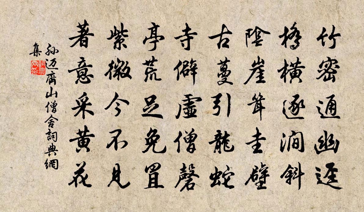 詩詞名句歷史字典書法欣賞書法字典國語詞典說文解字康熙字典古漢語字典標 題 作 者 詩 句 齊山僧舍作者:孫邁 朝代:宋代齊山僧舍原文竹密通幽逕,橋橫逐澗斜。陰崖聳圭壁,古蔓引龍蛇。寺僻虛僧磬,亭荒足免罝。紫微今不見,著意采黃花。詩詞問答問:齊山僧舍的作者是誰?答:孫邁問:齊山僧舍寫於哪個朝代?答:宋代孫邁齊山僧舍書法欣賞齊山僧舍書法作品詩詞推薦代陳季若上張帥林光朝〔宋代〕欲將玉律播平康,長見單于拜未央。相國正須如治郡,春風隨處有甘棠。鐵釘釋紹曇〔宋代〕惡鉗鎚下翻身去,個個當陽要出尖。釘得虛空無縫罅,有完全有不完全。贈石崇詩曹攄〔魏晉〕涓涓谷中泉。鬱郁岩下林。泄泄羣翟飛。咬咬春鳥吟。野次何索寞。薄暮愁人心。三軍望衡蓋。嘆息有餘音。臨餚蜀山謁東坡書院陳維崧〔清代〕水拍晴莎,山銜春店,飛花落絮悠揚。打魚放鴨,四月好時光。此地林巒絕勝,家家足、碧澗幽篁。斜坡上,碎瓻葛陂懷古李覯〔宋代〕長房化去已千年,鬼魅紛紛不畏天。老鱉若來為太守,何人殺向葛陂邊。王質觀棋顧逢〔宋代〕弈邊忘日月,況復遇神仙。石上無多著,人間幾百年。指枰如料敵,落子欲爭先。想爾腰柯爛,回頭亦駭然。送鄭公績赴試金陵朱翌〔宋代〕念我答颯久,區區勞此生。借屋就瞿曇,長湖繞廂瀠。未了文字債,截蒲坐縱橫。天公喜相我,貺以秋風清。他年水調歌頭(夜泛湘江)王炎〔宋代〕江月冷如水,江水碧於空。晚來一霎過雨,為我洗秋容。悄悄四山人靜,凜凜三更露下,天闊叫孤鴻。喚醒蓬窗夢韓耕道交八絕句韻見寄因和答之曹彥約〔宋代〕昌黎世有簡編孫,鄴下常傳慷慨言。憶得此公端的健,但將忠力復名門。烏夜啼盧祖皋〔宋代〕照水飛禽斗影,舞風小徑低花。征鴻排盡相思字,音信落誰家。系恨腰圍頓減,禁愁酒力難加。樓高日暮休簾卷,周興嗣徐鈞〔宋代〕文成千字貫如珠,一夜勞心白盡須。不省海鹹河淡句,帖中已有漢章書。欲曙元稹〔唐代〕江堤閱暗流,漏鼓急殘籌。片月低城堞,稀星轉角樓。鶴媒華表上,鵾鵊柳枝頭。不為來趨府,何因欲曙游。殘句:白鳥過林分外明陳師道〔宋代〕白鳥過林分外明。長相思朱敦儒〔宋代〕昨日晴。今日陰。樓下飛花樓上雲。闌乾雙淚痕。江南人。江北人。一樣春風兩樣情。晚寒潮未平。貴公子夜闌曲李賀〔唐代〕裊裊瀋水煙,烏啼夜闌景。曲沼芙蓉波,腰圍白玉冷。詠史(一作和蕃)戎昱〔唐代〕漢家青史上,計拙是和親。社稷依明主,安危托婦人。豈能將玉貌,便擬靜胡塵。地下千年骨,誰為輔佐臣。和樂天閒園獨賞八韻前以蜂鶴拙句寄呈…小巧以取大咍劉禹錫〔唐代〕永日無人事,芳園任興行。陶廬樹可愛,潘宅雨新晴。傅粉琅玕節,薰香菡萏莖。榴花裙色好,桐子藥丸成。柳蠹依韻和李君讀余注孫子梅堯臣〔宋代〕我世本儒術,所談聖人篇。聖篇辟乎道,信謂天地根。眾賢發蘊奧,授業稱專門。傳箋與註解,璨璨今猶存。始欲贈送前劉五經映三十四韻李商隱〔唐代〕建國宜師古,興邦屬上庠。從來以儒戲,安得振朝綱。叔世何多難,茲基遂已亡。泣麟猶委吏,歌鳳更佯狂。屋壁送童子敬赴省姚勉〔宋代〕滿望飛騰幾許年,一聞充賦喜如顛。金經爐冶鋒方銳,木飽風霜節始堅。此去穩登雲里路,定知榮冠籍中仙。近聞名句推薦非君子不可與語變。王通《中說·卷七·述史篇》 西湖春色歸,春水綠於染歐陽修《春日西湖寄謝法曹歌》 越鳥巢乾後,歸飛體更輕。李商隱《晚晴》 綠竹含新粉,紅蓮落故衣。王維《山居即事》 奉勸世間夫婦,固不可彼此相仇,亦不可過於情篤。沈復《浮生六記·坎坷記愁》 夕陽倒影射疏林,江邊一帶芙蓉老。陳霆《踏莎行·晚景》 喜無以賞,怒無以殺管仲《管子·版法》 善為吏者樹德,不善為吏者樹怨。韓非及後人《韓非子·外儲說左下》 從臣皆半醉,天子正無愁。李商隱《陳後宮》 大家做事尋常,小家做事慌張。佚名《增廣賢文·上集》