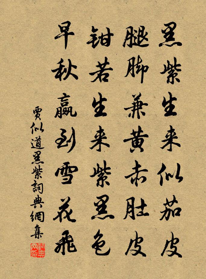 詩詞名句歷史字典書法欣賞書法字典國語詞典說文解字康熙字典古漢語字典標 題 作 者 詩 句 黑紫作者:賈似道 朝代:宋代黑紫原文黑紫生來似茄皮,腿腳兼黃赤肚皮。鉗若生來紫黑色,早秋贏到雪花飛。詩詞問答問:黑紫的作者是誰?答:賈似道問:黑紫寫於哪個朝代?答:宋代賈似道黑紫書法欣賞黑紫書法作品詩詞推薦寫懷釋行海〔宋代〕話別蘇堤第一橋,白頭孤客悵難消。山中蹈華皈來晚,只有青燈作寂寥。光祿朱卿輓詞十首李廌〔宋代〕疇昔始龍館,能聲到海隅。兆民方菜色,境政獨蒲廬。尚賴德彌郡,安知今也無。猶聞江左郡,荒政徯來蘇。臨別成都帳飲萬里橋贈譚德稱陸游〔宋代〕成都城南萬里橋,蘆根苹末風蕭蕭。映花碾草鈿車小,駐坡驀澗青驄驕。入門翠徑絕窈窕,臨水飛觀何迢嶢。判無潯陽館邊泛小舟夷猶沙浦中遇翟偉大舟過董嗣杲〔宋代〕沽來官亭酒,艷流勝琥珀。高歌大江上,聊以信所適。借舟喜逢君,春沙涵潤澤。傍沙得鮮鮰,過似河魨白。斫鱠屺瞻道中馬廷鸞〔宋代〕蓐食需明出遠村,筍輿咿軋睡昏昏。禾麻豐歲雲連畝,風露高秋水落痕。清曉跨鞍兒從父,當年戲彩母憐孫。白頭望海樓獨立汪元量〔宋代〕風吹腥氣滿樓台,獨倚闌乾十二回。天入越江龍逝去,雨昏吳市燕飛來。旌旗閃閃千帆過,簾幙重重一笛哀。惆悵百舌林逋〔宋代〕柳條初重草初肥,煙濕園林晚未晞。百種堪憐巧言語,一般惟久好毛衣。欺凌紅杏從頭宿,諷刺黃鸝趁背飛。誰道今別離(一作別離曲)李白〔唐代〕結髮生別離,相思復相保。如何日已久,五變庭中草。渺渺大海途,悠悠吳江島。但恐不出門,出門無遠道。遠道筠溪八景詩金雞報曙陳著〔宋代〕千金鑠鑠獨文身,五德名標莫與群。振翼豈愁天色暝,曲頭如盼曙光新。鳥穿竹韻窗談巧,風卷塵嵐士□勤。□見金陵雜興二百首蘇泂〔宋代〕晉宋齊梁幾帝陵,土堆誰解有英靈。三台五省紛紛改,惟有鐘山只麽青。偶書王冕〔元代〕聖主臨朝問好官,豈無公論在長安?野人不入麒麟畫,御史都簪獬豸冠。直北五更霜氣重,江南三月雨聲寒。繡衣蠲上人求頌釋子淳〔宋代〕一九逢春信,梅花破雪開。箇中如會得,千里不空來。謁金門朱雍〔宋代〕春太早。十二玉樓初曉。半額試妝深院悄。相逢何草草。臨水幽香縹緲。彷佛淡妝窺照。恰值日邊人未到。紛紛縈送王推赴調陳宓〔宋代〕俯視庸流四海空,縱橫萬卷貯胸中。蘭台不日看登用,蓮幕三年肯奏功。松逕未荒心已動,雪舟誰辦興先窮。帝城登清音堂喻良能〔宋代〕洲以檀槽舊得名,風來草木自成聲。青衫司馬令人恨,只作潯陽送客行。賀范舍人再入西掖王禹偁〔宋代〕再入承明舊直廬,腰間仍得佩金魚。重批漢武求賢詔,曾上東方自藏書。紅藥篇章應感動,紫泥封檢未生疏。樊川喜春來·七夕佚名〔元代〕天孫一夜停機暇,人世千家乞巧忙,想雙星心事密話頭長。七月七,回首笑三郎。十月十八日梅堯臣〔宋代〕霜梧葉盡枝影疏,井上青絲轉轆轤。西廂舞娥艷如玉,東楯貴郎才且都。纏頭誰惜萬錢錦,映耳自有明月珠。一為酹江月(揚州菊坡席上作)曾協〔宋代〕一年好處,是霜輕塵斂,山川如洗。晚菊留花供燕賞,金縷寶衣銷地。舊觀初還,層樓相望,重見昇平際。小春時劉欽貢元第一百一十二文天祥〔宋代〕文章日自負,去家死路傍。高視見霸王,感子故意長。名句推薦龍蛇四海歸無所,寒食年年愴客心。屈大均《壬戌清明作》 門外綠陰千頃,兩兩黃鸝相應。曹組《如夢令·門外綠陰千頃》 莫道讒言如浪深,莫言遷客似沙沉。劉禹錫《浪淘沙九首》 離離原上草,一歲一枯榮。白居易《草 / 賦得古原草送別》 江漢思歸客,乾坤一腐儒。杜甫《江漢》 善有善報,惡有惡報。不是不報,時候未到。佚名《增廣賢文·上集》 柳葉開銀鏑,桃花照玉鞍。駱賓王《送鄭少府入遼共賦俠客遠從戎》 曉風催我掛帆行,綠漲春蕪岸欲平。查慎行《曉過鴛湖》 樹木何蕭瑟,北風聲正悲。曹操《苦寒行》 高峰入雲,清流見底陶弘景《答謝中書書》