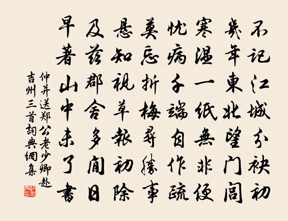 詩詞名句歷史字典書法欣賞書法字典國語詞典說文解字康熙字典古漢語字典標 題 作 者 詩 句 送鄭公老少卿赴吉州三首作者:仲並 朝代:宋代送鄭公老少卿赴吉州三首原文不記江城分袂初,幾年東北望門閭。寒溫一紙無非便,憂病千端自作疏。莫忘折梅尋勝事,懸知視草報初除。及茲郡舍多閒日,早著山中未了書。詩詞問答問:送鄭公老少卿赴吉州三首的作者是誰?答:仲並問:送鄭公老少卿赴吉州三首寫於哪個朝代?答:宋代仲並送鄭公老少卿赴吉州三首書法欣賞送鄭公老少卿赴吉州三首書法作品詩詞推薦次韻庾使左史中書行部二首劉克莊〔宋代〕朝回暖律變嚴冬,應念閩風與蜀同。叢棘冤皆為洗雪,發棠惠遍及飢窮。冰寒吏膽照天燭,泉涌詩腸飲潤虹。帝遣題阮步兵祠二首宋祁〔宋代〕幽懷八十首,鬱郁寄蓬池。屋壁留南巷,鄉人奉種祠。乘驢非宦巧,逃蝨厭流卑。三沃椒漿酹,誰論飲過差。次韻方蒙仲高人亭方岳〔宋代〕鷗鷺之與侶,竹石之與居。子虛亡是公,付之渴相如。風入松·聽風聽雨過清明吳文英〔宋代〕聽風聽雨過清明。愁草瘞花銘。樓前綠暗分攜路,一絲柳、一寸柔情。料峭春寒中酒,交加曉夢啼鶯。 西園日日因營張村蠻窩並書所見戴表元〔宋代〕老子來無一把茅,居然得此好窪坳。開塘謹避蛟龍窟,伐樹須存烏鵲巢。巫山一段雲馬鈺〔元代〕醉臥琉璃帳,閒看悲翠簾。自然俗慮絕毫纖。寶鼎玉花添。*起心香性炷。引動麟飛鳳舞。龍蟠虎繞戲神珠。丹結水調歌頭(元日投宿博山寺,見者驚嘆其老)辛棄疾〔宋代〕頭白齒牙缺,君勿笑衰翁。無窮天地今古,人在四之中。臭腐神奇俱盡,貴賤賢愚等耳,造物也兒童。老佛更堪笑紹興以後祀五方帝六十首佚名〔宋代〕靈不肯留,沛兮將歸。王節猋逝,翠旗羔馳。顧瞻儜立,悵然佳期。蹇千萬年,無故人斯。訪蔡文慶處士留題李中〔唐代〕幽人棲息處,一到滌塵心。蘚色花陰闊,棋聲竹徑深。籬根眠野鹿,池面戲江禽。多謝相留宿,開樽拂素琴。郊廟朝會歌辭方皇樂歌佚名〔宋代〕四階秩德,壇於方澤。昭事皇祗,即陰以墌。潔肆於祊,孔嘉且碩。神其福之,如幾如式。送李梁山之官二首魏了翁〔宋代〕質行疑似鈍,至論本亡奇。一寸虛靈地,千年德政碑。更窮山犖确,毋嘆路逶遲。官職時來作,天公自已知。鴻鵠歌劉邦〔兩漢〕鴻鵠高飛,一舉千里。羽翮已就,橫絕四海。橫絕四海,當可奈何?雖有矰繳,尚安所施?踏雲行馬鈺〔元代〕偶爾心明,自然靈感。寶珠出入驪龍頷。真常常應顯昭彰,性通通達無昏暗。處世慳貪,則吾豈敢。*袍共敝而無荔枝堂夕眺三首楊萬里〔宋代〕閏年秋淺似秋深,蟋蟀將愁傍砌吟。今夕初三元未覺,西樓西角一鉤金。書與士瞻上人十首仇遠〔宋代〕我本迂疏落拓人,滿頭霜雪滿懷春。登山有屐身恆健,掛壁無弦趣更真。往歲郊官殊漫浪,老來學佛離貪嗔。卻憐戲題李洪〔宋代〕世事悠悠豈盡,人生汲汲多端。陶令欲歌歸去,貢公何事彈冠。太常引 次韻伯陽雪中邵亨貞〔元代〕銷金帳底燭花偏。低唱擁嬋娟。遙夜酒杯傳。幾沉醉、瓊林洞天。梅花如舊,竹窗猶在,留得煮茶煙。獨欠釣魚船玉樓春陳允平〔宋代〕粉銷香減紅蘭淚。總是文君初別意。春風織就悶情懷,夜月砌成愁況未。迢迢歸夢頻東里。堪恨洛陽花漸已。斜陽蘭王柏〔宋代〕早受樵人貢,春蘭訪舊盟。謝庭夸瑞物,楚澤擷芳名。蒼玉圭影,紫檀含露英。奚奴培護巧,苔蘚綠菁菁。過富陽劉黻〔宋代〕是非終有定,世路苦多屯。山色難留客,江湖亦送人。牛羊寒日晚,桑柘一陽新。早悟深矰繳,山中合隱淪。名句推薦雪消門外千山綠,花發江邊二月晴。歐陽修《春日西湖寄謝法曹歌》 今日清明節,園林勝事偏。賈島《清明日園林寄友人》 伏屍百萬,流血漂櫓。賈誼《過秦論》 陰壑生虛籟,月林散清影杜甫《游龍門奉先寺》 重陽佳節意休休,與客攜壺共上樓。姜塘《摘星樓九日登臨》 天行有常,不為堯存,不為桀亡。荀子《荀子·天論》 大漠孤煙直,長河落日圓。王維《使至塞上》 酒債尋常行處有,人生七十古來稀。杜甫《曲江二首》 繁霜儘是心頭血,灑向千峰秋葉丹。戚繼光《望闕台》 不知何處吹蘆管,一夜征人盡望鄉。李益《夜上受降城聞笛》