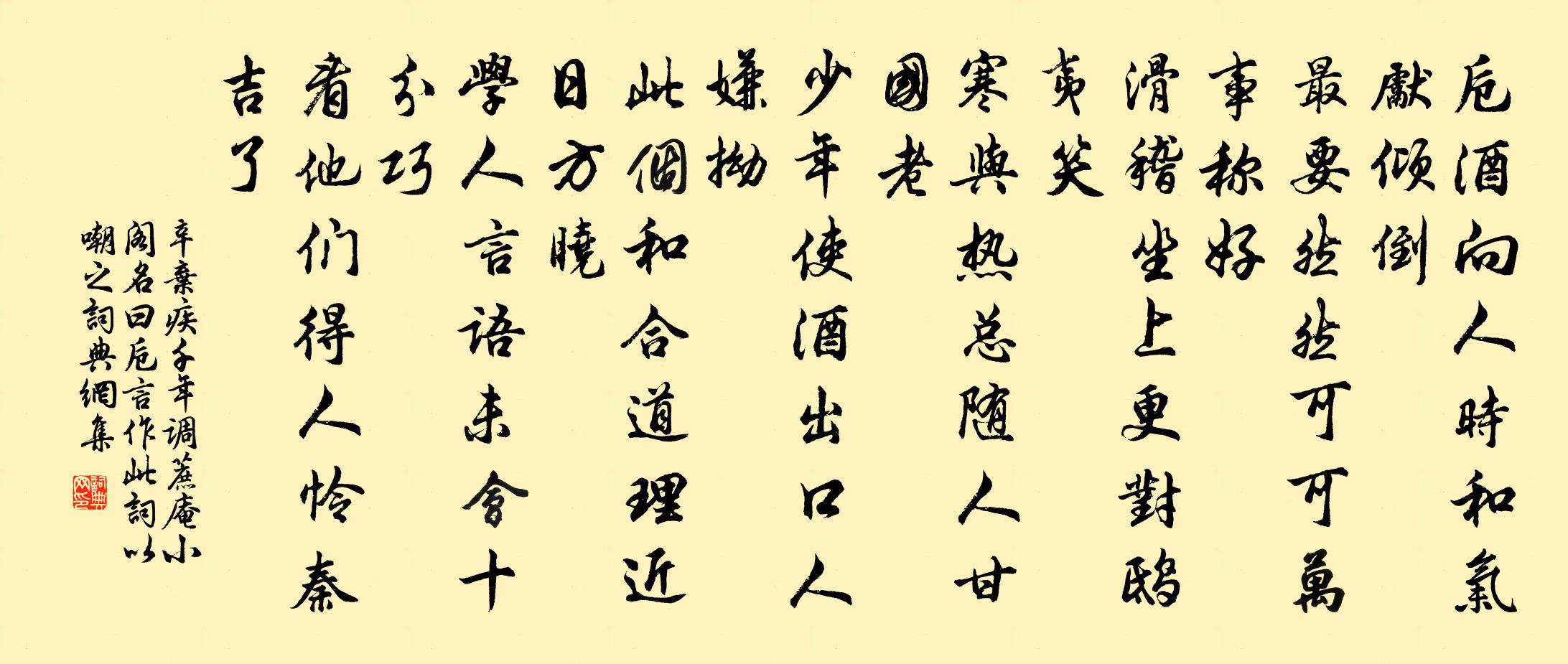 詞即借卮這一形象,來比喻那些沒有固定信仰和主見,而俯仰隨人、應聲附和的人。接著以“然然可可,萬事稱好”補明前面的描寫,一個笑容可掬,隨著權勢者的話語,點頭哈腰,連稱:“是、是,對、對,好、好”的可笑可憎的形象躍然紙上 。“滑稽坐上,更對鴟夷笑。”“滑稽”和“鴟夷 ”是兩種酒器。“滑稽”,為流酒器,能轉注吐酒,終日不已。“鴟夷”,一種皮製的酒袋,容量大,可隨意伸縮、卷折。它們成天在酒席上忙乎不停,倒完酒又灌滿,灌滿又倒完,圓轉靈活。這使人自然地聯想起那些善於應酬,花言巧語之徒 。“滑稽坐上”,即“坐(同座 )上滑稽”,“更對鴟夷笑 ”,一個“笑”字,將物寫活了,把那些如“滑稽”一般圓通自如而得意洋洋的小人的醜態,勾畫了出來。“寒與熱,總隨人,甘國老。”仍然是以物喻人。“甘國老”,即中藥甘草,其味甘平,能夠調和眾藥,醫治寒、熱引起的多種疾病,故有“國老”之名。詞人正是以此諷刺那些不講是非原則,專和稀泥,欺世盜名的鄉愿。
