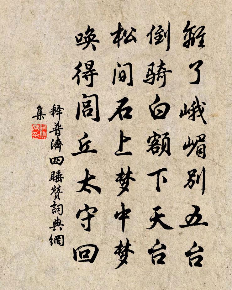 詩詞名句歷史字典書法欣賞書法字典國語詞典說文解字康熙字典古漢語字典標 題 作 者 詩 句 四睡贊作者:釋普濟 朝代:宋代四睡贊原文離了峨嵋別五台,倒騎白額下天台。松間石上夢中夢,喚得閭丘太守回。詩詞問答問:四睡贊的作者是誰?答:釋普濟問:四睡贊寫於哪個朝代?答:宋代釋普濟四睡贊書法欣賞四睡贊書法作品詩詞推薦寄內詩河北士人〔唐代〕握筆題詩易,荷戈征戍難。慣從鴛被暖,怯向雁門寒。瘦盡寬衣帶,啼多漬枕檀。試留青黛著,回日畫眉看。白翎鵲辭楊維楨〔元代〕白翎鵲,西極來。金為冠,玉為衣。百鳥見之不敢飛,雄狐猛虎愁神機。先帝親手鞲,重爾西方爾。海東之青汝何八月二十九日小飲曾鞏〔宋代〕陰陽在天地,鼓吹猶橐籥。煩蒸翕已盡,灝氣乃浮薄。群山翠相抱,塵靄如洗濯。川源亦虛徹,派別歸眾壑。囂音再次韻蘇公示兩歐陽陳師道〔宋代〕公詩周魯後,曳曳垂天雲。府中顧長康,風味如麴君。非公無此客,請壽兩山樽。叔季大儒後,偏醒亦同醺。心與寄太府丞王能甫晁公溯〔宋代〕君才雄萬夫,少也備文武。前年有疆事,假守在淮浦。小試三里城,已可因吾圉。諸公識獻納,見賢自當舉。雖聞贈鄒葆光道士曹仙家〔宋代〕羅浮道士真仙子,躍出樊籠求不死。冰壺皎潔水鑒清,洞然表里無塵滓。叱吒雷霆發指端,馘邪役鬼篆飛丹。朝吞括滿江紅林正大〔宋代〕太一真人,蓮葉向、中流蕩漾。凌萬頃、風為帆席,浪為輕槳。亂舞翠綃雲霧薄,臥看玉宇琉璃晃。似飄然、萬斛王鞏清虛堂蘇軾〔宋代〕清虛堂里王居士,閉眼觀身如止水。水中照見萬象空,敢問堂中誰隱几。吳興太守老且病,堆案滿前長渴睡。願君送楊菊屋釋文珦〔宋代〕菊屋何為者,耽吟嘔肺肝。短衣空自詠,長鋏向誰彈。不計為儒誤,唯言得句難。幾人憐此別,把酒不成歡。月夜遊冷泉亭釋永頤〔宋代〕地靈泉上寺,松壑定深青。獨聽子規叫,況逢山月明。樹藏春洞黑,石擁夜泉鳴。日出喧車馬,終非隱者情。上奚宣慰冰壑黎廷瑞〔宋代〕書生於世無所用,歲晚東陵瓜自種。幾度騎驢欲出門,青松繞舍雲扃洞。枕書高臥綠陰中,何許清風驚午夢。始知晚春田園雜興范成大〔宋代〕湔裙水滿綠蘋洲,上巳微寒懶出遊。薄暮蛙聲連曉鬧,今年田稻十分秋。偈二十二首釋子淳〔宋代〕少林九年垂一語,流布諸方多賺舉。大洪今日老婆心,未免分明細說與。三日書懷因示百僚李适〔唐代〕佳節上元巳,芳時屬暮春。流觴想蘭亭,捧劍得金人。風輕水初綠,日晴花更新。天文信昭回,皇道頗敷陳。恭己木蘭花慢(送鄭伯昌)范成大〔宋代〕古人吾不見,君莫是、鄭當時。更築就山房,躬耕谷口,名動京師。諸公任他袞袞,與杜陵野 * 襟期。有客至門題郭索集趙文〔宋代〕鉤輈格磔李群玉,嵬眼澒耳樊宗師。人生歌哭貴適意,閒倚秋江聽竹枝。謝風伯陳舜俞〔宋代〕晨風飄兮,弗疾弗暴。我舟汎兮,以安且蹈。雲誰之賜,神伯予報。莫阻乎淮,如彼行奡。莫遠乎泗,曾不日到。和馮當可郭印〔宋代〕相逢不作少年看,老著衣冠各強顏。明日龜陵分手後,音書又隔幾重山。答戶部勾院王學士泊滄陵見寄宋祁〔宋代〕峭帆風罷到淮瀕,草草停橈一問津。大小山前懷古地,短長亭下未歸人。林姿暗淡吞霞彩,浪壘光芒受月輪。尚憶送廣州周判官張九齡〔唐代〕海郡雄蠻落,津亭壯越台。城隅百雉映,水曲萬家開。里樹桄榔出,時禽翡翠來。觀風猶未盡,早晚使車回。名句推薦荊吳相接水為鄉,君去春江正淼茫。孟浩然《送杜十四之江南 / 送杜晃進士之東吳》 不知庭霰今朝落,疑是林花昨夜開。宋之問《苑中遇雪應制》 清風徐來,水波不興。蘇軾《前赤壁賦》 徘徊將何見?憂思獨傷心。阮籍《詠懷八十二首·其一》 政之所興,在順民心。管仲《管子·牧民》 和戎詔下十五年,將軍不戰空臨邊。陸游《關山月》 秋草六朝寒,花雨空壇。更無人處一憑闌。朱彝尊《賣花聲·雨花台》 相見爭如不見,多情何似無情。司馬光《西江月·寶髻松松挽就》 波瀾誓不起,妾心古井水。孟郊《列女操 / 烈女操》 何時一樽酒,重與細論文。杜甫《春日憶李白》