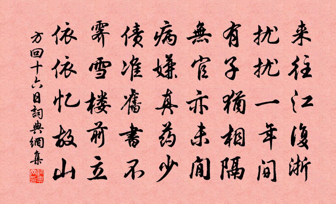 詩詞名句歷史字典書法欣賞書法字典國語詞典說文解字康熙字典古漢語字典標 題 作 者 詩 句 十六日作者:方回 朝代:宋代十六日原文來往江復浙,擾擾一年間。有子猶相隔,無官亦未閒。病嫌真藥少,債準舊書不。霽雪樓前立,依依憶故山。詩詞問答問:十六日的作者是誰?答:方回問:十六日寫於哪個朝代?答:宋代方回十六日書法欣賞十六日書法作品詩詞推薦安仁樓間晚晴時送默齋伯回星江陳宗遠〔宋代〕已是悲秋客,那堪送遠人。亂山殘照慘,落葉晚風頻。去恨隨帆遠,回頭轉意親。明朝相憶處,鱗雁達情真。送沈光赴福幕(一作送福州從事)李洞〔唐代〕泉齊嶺鳥飛,雨熟荔枝肥。南斗看應近,北人來恐稀。潮浮廉使宴,珠照島僧歸。幕下逢遷拜,何官著茜衣。山居詩釋延壽〔宋代〕萬明從來一徑通,但緣分別便西東。遺簪只為情難盡,泣路方知意未窮。偃仰不拋青嶂裹,往來多在白雲中。平生雜興六首陸游〔宋代〕老無添虎仍逢病,春欲殘時未減寒。架上漢書渾忘盡,床頭周易卻常看。良耜佚名〔先秦〕畟畟良耜,俶載南畝。播厥百穀,實函斯活。或來瞻女,載筐及莒,其饟伊黍。其笠伊糾,其鎛斯趙,以薅荼蓼。問歌顰/雨中花令賀鑄〔宋代〕清滑京江人物秀。富美發、豐肌素手。寶子餘妍,阿嬌餘韻,獨步秋娘後。奈倦客襟懷先怯酒。問何意、歌顰易皺菩薩蠻汪莘〔宋代〕問言何處秋光好。當年曾過長洲道。一望沒遮攔。天寬水亦寬。也因輕靄掃。也傍斜暉討。指點與君看。畫他難不菩薩蠻(辛未七夕戲答張慶符)胡銓〔宋代〕銀河牛女年年渡。相逢未款還憂去。珠斗欲闌乾。盈盈一水間。玉人偷拜月。苦恨匆匆別。此意願天憐。今宵長似野步晚歸陸游〔宋代〕江村十日喜霜晴,草死泥乾拄杖輕。溝港淺來無鷺下,郊原暖處有牛耕。賓士久厭兒童戲,淪落偏知世俗情。欲向寄體休齊己〔唐代〕南州君去為尋醫,病色應除似舊時。久別莫忘廬阜約,卻來須有洞庭詩。金陵往歲同窺井,峴首前秋共讀碑。兩處呂公洞蕭德藻〔宋代〕復此經過三十年,唯應岩石故依然。城南老樹朽為土,檐外稚松青拂天。枕上功名祗擾擾,指端變化又玄玄。刀圭酹江月(賀楊誠齋)羅椿〔宋代〕郎星錦帳,忽翩然歸訪,南溪孤鶩。前日登高誰信道,壽酒重浮茱萸。風露杯寒,芙蓉帳冷,笑受長生籙。廣寒宮同俞季淵訪王修齋遇雨次季淵韻劉黻〔宋代〕投宿西山雨,搞論由群居。冥冥白霧深,誰臥隆中廬。夜坐陸游〔宋代〕地僻少行跡,屋低便老人。爐紅得清坐,酒緣慰孤斟。吠犬驚飄葉,棲禽換暗林。人問固多難,感慨不須深。減字木蘭花王千秋〔宋代〕陰檐雪在。小雨廉纖寒又。莫上危樓。樓迥空低雁更愁。一杯濁酒。萬事世間無不有。待早歸田。欲買田無使鬼贈趙當可王灼〔宋代〕元子稱漫浪,嚴生資苦勁。海內無賞音,秋風入衰鬢。東江一茅屋,但欲安性命。頗怪澤畔翁,煩詞寄天問。南軒松李白〔唐代〕南軒有孤松,柯葉自綿冪。清風無閒時,瀟灑終日夕。陰生古 * ,色染秋煙碧。何當凌雲霄,直上數千尺。游千山觀李曾伯〔宋代〕自重來嶺嶠,豈暇訪湖山。緹騎行邊了,戎旗護戍閒。相看群玉外,一笑六郎間。回首西風靜,何愁老漢關。和永叔柘枝歌梅堯臣〔宋代〕漁陽三疊音隆隆,紅蕖亂坼當秋風。披香擁霧出妖嫮,嫵眉壯發翩驚鴻。鏘鏘雜佩離芳渚,珠帽紅靴振金縷。相迎城外回,謝子蒙見諭元稹〔唐代〕十里撫柩別,一身騎馬回。寒煙半堂影,燼火滿庭灰。稚女憑人問,病夫空自哀。潘安寄新詠,仍是夜深來。名句推薦草木搖殺氣,星辰無光彩。李白《經亂離後天恩流夜郎憶舊遊書懷贈江夏韋太守良宰》 言無二貴,法不兩適。韓非及後人《韓非子·問辯》 卷峭寒萬里,平沙飛雪。吳文英《暗香疏影·夾鍾宮賦墨梅》 表獨立兮山之上,雲容容兮而在下;屈原《九歌》 故園腸斷處,日夜柳條新。宋之問《途中寒食題黃梅臨江驛寄崔融》 狐埋之而狐搰之,是以無成功。左丘明《國語·吳語·越王勾踐命諸稽郢行成於吳》 為無為,事無事,味無味。老子《老子·德經·第六十三章》 獨倚畫欄如有意,清砧怨笛送黃昏。曹雪芹《詠白海棠》 野臣潛隨擊壤老,日下鼓腹歌可封。鮑防《元日早朝行》 漸紅濕杏泥,愁燕無語。吳文英《掃花游·西湖寒食》