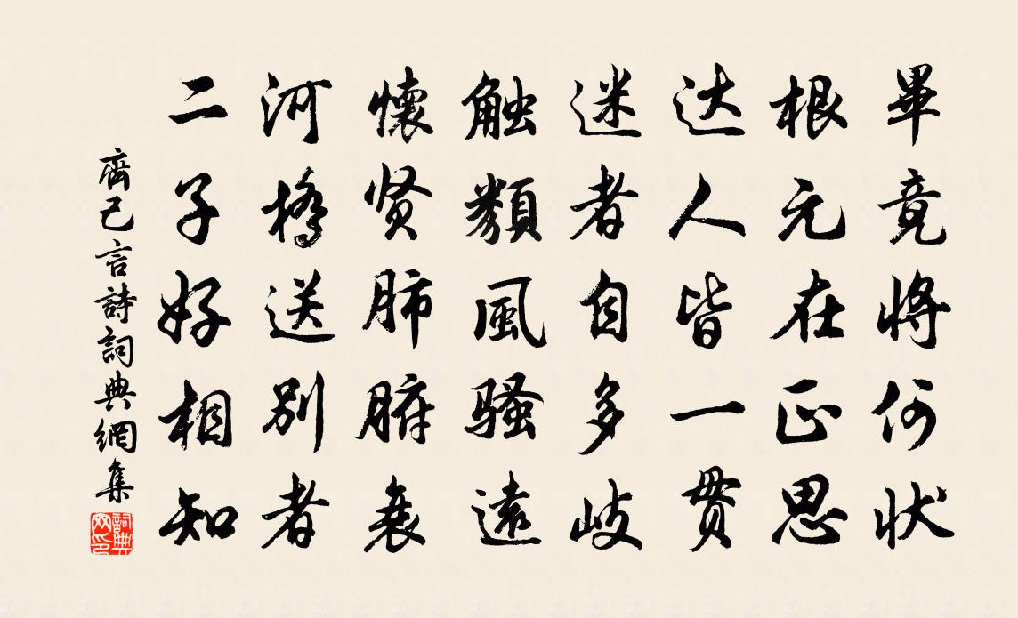 詩詞名句歷史字典書法欣賞書法字典國語詞典說文解字康熙字典古漢語字典標 題 作 者 詩 句 言詩作者:齊己 朝代:唐代言詩原文畢竟將何狀,根元在正思。達人皆一貫,迷者自多岐。觸類風騷遠,懷賢肺腑衰。河橋送別者,二子好相知。詩詞問答問:言詩的作者是誰?答:齊己問:言詩寫於哪個朝代?答:唐代問:言詩是什麼體裁?答:五律問:齊己的名句有哪些?答:齊己名句大全齊己言詩書法欣賞言詩書法作品注釋全唐詩:卷841-72詩詞推薦謝人送水仙趙蕃〔宋代〕珍重江南好事家,老將種蒔作生涯。似憐寂寞書齋里,折贈盈籃栗玉花。古鏡詞上劉侍郎貫休〔唐代〕至寶不自寶,照古還照今。仙人手胼胝,寥泬秋沈沈。不是十二面,不是百鍊金。若非八彩眉,不可輒照臨。即歸吳興舟中盧鉞〔宋代〕笠澤高風寒凜凜,苕溪凝雪白皚皚。扁舟我獨乘歸興,自是不因安道來。擁翠樓李燾〔宋代〕淳熙元年九月尾,菊未落英梅破蕊。從來兩美難必合,今忽得此一笑喜。人言地瘴物失時,進忌太蚤退苦遲。老夫清平樂 寄山居道人約看杏花張翥〔元代〕東風陣陣。第幾番春信。呆李痴桃訊息近。寫取鸞箋試問。君家楊柳牆東。杏花初吐生紅。好喚一床金雁,明朝來晚霽趙蕃〔宋代〕雨歇蟬聲抱木悲,茅檐獨立看雲移。一陰十日不見月,想見清光分外奇。喜雨投詹信州口號六首趙蕃〔宋代〕開藩甫及四十日,籍甚治聲過所聞。吏畏神明簡朱墨,民懷清淨樂耕耘。和子由四首 首夏官舍即事蘇軾〔宋代〕安石榴花開最遲,絳裙深樹出幽菲。吾廬想見無限好,客子倦遊胡不歸。坐上一樽雖得滿,古來四事巧相違。令人松王睿〔唐代〕寒松聳拔倚蒼岑,綠葉扶疏自結陰。丁固夢時還有意,秦王封日豈無心。常將正節棲孤鶴,不遣高枝宿眾禽。好是句丁亶〔宋代〕簾卷一番衡岳雨,帆開千艇洞庭風。奚帑院輓詞二首戴栩〔宋代〕歷官凡有幾,五駕令君車。健吏猶難色,儒生未必疏。廩飢祠有像,鄉飲禮成書。惜阻蒲輪召,申公八十餘。玉岩石刻胡榘〔宋代〕清獻濂溪二老仙,風流俯仰一時賢。摩挲石刻追前躅,坡叟遺文媿續鐫。寄懷唐彥謙〔唐代〕有客傷春復怨離,夕陽亭畔草青時。淚從紅蠟無由制,腸比朱弦恐更危。梅向好風惟是笑,柳因微雨不勝垂。雙溪理欲丘葵〔宋代〕理欲分明有兩途,何為捷徑世爭趨。豈愁今古無化論,長恨乾坤有腐儒。甘與徂為鬼怪,肯猶介甫接浮圖。從來逆六友詩寄林景雲留壽國林道初俞季淵清友劉黻〔宋代〕清友天賦完,歲晚樹獨暖。粲此白玉英,瑟彼清廟瓚。香自根中來,冰雪匪壓斷。一見一回老,殷勤呼茗碗。三十日乃耘老弟生朝余護客舟行高郵道中不勝虞儔〔宋代〕愛日初看一線遲,門弧喜氣又相隨。遙知綺席團欒處,正是蓬窗寂寞時。節愛堂中先遣信,富陽驛里舊吟詩。生涯登樓劉應時〔宋代〕圖書粲東壁,星斗下西樓。滿座襟懷爽,一輪風露秋。雲山遺古意,漢漢洗詩愁。更欲騎黃鶴,相隨汗漫遊。秋思王昌齡〔唐代〕閼氏黃葉落,妾望自登台。月出碧雲斷,單于秋色來。胡兵沙塞合,漢使玉關回。征客無歸日,空悲蕙草摧。[一予一病七十日心呈牢落作詩自解李呂〔宋代〕抱病懶巾櫛,自度作黃冠。披褐襟便短,拖鞋步稍安。忘機任俗薄,遮眼把書看。未必不為福,善乎能自寬。偈頌二百零五首釋正覺〔宋代〕卻請和尚道,三世諸佛也靠倒。釋迦師,淨名老,毗耶摩竭心相照。倦鶴夜移巢,靈蛇寒入草,正偏轉側兮妙圓兼名句推薦時有官船橋畔過,白鷗飛去落前灘。姜夔《釣雪亭》 柳色參差掩畫樓,曉鶯啼送滿宮愁。司馬扎《宮怨 / 閨怨》 畢竟年年用著來,何似休歸去。如晦《楚天遙過清江引·有意送春歸》 汴水流,泗水流,流到瓜州古渡頭。吳山點點愁白居易《長相思·汴水流》 斜陽草樹,尋常巷陌,人道寄奴曾住。辛棄疾《永遇樂·京口北固亭懷古》 良農不為水旱不耕,良賈不為折閱不市。荀子《荀子·修身》 芙蓉如面柳如眉,對此如何不淚垂。白居易《長恨歌》 君子務修其內而讓之於外。荀子《荀子·儒效》 攜籮驅出敢偷閒,雪脛冰須慣忍寒。范成大《雪中聞牆外鬻魚菜者求售之聲甚苦有感》 人以自是,反以相誹。呂不韋《呂氏春秋·覽·慎大覽》