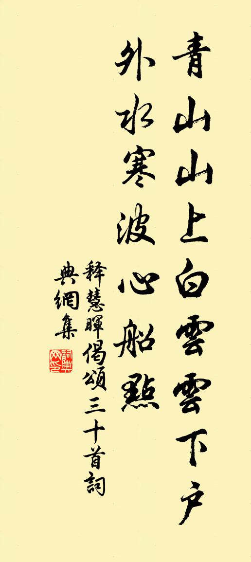 詩詞名句歷史字典書法欣賞書法字典國語詞典說文解字康熙字典古漢語字典標 題 作 者 詩 句 偈頌三十首作者:釋慧暉 朝代:宋代偈頌三十首原文青山山上,白云云下。戶外水寒,波心船點。詩詞問答問:偈頌三十首的作者是誰?答:釋慧暉問:偈頌三十首寫於哪個朝代?答:宋代釋慧暉偈頌三十首書法欣賞偈頌三十首書法作品詩詞推薦法曲獻仙音陳允平〔宋代〕油幕收塵,素紈招月,一枕苹香微度。枕玉牙床,浣冰金斛,薰風夜涼窗戶。漸睡醒、明河暗,芭蕉幾聲雨。對誰布袋贊釋紹曇〔宋代〕靠布袋坐,聽岩瀑笑。手把輪珠,數個什麼。內院拋離歲月深,啞,忘卻來時道。憶西湖張煌言〔明代〕夢裡相逢西子湖,誰知夢醒卻模糊。高墳武穆連忠肅,添得新祠一座無。春日呈韓文章甫〔宋代〕陽烏陰兔爭馳騁,人世光陰剎那頃。玉盤生菜亂青絲,三歲公家喫春餅。前年班春池陽城,民物熙熙簫鼓聲。去年鷓鴣天(不寐)辛棄疾〔宋代〕老病那堪歲月侵。霎時光景值千金。一生不負溪山債,百藥難治書史淫。隨巧拙,任浮沈。人無同處面如心。不妨趙振文傳借琉璃燈鋪寫山水人物一燭發明百巧葉適〔宋代〕古稱淨琉璃,物現我常寂。胡為自爭妍,照耀出痕跡。坐有求心客,駭目不忍看。願息終歲勞,留作袖手安。次韻奉送李季言四首張元乾〔宋代〕我輩避讒過避賊,此行能飽即須歸。山川久有真訊息,世上從渠閒是非。謝曉純送衲襪黃庭堅〔宋代〕剗草曾升馬祖堂,暖窗接膝話還鄉。贈行百衲兜羅襪,處處相隨入道場。皇后閣端午貼子詞五首真德秀〔宋代〕玉佩響瓊樓,天風五月秋。人間正炎熱,猶軫聖情憂。題汪水雲詩卷十一首劉師復〔宋代〕小小船齋闞碧流,水仙招我下湖游。簫聲嫋嫋歌聲合,桂子香中十里秋。荔枝台陳瓘〔宋代〕滿眼春花百鳥肥,絳苞丹艷大累累。台前采掇誰堪贈,譜外聲名世不知。顆小不堪妃子笑,味酸猶發少陵詩。高墳漁夫舞史浩〔宋代〕好景儂家披得去。前村雪屋雲深處。一棹清歌歸晚浦。真佳趣。知誰畫得歸縑素。次韻明仲幽居春來十首劉子翬〔宋代〕幽居十絕巧凌春,我亦刳腸強效顰。憂樂懸知不同調,山南山北寂寥人。奉和幸韋嗣立山莊侍宴應制(一作李乂詩)宋之問〔唐代〕樞掖調梅暇,林園藝槿初。入朝榮劍履,退食偶琴書。地隱東岩室,天回北斗車。旌門臨窈窕,輦道屬扶疏。雲罕東坡三絕句蘇籀〔宋代〕嶺背泉甘陵谷遷,危亭圜顧尚依然。春蘭秋菊無終古,地上居人世世賢。長孫十一東山春夜見贈楊諫〔唐代〕故人謝城闕,揮手碧雲期。溪月照隱處,松風生興時。舊林日雲暮,芳草歲空滋。甘與子成夢,請君同所思。次韻四叔父寄賀二叔父少監入館並見寄詩晁補之〔宋代〕琅邪太守魯儒英,典校還高劉更生。已似諸荀並才子,復如群竇占詩名。尚吟河水憐孤侄,應與鄉人痛伯兄。老鶴古離別黎廷瑞〔宋代〕迢遞君遠遊, * 妾孤傷。年年望君還,悠悠空斷腸。我願陵成江,有車不得襄。江復變為陸,無水通舟航。成江喜遷鶯·暑風涼月辛棄疾〔宋代〕謝趙晉臣敷文賦芙蓉詞見壽,用韻為謝。暑風涼月。愛亭亭無數,綠衣持節。掩冉如羞,參差似妒,擁出芙蓉花發詩一首張定千〔宋代〕況說龍沙最邊陲,關河阻隔遠明時。蕃戎把隘當路坐,何日申奏聖人知。今遇司空來宣問,枯林滋潤再生枝。四面名句推薦東風靜、細柳垂金縷。万俟詠《三台·清明應制》 小桃灼灼柳鬖鬖,春色滿江南。黃庭堅《訴衷情·小桃灼灼柳鬖鬖》 西風潑眼山如畫,有黃花休恨無錢。張可久《風入松·九日》 綠暗汀州三月暮,落花風靜帆收。晁補之《臨江仙·綠暗汀洲三月暮》 無端更渡桑乾水,卻望并州是故鄉。劉皂《旅次朔方 / 渡桑乾》 相思不管年華,喚酒吳娃市。吳文英《荔枝香近·送人游南徐》 金柳搖風樹樹,系彩舫龍舟遙岸。柳永《破陣樂·露花倒影》 烏啼鵲噪昏喬木,清明寒食誰家哭。白居易《寒食野望吟》 鄉村四月閒人少,才了蠶桑又插田。翁卷《鄉村四月》 曲徑穿花尋蛺蝶,虛闌傍日教鸚鵡。岳珂《滿江紅·小院深深》