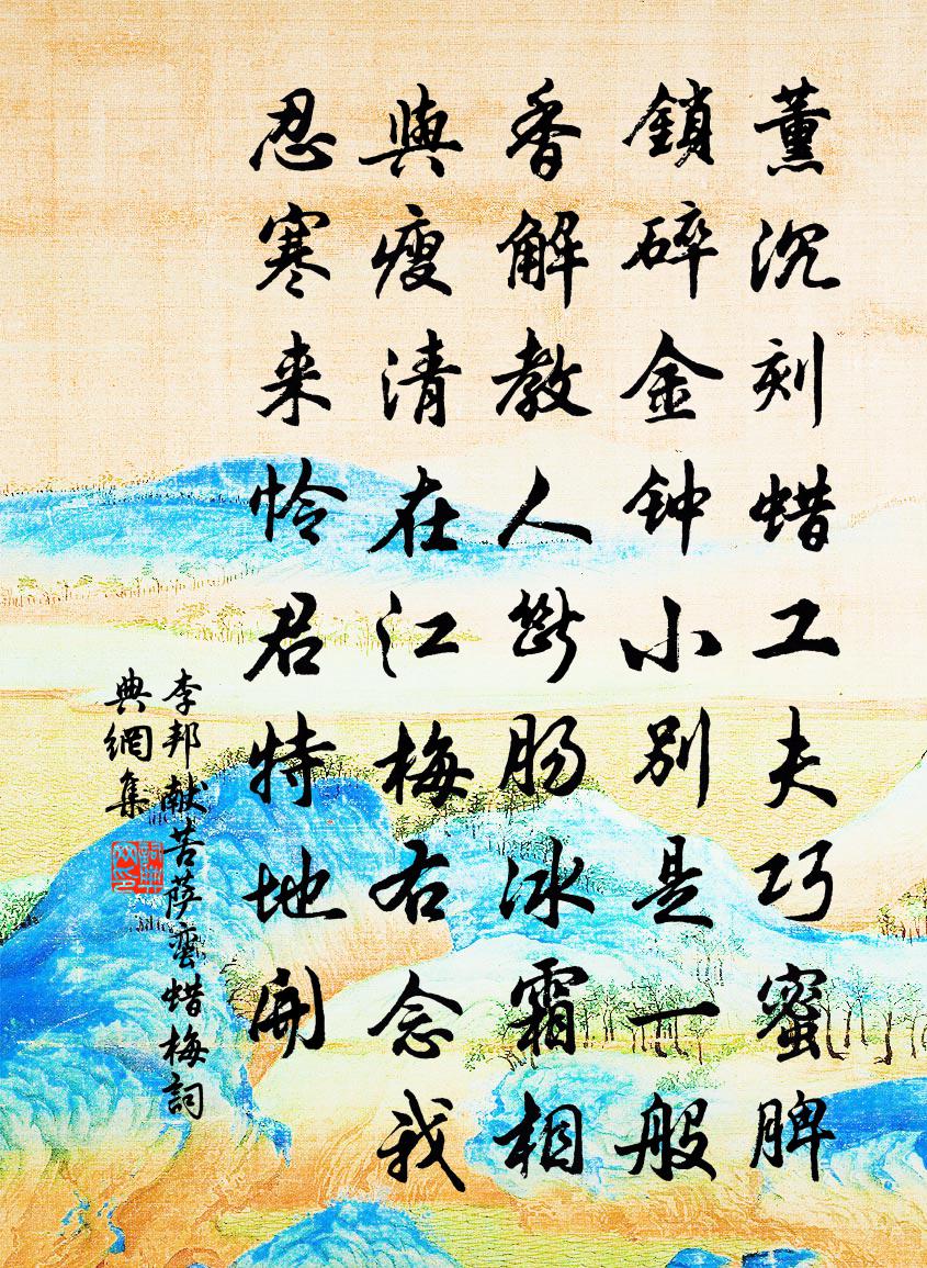 詩詞名句歷史字典書法欣賞書法字典國語詞典說文解字康熙字典古漢語字典標 題 作 者 詩 句 苦薩蠻(蠟梅)作者:李邦獻 朝代:宋代苦薩蠻(蠟梅)原文薰沉刻蠟工夫巧。蜜脾鎖碎金鐘小。別是一般香。解教人斷腸。冰霜相與瘦。清在江梅右。念我忍寒來。憐君特地開。詩詞問答問:苦薩蠻(蠟梅)的作者是誰?答:李邦獻問:苦薩蠻(蠟梅)寫於哪個朝代?答:宋代李邦獻苦薩蠻(蠟梅)書法欣賞苦薩蠻(蠟梅)書法作品詩詞推薦月窗寫悶白玉蟾〔宋代〕不分庭前柳,長啼月下烏。半生嗟命薄,中夜正心孤。勳業看雙鬢,歌吟在數須。從今閒草馬,休得更江湖。中原民謠造海船周麟之〔宋代〕造海船,海旁朴斲雷殷山。大船辟艦容萬斛,小船飛鶻何翩翩。傳聞潞縣燕京北,木柹翻空浪頭白。近年升作北通恭和御製玉津園宴射曾懷〔宋代〕名園佳氣靄非煙,冠佩朝宗似百川。五品並令陪宴射,四鍭端欲序賓賢。恩涵春意魚翻藻,威入秋聲雁落弦。竣事淨居照長老寫師像求贊釋正覺〔宋代〕真乘無門兮佛佛道同,面壁有句兮祖祖心空。靜居方外,智入環中。借功明寂默,借伴入樊籠。十方周匝,三世混次韻范有交秀才投贈二首項安世〔宋代〕頭顱看即已如斯,狡獪何能尚昔時。物自有情非我也,筆因隨意偶書之。不知風壑焉由籟,但見春林忽自枝。老去開歲連日有陰雨孫嵩〔宋代〕日日嵐陰守翠微,清溪平沒釣魚磯。流鶯一任無來意,直恐梅花半樹稀。利害吟邵雍〔宋代〕兔犬俱斃,蚌鷸相持。田漁老父,坐而利之。觀葬者權德輿〔唐代〕塗芻隨晝哭,數里至松門。貴盡人間禮,寧知逝者魂。笳簫出古陌,煙雨閉寒原。萬古皆如此,傷心反不言。判命坡范成大〔宋代〕鑽天嶺上已飛魂,判命坡前更駭聞。側足三分垂壞磴,舉頭一握到孤雲。微生敢列千金子,後福猶幾萬石君。早晚風入松万俟紹之〔宋代〕一春心事與誰同。綠聚眉峰。小樓徹夜聽鳴雨,想西園、錦繡成空。欄漾金魚池水,鉤閒紫燕簾風。年時忻折海棠春從天外來王吉昌〔元代〕名利如何。嘆六朝七國,五霸山河。幾多興廢,一夢南柯。光陰暗裡消磨。悟雲山煙水,好歸去、策杖披蓑。任春貴妃閣春帖子許應龍〔宋代〕賢哉淑德繼雞鳴,密贊關睢美化行。夙夜若為勤警戒,始終一念欲相成。客至杜甫〔唐代〕舍南舍北皆春水,但見群鷗日日來。花徑不曾緣客掃,蓬門今始為君開。盤餐市遠無兼味,樽酒家貧只舊醅。肯與駕言出北闕行陸機〔魏晉〕駕言出北闕。躑躅遵山陵。長松何鬱郁。丘墓互相承。念昔徂歿子。悠悠不可勝。安寢重冥廬。天壤莫能興。人生依韻酬章推官見贈范仲淹〔宋代〕姑蘇從古號繁華,卻戀岩邊與水涯。重入白雲尋釣瀨,更隨明月宿詩家。山人驚載烏紗出,溪女笑隈紅杏遮。來早喜姚郎中自杭州回賈島〔唐代〕路多楓樹林,累日泊清陰。來去泛流水,翛然適此心。一披江上作,三起月中吟。東省期司諫,雲門悔不尋。偈頌一百零九首釋可湘〔宋代〕洞山首座吃果子,開口落空亡。雪嶠兩堂吞栗蓬,分頭張意氣。衲僧家,手是秤,眼是秤,輕也知,重也知。半斤滿路花 贈兩山道友烏林答同監等王丹桂〔元代〕東南形勝地,極目鎖嵐煙。海山鍾異秀、產英賢。人多吉善,息念屏囂喧。是處追朋挹,探妙*真,共修物外因緣送盧秀才游潞府賈島〔唐代〕雨餘滋潤在,風不起塵沙。邊日寡文思,送君吟月華。過山乾相府,臨水宿僧家。能賦焉長屈,芳春宴杏花。春日雜賦陸游〔宋代〕江湖放浪水雲人,藥物枝梧夢幻身。移竹南窗初試筍,掃花北陌旋成塵。窮忙自笑常終日,老健猶能不負春。未遂名句推薦欲買桂花同載酒,終不似,少年游。劉過《唐多令·蘆葉滿汀洲》 馬蹄濃露,雞聲淡月,寂歷荒村路。張榘《青玉案·被檄出郊題陳氏山居》 上醫醫國,其次疾人左丘明《國語·晉語·醫和視平公疾》 潮打三更瓜步月,雨荒十里紅橋火。鄭燮《滿江紅·思家》 顧此耿耿存,仰視浮雲白。文天祥《正氣歌》 過江千尺浪,入竹萬竿斜。李嶠《風》 青女素娥俱耐冷,月中霜里斗嬋娟。李商隱《霜月》 垂楊低映木蘭舟。半篙春水滑,一段夕陽愁。晁補之《臨江仙·綠暗汀洲三月暮》 明日客程還幾許,沾衣況是新寒雨。納蘭性德《蝶戀花·又到綠楊曾折處》 雁聲遠過瀟湘去,十二樓中月自明。溫庭筠《瑤瑟怨》