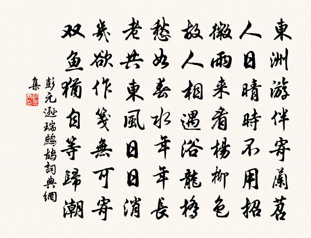詩詞名句歷史字典書法欣賞書法字典國語詞典說文解字康熙字典古漢語字典標 題 作 者 詩 句 瑞鷓鴣作者:彭元遜 朝代:宋代瑞鷓鴣原文東1/1洲遊伴寄蘭苕。人日晴時不用招。微雨來看楊柳色,故人相遇浴龍橋。愁如春水年年長,老1*1共東風日日消。幾欲作箋無可寄,雙魚猶自等歸潮。詩詞問答問:瑞鷓鴣的作者是誰?答:彭元遜問:瑞鷓鴣寫於哪個朝代?答:宋代問:瑞鷓鴣是什麼體裁?答:詞彭元遜瑞鷓鴣書法欣賞瑞鷓鴣書法作品詩詞推薦榆林郡歌王維〔唐代〕山頭松柏林。山下泉聲傷客心。千里萬里春草色。黃河東流流不息。黃龍戍上遊俠兒。愁逢漢使不相識。失調名李清照〔宋代〕猶將歌扇向人遮。水晶山枕象牙床。彩雲易散月長虧。幾多深恨斷人腸。羅衣消盡恁時香。閒愁也似月明多。直送趙彥輓詞林季仲〔宋代〕鐵面聲名滿九州,爾來孫子亦風流。怡雲自比陶弘景,下澤誰如馬少游。醉袖舞低千嶂月,鉤綸翻動五湖秋。可憐上鄂州韋尚書羅隱〔唐代〕往歲先皇馭九州,侍臣才業最風流。文窮典誥雖餘力,俗致雍熙盡密謀。蘭省換班青作綬,柏台前引絳為鞲。都緣江中望月盧照鄰〔唐代〕江水向涔陽,澄澄寫月光。鏡圓珠溜徹,弦滿箭波長。沉鉤搖兔影,浮桂動丹芳。延照相思夕,千里共沾裳。送呈班叔大名司戶司馬光〔宋代〕致遠必自近,如君豈掾曹。魚龍試春浪,松栝露秋毫。錯落辭華富,{左石右堅}{肱月換石}氣節高。垂天起膚和李邦直學士沂山祈雨有應蘇轍〔宋代〕宿雪雖盈尺,不救春夏旱。吁嗟遍野天不聞,歌舞通宵龍一戰。旋開雲霧布旌旗,復遣雷霆助舒捲。雨聲一夜洗塵念奴嬌(釣鰲台用東坡赤璧韻。台在亭頭海濱)陳紀〔宋代〕憑高眺遠,見淒涼海國,高秋雲物。島嶼沈洋萍幾點,漠漠天垂四壁。粟粒太虛,蜉蝣天地,懷抱皆冰雪。清風明禮香山湯禪師釋紹曇〔宋代〕寂寞空山宴坐時,千鈞重寄一絲危。直饒雙眼頻開合,著處由來不自知。贈故鄉人陳藻〔宋代〕我家已破出他鄉,如連如卓方阜昌。豈料囊金隨後散,一齊開鋪鬻文章。我今濱死祗如許,二友猶堪望軒翥。從頭從叔母楊氏輓詞蘇洵〔宋代〕老人凋喪悲宗黨,寒月淒涼葬舊林。白髮已知鄰里暮,傷懷難盡子孫心。幾年贈命涵幽壤,當有銘文記德音。千里侍宴桃花園詠桃花應制徐彥伯〔唐代〕源水叢花無數開,丹跗紅萼間青梅。從今結子三千歲,預喜仙遊復摘來。杖藜王安石〔宋代〕杖藜隨水轉東岡,興罷還來赴一床。堯桀是非時入夢,固知余習未全忘。歸仁縣石堠張嵲〔宋代〕縣廢不知年,無人問遺址。石堠猶路傍,故物應唯此。正釵聯句何遜〔南北朝〕竹台歸欲礙。花林出未通。度簪先分影。轉珥忽瞻風。雙橋耀寶鈿。闐闐密復叢。羞令掛纓闕。整插補余空。答文與可以六言詩相示因道濟南事作十首蘇轍〔宋代〕遠遊既為東魯,遷居又愛南山。齒髮自知將老,心懷且欲偷安。舜井溢流陌上,歷山近在城頭。羈旅三年忘去,故余過興州太守晁侯延之於東池晴碧亭且道其所文同〔宋代〕鄭谷題詩處,荒涼不復知。使群來問日,景物慾歸時。崖巘供清溜,亭台繞翠漪。主人憐過客,借與傲炎曦。題荷花畫屏張鎡〔宋代〕芙蓉世界水為宮,宴處鏗雙沸鼓鍾。後乘舞妃香十里,月寒誰見曉騎龍。離別相去辭先秦無名〔先秦〕躒躁摧長恧兮擢戟馭殳。所離不降兮泄我王氣蘇。三軍一飛降兮所向皆殂。一士判死兮而當百夫。道祐有德兮吳卒題和靖先生觀梅圖無懷上人徵予作仇遠〔宋代〕痴童癯鶴冷相隨,笑指南枝傍小溪。到處一般香影色,孤山只在斷橋西。名句推薦機心信隱,交接靡密,庶下者知威而畏也。來俊臣《羅織經·治下卷第三》 花開堪折直須折,莫待無花空折枝。杜秋娘《金縷衣》 已訴徵求貧到骨,正思戎馬淚盈巾。杜甫《又呈吳郎》 搖落深知宋玉悲,風流儒雅亦吾師。杜甫《詠懷古蹟五首·其二》 嫩寒鎖夢因春冷,芳氣籠人是酒香。曹雪芹《紅樓夢·第五回》 憶君遙在瀟湘月,愁聽清猿夢裡長。王昌齡《送魏二》 病骨支離紗帽寬,孤臣萬里客江乾。陸游《病起書懷》 置將不善,壹敗塗地司馬遷《史記·高祖本紀》 君以為易,其難也將至矣。左丘明《國語·晉語·郭偃論治國之難易》 萋萋春草秋綠,落落長松夏寒。王維《田園樂七首·其四》