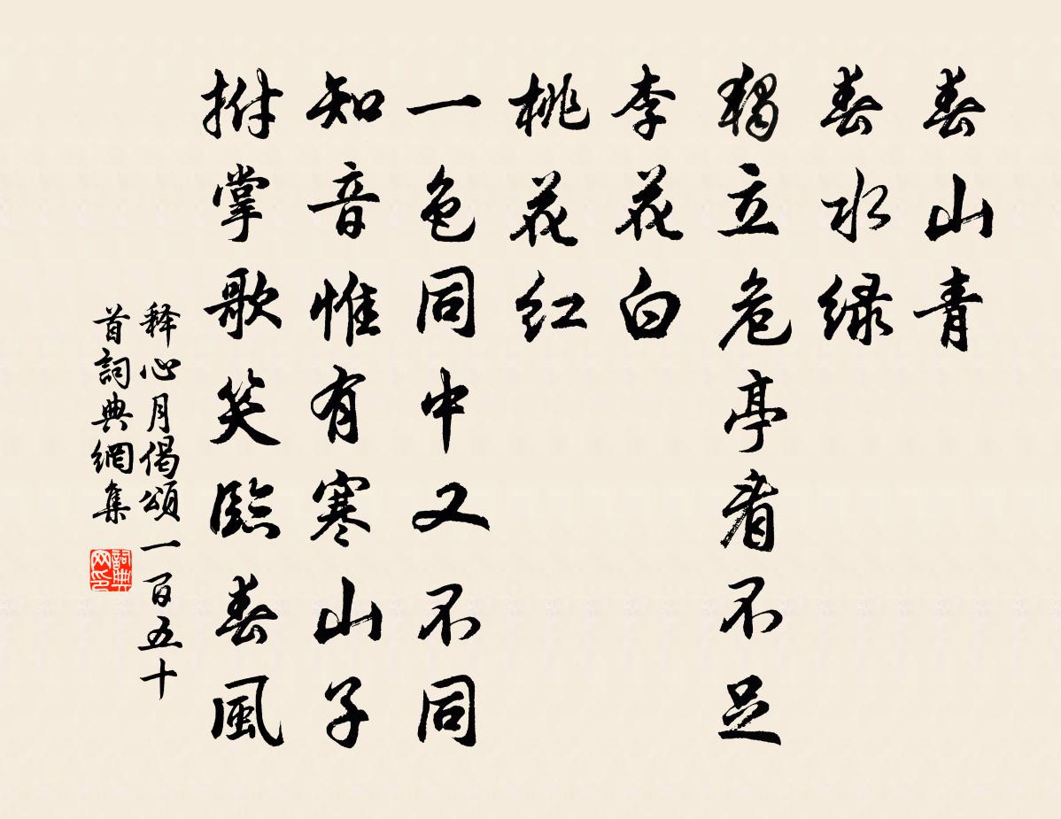 詩詞名句歷史字典書法欣賞書法字典國語詞典說文解字康熙字典古漢語字典標 題 作 者 詩 句 偈頌一百五十首作者:釋心月 朝代:宋代偈頌一百五十首原文春山青,春水綠,獨立危亭看不足。李花白,桃花紅,一色同中又不同。知音惟有寒山子,拊掌歌笑臨春風。詩詞問答問:偈頌一百五十首的作者是誰?答:釋心月問:偈頌一百五十首寫於哪個朝代?答:宋代釋心月偈頌一百五十首書法欣賞偈頌一百五十首書法作品詩詞推薦頌石頭和尚草庵歌釋印肅〔宋代〕壞不壞,百練金剛充法界。微塵不立似虛空,始得名為觀自在。記夢回文二首蘇軾〔宋代〕酡顏玉碗捧纖纖,亂點余花唾碧衫。歌咽水雲凝靜院,夢驚松雪落空岩。浣溪沙(用前韻再答幼安)葉夢得〔宋代〕綠野歌歡喜見分。驟驚和氣曉來勻。妙歌誰敢和陽春。梅蕊舊年迎臘雪,月華今夜破寒雲。獨醒爭笑楚人魂。同陣道原謁象之韓維〔宋代〕歊炎日為倦,休架一瀟灑。風竹來迎人,翠 * 傾寫。神交不前約,至理非外假。窅然天地間,誰是忘言者。初過大散關馬上作石介〔宋代〕柰何山色牽吟思,旋被江聲破睡魔。吟思睡魔兩相戰,誰知馬上有干戈。登宿覺庵徐照〔宋代〕雨過山庵樹色鮮,江城四月尚衣綿。本來行飯嘗新茗,又得憑欄看插田。漫成鄭俠〔宋代〕風送微涼來小戶,月回清景向疏窗。不如人世何珍麗,可與詩書氣味雙。省慈明禪師還而作偈釋谷泉〔宋代〕相別而今又斗年,不知誰共對談禪。一般秀色湘山里,汝自匡徒我自眠。和周元吉左司夢歸之韻楊萬里〔宋代〕半似清狂半白痴,不須人笑我心知。煙霞平日真成癖,山水中年卻語離。錯計浪隨雲出岫,感君能遣雨催詩。居然淮口阻雨張舜民〔宋代〕旱久不得雨,既雨不肯休。沄沄汴河水,初合淮河流。北來何處客,暫此駐扁舟。中有投荒人,萬里趨炎洲。聽水題寶山寺二首釋圓悟〔宋代〕寓此曾三夏,重來隔五年。溪山亦良是,懷想轉悽然。近吟衛宗武〔宋代〕歷歷疏林點暮鴉,幽幽雨砌菊猶花。浮雲卷盡四山碧,倚遍喬松待月華。寄茶與二劉劉子翬〔宋代〕然松煮鼎山泉冽,松旗一水分優劣。鳳餅推開雪照人,花瓷啜罷甘潮舌。大劉談天紫髯張,小劉逃禪清興長。會須敝車仇遠〔宋代〕汝自騎高馬,予寧坐敝車。功名輸俊茂,天地著迂疏。漫說痴人夢,仍看後世書。謫仙酒樓在,不醉欲何如。蘭朱熹〔宋代〕謾種秋蘭四五莖,疏簾底事太關情。可能不作涼風計,護得幽蘭到晚清。同劉監丞步觀長乾寺後諸園項安世〔宋代〕遊人塞道不容車,千古金陵少婦居。朱雀大桁春雨後,鳥衣深巷曉風初。紅紅白白花無數,下下高高意有餘。此景寓興賈島〔唐代〕真集道方至,貌殊妒還多。山泉入城池,自然生渾波。今時出古言,在眾翻為訛。有琴含正韻,知音者如何。一生相湖朱升之〔宋代〕世路羊腸淹客游,塵纓來此濯清流。半窗修竹翠含雨,一片澄湖冷清秋。地僻莓苔侵石几,機忘鷗鷺近漁舟。夜涼春從天上來姬翼〔元代〕身世蝸蠻。在一氣盈虛,宛轉循環。電光影里,石火星中,生滅如許時間。盡勞神膠擾,名與利、抵死相干。自摧和朱元晦九曲櫂歌歐陽光祖〔宋代〕仙掌峰邊仙浴堂,泉聲戛戛漱琳琅。流從六曲灘頭去,猶帶落花風裡香。名句推薦拔劍擊大荒,日收胡馬群。杜甫《後出塞五首》 志以淡泊明,而節從肥甘喪矣。洪應明《菜根譚·概論》 傷心闊別三千里,屈指思量四五年。韓偓《寒食日重遊李氏園亭有懷》 過頭飯好吃,過頭話難聽!佚名《增廣賢文·下集》 而今識盡愁滋味,欲說還休。辛棄疾《醜奴兒·書博山道中壁》 國危主憂,說者成伍,無益於安危也。商鞅《商君書·農戰》 斜月沉沉藏海霧,碣石瀟湘無限路。張若虛《春江花月夜》 楊花落盡子規啼,聞道龍標過五溪。李白《聞王昌齡左遷龍標遙有此寄》 落葉滿空山,何處尋行跡。韋應物《寄全椒山中道士》 雲邊雁斷胡天月,隴上羊歸塞草煙。溫庭筠《蘇武廟》