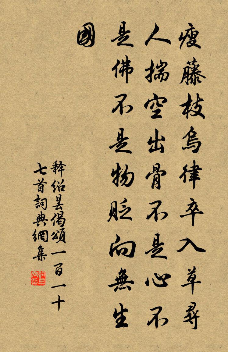 詩詞名句歷史字典書法欣賞書法字典國語詞典說文解字康熙字典古漢語字典標 題 作 者 詩 句 偈頌一百一十七首作者:釋紹曇 朝代:宋代偈頌一百一十七首原文瘦藤枝,烏律卒。入草尋人,揣空出骨。不是心不是佛不是物,貶向無生國。詩詞問答問:偈頌一百一十七首的作者是誰?答:釋紹曇問:偈頌一百一十七首寫於哪個朝代?答:宋代釋紹曇偈頌一百一十七首書法欣賞偈頌一百一十七首書法作品詩詞推薦鷓鴣天(和陳景衛憶西湖)胡銓〔宋代〕一憶西湖太瘦生。十年不到夢曾行。空濛山色煙霏晚,淡沲湖光霧縠輕。芳草遠,暮雲平。雨餘空翠入簾明。夢回廢居行徐照〔宋代〕北風蕭蕭胡馬鳴,邊人走盡空戶庭。黃金埋藏禾米棄,路上逐日空飢行。子西父南弗相守,仰面看日啼無聲。生身雨後堅山行之約衛宗武〔宋代〕水泛親堤蘸柳條,郊行喜有可人招。不堪白髮三千丈,莫負青春九十朝。鷗鷺何妨為伴侶,鵾鵬一任詫扶搖。山靈七歲作陸軫〔宋代〕昔時家住海三山,日月宮中屢往還。無事引來天女笑,謫來為吏在人間。書示同志方鳳〔宋代〕尚覺浮名累,樵漁寄此身。尋盟潛勗德,證業喜知新。氣誼生無間,文章合有神。毋徒涉城市,出處任風塵。水龍吟晁端禮〔宋代〕嶺梅香雪飄零盡,繁杏枝頭猶未。小桃一種,妖嬈偏占,春工用意。微噴丹砂,半含朝露,粉牆低倚。似誰家丱女景德朝日三首楊億〔宋代〕楝齊良潔,有牲斯純。大采玄冕,乃昭其文。王宮定位,粢盛苾芬。民事以化,盛德升聞。偈頌八十七首釋慧開〔宋代〕現種種形,說種種法。形法皆非,假名菩薩。更於諸相覓圓通,當人正眼俱戳瞎。溪上陸游〔宋代〕溪上秋來風露清,蕭然浴罷葛衣輕。看雲舒捲了窮達,見月虧盈知死生。老去關心惟藥裹,閒中消日付棋枰。故人上知府趙侍郎二首魏野〔宋代〕坐棠虛廟堂,俗亦似身康。藥按仙方煉,茶開御印嘗。吏因呈案懼,民為立碑忙。公退無餘事,逍遙只道裝。張上舍送望水偶成小詩杜范〔宋代〕我受東南隅,去海不逾咫。乘潮厭鮮美,望水快珍脆。朅來以溪上,河魚僅青鯉。泥滓漬膚肉,強食輒三噦。此物以湯餅招韓伯周王岩起二提舉鄭深道曾宏甫二曾幾〔宋代〕鏡湖淮瀆舊刺史,廬阜赤城新使君。敢持湯餅一取飽,更用尊酒重論文。玉川遣奴致雙鯉,吏部呼兒書八分。不如野花羅鄴〔唐代〕拂露叢開血色殷,枉無名字對空山。時逢舞蝶尋香至,少有行人輟棹攀。若在侯門看不足,為生江岸見如閒。結根正月十九日四更起讀朱文公年譜至天大明賦十方回〔宋代〕顛楊仆墨底蘇張,推挽時君可帝王。軻死不傳今再見,一時無數起臧倉。跋某人詩卷劉克莊〔宋代〕元祐賦律古,熙寧經義新。請君忙改藝,詩好誤終身。【雙調】山丹花佚名〔元代〕昨朝滿樹花正開,胡蝶來,胡蝶來。今朝花落委蒼苔,不見胡蝶來,胡蝶來。唐山范成大〔宋代〕勛唐遺德照清灣,百聖聞風不敢班。何物苦寒胡地鬼,二名猶敢廢堯山。嘯岩居士請釋祖欽〔宋代〕湖山影里,水月光中。似我非我,朦朦朧朧。春思范成大〔宋代〕沙際綠苹滿,樓前芳草多。風光入網戶,羅幕生繡波。前年花開憶湘水,去年花開淚如洗。園樹傷心三見花,依舊收復河湟故地文同〔宋代〕啞兒峽西山已塵,馱金輦帛無斷群。河湟故疆盡收復,解辮厥角歸如雲。堂中玉帶賜丞相,隴外金節酬將軍。唐兵名句推薦行得春風,指望夏雨馮夢龍《警世通言·卷二十五》 寒波淡淡起,白鳥悠悠下。元好問《潁亭留別》 莫見長安行樂處,空令歲月易蹉跎。李頎《送魏萬之京》 多才之士,才儲八斗;博學之德,學富五車。程登吉《幼學瓊林·卷四·文事》 兒女紛紛夸結束,新樣釵符艾虎。劉克莊《賀新郎·端午》 父母之年,不可不知也。一則以喜,一則以懼。孔子弟子《論語·里仁篇》 淮水悠悠。萬頃煙波萬頃愁。淮上女《減字木蘭花·淮山隱隱》 私行勝,則少公功。韓非及後人《韓非子·外儲說左下》 小樓昨夜又東風,故國不堪回首月明中。李煜《虞美人·春花秋月何時了》 問別來、解相思否。吳文英《惜秋華·七夕前一日送人歸鹽官》