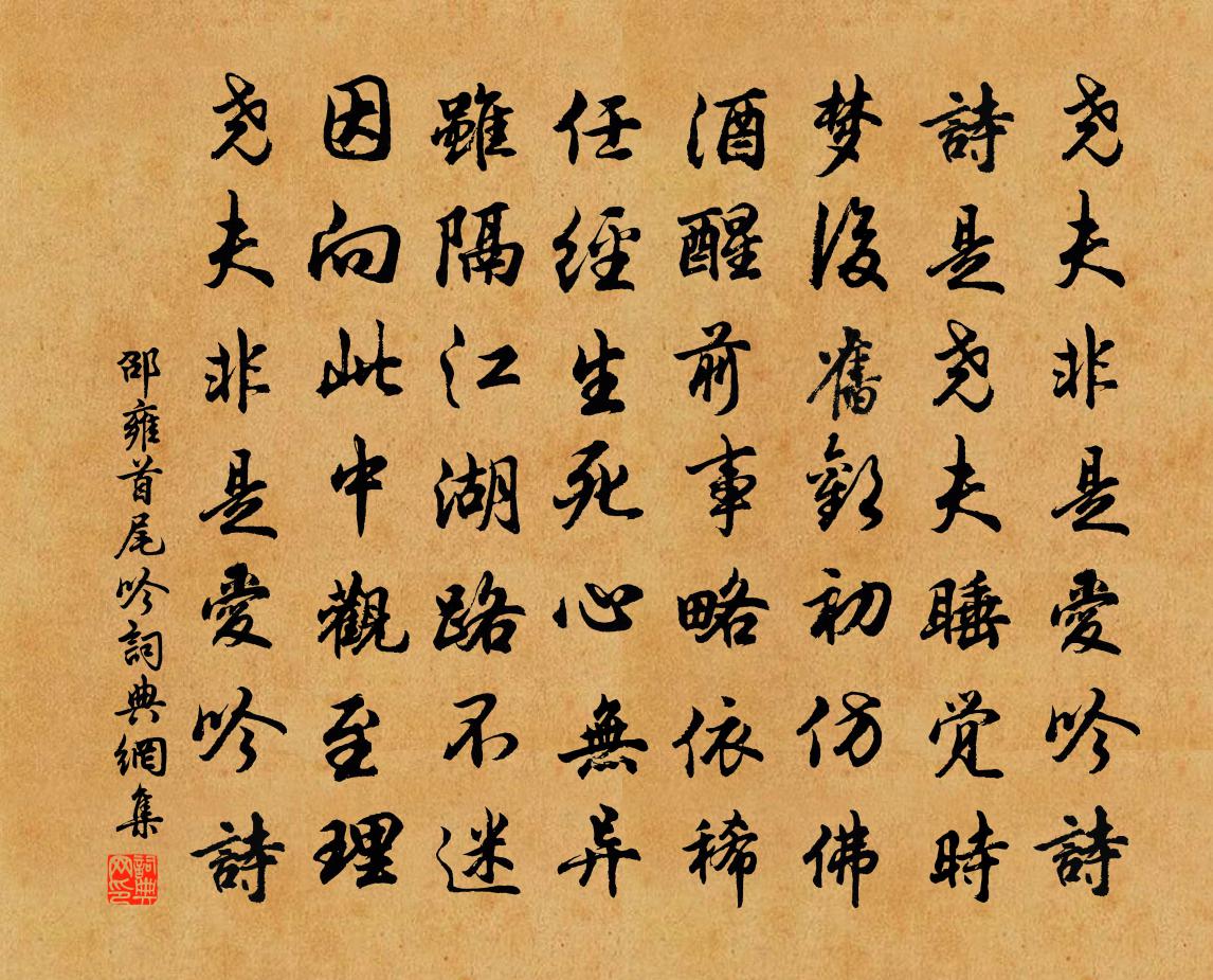 詩詞名句歷史字典書法欣賞書法字典國語詞典說文解字康熙字典古漢語字典標 題 作 者 詩 句 首尾吟作者:邵雍 朝代:宋代首尾吟原文堯夫非是愛吟詩,詩是堯夫睡覺時。夢後舊歡初仿佛,酒醒前事略依稀。任經生死心無異,雖隔江湖路不迷。因向此中觀至理,堯夫非是愛吟詩。詩詞問答問:首尾吟的作者是誰?答:邵雍問:首尾吟寫於哪個朝代?答:宋代邵雍首尾吟書法欣賞首尾吟書法作品詩詞推薦曹娥廟二首陳造〔宋代〕閱世誰無父,渠寧厭久生。驚波輕一死,森木竟雙塋。石壁千尋立,江流萬古清。祠宮拜遺像,猶復涕縱橫。亦好園海紅黃香梅著子戲成小詩喻良能〔宋代〕一枝濃艷倚東風,千葉輕黃點翠叢。占得娉婷仍結子,故應花果譜兼通。今歸周容〔宋代〕雞聲催櫓急,才到舊漁磯。月淡人爭渡,霜濃犬出扉。招魂思昨險,拭眼悟今歸。鄰叟牆頭問,應先淚濕衣。頌證道歌證道歌釋印肅〔宋代〕後人得道何窮數,萬別千差同此路。成人者少敗人多,達理契經無作做。入京施樞〔宋代〕何期又泛玉京船,行止於人不偶然。寒力勝如前兩夜,世情熟似近三年。只將興味留詩里,苦乏工夫到酒邊。萬事寄天台王鍊師兼呈邑宰張日損〔宋代〕百里淒清古縣城,阮郎陶令自相應。非無柳影含彭澤,別有花光勝武陵。間醉想同莎外石,冷吟知共夜深燈。紅塵十報恩馬鈺〔元代〕山侗九願報師恩。意淨心清路坦平。便把無為為造化,不憑有作作經營。恰如逗引龍和虎,還似般調奼與嬰。活樂偈釋宗鹽〔宋代〕送舊年,迎新歲,動用不離光影閃。澄輝湛湛夜堂寒,借問諸人會不會。若也會,增瑕纇。若不會,依前昧。與君六州歌頭(吊武穆鄂王忠烈廟)李訦〔宋代〕高皇神武,善駕馭豪英。攘北狄,驅群盜,命天膺。救蒼生。奈夢繞沙漠,隔溫情,屈和好,召大將,歸兵柄,列與曾侍郎曹勛〔宋代〕里巷風和遞曉騶,高軒見顧識英猷。揮犀唾不聞鄉語,對酒看花話舊遊。殊喜故家青玉案,方承大問翠雲裘。原持禪人寫真求贊釋正覺〔宋代〕是處分身,如谷之神。有應之月,無私之春。行將五路開雙手,一切門頭只個人。嘲劉文樹黃幡綽〔唐代〕可憐好個劉文樹,髭鬚共頦頤別住。文樹面孔不似猢猻,猢猻面孔強似文樹。雨陸游〔宋代〕家近蓬萊白玉京,草堂登望不勝清。初驚野色昏昏至,已見波紋細細生。殘醉頓消迎亂點,微吟漸苦入寒聲。只愁初夏王鎡〔宋代〕杜鵑啼老萬山紅,天氣於春便不同。半壁蕉雲收暑雨,一簾絮雪撲晴風。燕巢子出雕梁暖,蠶繭蛾生翠箔空。閒卻奉試詠青荊冬倩〔唐代〕路辟天光遠,春還月道臨。草濃河畔色,槐結路邊陰。未映君王史,先標胄子襟。經明如可拾,自有致雲心。蝶戀花歐陽修〔宋代〕畫閣歸來春又晚。燕子雙飛,柳軟桃花淺。細雨滿天風滿院。愁眉斂盡無人見。獨倚闌乾心緒亂。芳草芊綿,尚憶上丹霄王哲〔元代〕向終珠光南,成遭珠光遇,做風珠光狂。便游珠光歷海上嘉祥。閒閒得得,任從詞曲作詩章。自然神氣共交結,認宮詞宋白〔宋代〕太液春波淺盪舟,花如血點水如油。波臣莫織青絲網,自有銀輪翡翠鉤。句呂誨〔宋代〕料峭東風不易禁。錢處士李氏讖佚名〔唐代〕仿佛之間一倍楊。名句推薦問元戎早晚,鳴鞭徑去,解天山箭。元好問《水龍吟·從商帥國器獵於南陽同仲澤鼎玉賦此》 門外平橋連柳堤,歸來晚樹黃鶯啼。溫庭筠《春洲曲》 敗荷零落,衰楊掩映,岸邊兩兩三三,浣沙游女。柳永《夜半樂·凍雲黯淡天氣》 漫惹爐煙雙袖紫,空將酒暈一衫青。納蘭性德《浣溪沙·伏雨朝寒愁不勝》 只匆匆眺遠,早覺閒愁掛喬木。史達祖《八歸·秋江帶雨》 淑氣催黃鳥,晴光轉綠蘋。杜審言《和晉陵陸丞早春遊望》 君子必在己者,不必在人者也。呂不韋《呂氏春秋·覽·孝行覽》 腸已斷,淚難收。相思重上小紅樓。辛棄疾《鷓鴣天·晚日寒鴉一片愁》 路出寒雲外,人歸暮雪時。盧綸《李端公 / 送李端》 今朝北客思歸去,回入紇那披綠羅。劉禹錫《竹枝詞二首·其二》