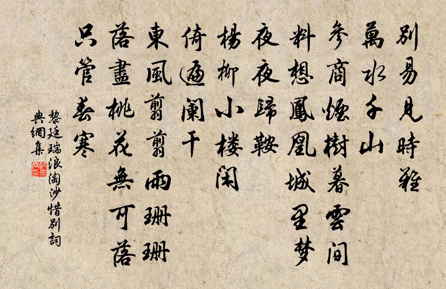 詩詞名句歷史字典書法欣賞書法字典國語詞典說文解字康熙字典古漢語字典標 題 作 者 詩 句 浪淘沙(惜別)作者:黎廷瑞 朝代:宋代浪淘沙(惜別)原文別易見時難。萬水千山。參商煙樹暮雲間。料想鳳凰城裡夢,夜夜歸鞍。楊柳小樓閒。倚遍闌乾。東風翦翦雨珊珊。落盡桃花無可落,只管春寒。詩詞問答問:浪淘沙(惜別)的作者是誰?答:黎廷瑞問:浪淘沙(惜別)寫於哪個朝代?答:宋代問:浪淘沙(惜別)是什麼體裁?答:詞黎廷瑞浪淘沙(惜別)書法欣賞浪淘沙(惜別)書法作品詩詞推薦少室南原元好問〔金代〕地僻人煙斷,山深鳥語嘩。清溪鳴石齒,暖日長藤芽。綠映高低樹,紅迷遠近花。林間見雞犬,直擬是仙家。石塔寺(並引)蘇軾〔宋代〕世傳王播《飯後鍾》詩,蓋揚州石塔寺事也。相傳如此,戲作此詩。飢眼眩東西,詩腸忘早晏。雖知燈是火,不悟留別宋處士戴叔倫〔唐代〕留歡方繼燭,此會豈他人。鄉里游從舊,兒童內外親。夜深愁不醉,老去別何頻。莫折園中柳,相看惜暮春。社日次韻方岳〔宋代〕邂逅治聾酒,春風免破除。燕來雙鬢雪,花覆一床書。野確生茨草,山盂飽飯蔬。宰平無此手,自覺老懷紓。次韻周朝宗六月十日泛湖周邦彥〔宋代〕君才切玉刀,一舉成兩段。我如摶沙礫,放手輒星散。傳聞紫貝闕,薜荔充帷幔。楚吟尚多亡,君詩補其半。答李曜吳圓〔唐代〕曳履優容日日歡,須言達德倍汍瀾。韶光今已輸先手,領得蠙珠掌上看。感舊陸游〔宋代〕醉眼常輕兒女曹,西遊對客尚能豪。縷金羯鼓龜茲樂,鏤玉琵琶邏逤槽。巫峽已回行雨夢,錦江空憶浣花遨。閒情乙巳秋暮獨酌陸游〔宋代〕孤雲系不定,野鶴籠難馴。賣藥句曲秋,沽酒天台春。中原幾流血,四海一閒人。邀月對我影,折花 * 巾,花月感皇恩(鎮江待閘)毛滂〔宋代〕綠水小河亭,朱闌碧甃。江月娟娟上高柳。畫樓縹緲,盡掛窗紗簾繡。月明知我意,來相就。銀字吹笙,金貂取酒梅花曲劉幾〔宋代〕結子非貪,有香不俗,宜當鼎鼐嘗。偶先紅紫,度韶華、玉笛占年芳。眾花雜色滿上林,未能教、臘雪埋藏。卻怕范才元道中雜興張元乾〔宋代〕名姓未能隨老變,政須卜宅近前峰。看君決策上對事,攬取奇勳銘鼎鍾。次黃提刑雪韻白玉蟾〔宋代〕久晴忽爾雨絲絲,既雨還晴亦不疑。滕六假寧催入局,趙衰迴避乞尋醫。搗霜碾雹些來個,剪水雕冰片子時。一夜雜詩四首黃庭堅〔宋代〕扁舟江上未歸身,明月清風作四鄰。觀化悟來俱是妄,漸疏人事與天親。雜詠一百首何蕃劉克莊〔宋代〕城去曾聯疏,宣收亦舉幡。向令無太學,安得有何蕃。莫思歸馮延巳〔唐代〕花滿名園酒滿觴,且開笑口對□芳。鞦韆風暖鸞釵□,綺陌春深翠袖香。莫惜黃金貴,日日須教貰酒嘗。頌古三十一首釋如本〔宋代〕親兒棄了復何言,月在波心印碧天。獨有一身無繫纍,困眠醒坐任隨緣。雨小人相凌王洋〔宋代〕負擔相隨笑同,不分強習弱便相攻。若無三尺齊民律,曠野何人是長雄。浣溪沙朱敦儒〔宋代〕才子佳人相見難。舞收歌罷又更闌。密將春恨系幽歡。結子同心香佩帶,帕兒雙字玉連環。酒醒燈暗忍重看。和利州鮮于轉運公劇八詠山齋司馬光〔宋代〕幽蹊入桃李,危棧蟠林麓。行行忽虛敞,高齋出山腹。園圃近指掌,效郭紛盈目。春老酴醾香,夏淺篔簹綠。條橫送人南歸李益〔唐代〕人言下江疾,君道下江遲。五月江路惡,南風驚浪時。應知近家喜,還有異鄉悲。無奈孤舟夕,山歌聞竹枝。名句推薦燕子飛時,綠水人家繞。枝上柳綿吹又少。蘇軾《蝶戀花·春景》 愚而好自用,賤而好自專。子思《中庸·第二十八章》 故國神遊,多情應笑我,早生華髮。蘇軾《念奴嬌·赤壁懷古》 憶年十五心尚孩,健如黃犢走復來。杜甫《百憂集行》 春雲不變陽關雪,桑葉先知胡地秋。李昂《從軍行》 風鳴兩岸葉,月照一孤舟。孟浩然《宿桐廬江寄廣陵舊遊》 武帝宮中人去盡,年年春色為誰來。岑參《登古鄴城》 明妃留在兩眉愁,萬古春山顰不盡元好問《玉樓春·驚沙獵獵風成陣》 當軒對尊酒,四面芙蓉開。王維《臨湖亭》 錢塘江上潮信來,今日方知我是我。施耐庵《水滸傳·第一百一十九回》