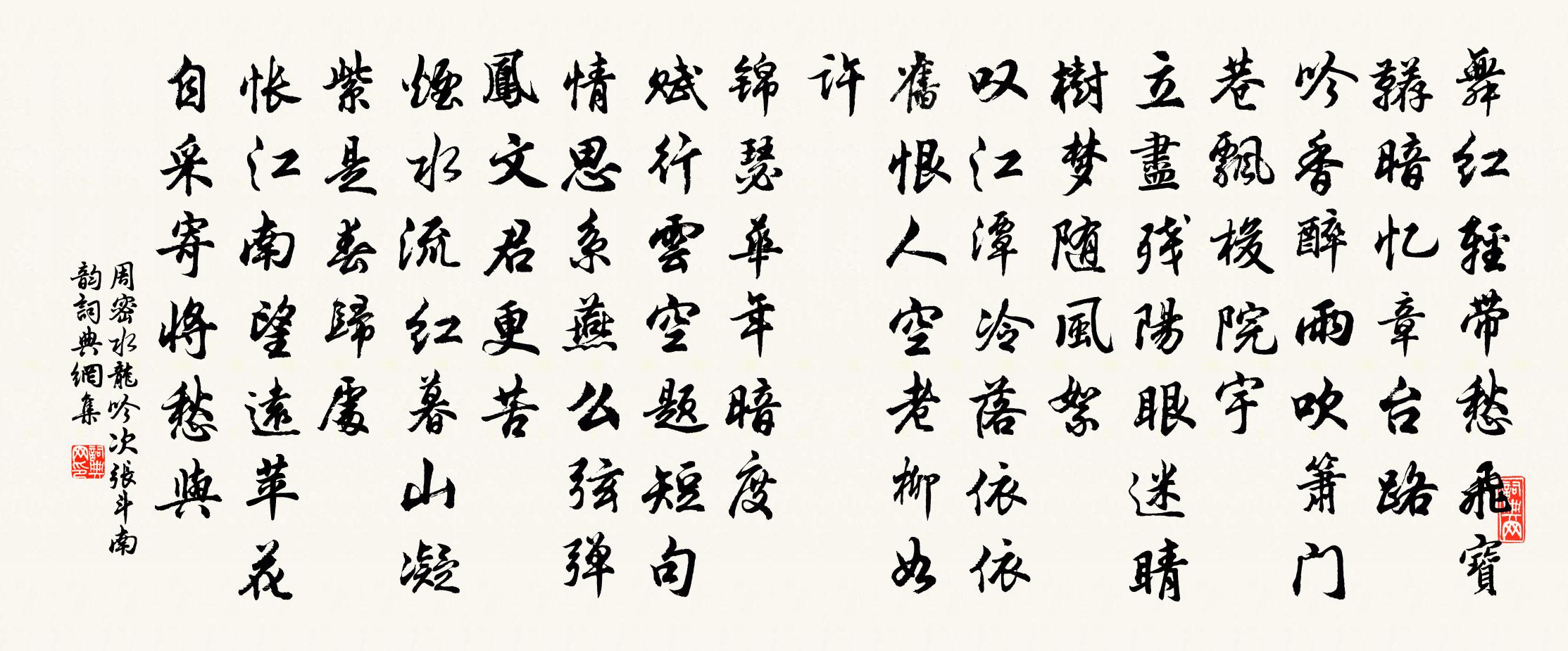 舞紅輕帶愁飛,寶韉暗憶章台路。吟香醉雨,吹1~1簫門巷,飄梭院宇。