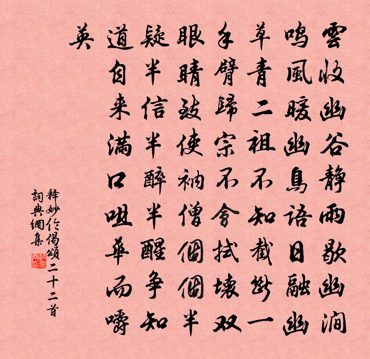 詩詞名句歷史字典書法欣賞書法字典國語詞典說文解字康熙字典古漢語字典標 題 作 者 詩 句 偈頌二十二首作者:釋妙倫 朝代:宋代偈頌二十二首原文雲收幽谷靜,雨歇幽澗鳴。風暖幽鳥語,日融幽草青。二祖不知,截斷一手臂。歸宗不會,拭壞雙眼睛。致使衲僧,個個半疑半信,半醉半醒。爭知道自來滿口,咀華而嚼英。詩詞問答問:偈頌二十二首的作者是誰?答:釋妙倫問:偈頌二十二首寫於哪個朝代?答:宋代釋妙倫偈頌二十二首書法欣賞偈頌二十二首書法作品詩詞推薦越城待旦戴表元〔宋代〕策策虛樓竹隔明,悲來輾轉向誰傾。天寒胡雁出萬里,月落越雞啼四更。為底朱顏成老色,看人青史上新名。清溪東門行張詠〔宋代〕茫茫六合生萬靈,周公孔子留賢名。伊余志尚未著調,秋風拔劍東門行。金龜典酒知是誰,逢君使我抬雙眉。眼前野堂陸游〔宋代〕野堂蕭颯雪侵冠,歷盡人間行路難。病馬不收菸草暝,孤桐半落井床寒。長瓶濁酒猶堪醉,敗篋殘編更細看。此興戴迪功輓詞樓鑰〔宋代〕好學數仍奇,躬行家遂肥。時將詩自樂,晚悟世俱非。教子惟黃卷,高門看綠衣。阿連悲未泯,無淚為君揮。競渡曲劉禹錫〔唐代〕沅江五月平堤流,邑人相將浮彩舟。靈均何年歌已矣,哀謠振楫從此起。楊桴擊節雷闐闐,亂流齊進聲轟然。蛟龍宮詞宋白〔宋代〕花萼樓高望柳堤,春橋橫水短虹蜺。五陵遊俠翩翩過,半脫朱袍斗錦雞。過金台天氣頓熱三首楊萬里〔宋代〕入到船中氣鬱蒸,出來船外日侵陵。綠波欲沸清何在,青蓋張來似不曾。西江月(送臘茶答王和父)夏元鼎〔宋代〕萬匯陽春吐秀,爭如雀舌含英。先天一氣社前升。啖出崑崙峰頂。要得丁公煅煉,飛成寶屑窗塵。蜜脾神用脫金形南鄉子·戊申秋雋喜晤高鶚〔清代〕甘露灑瑤池,洗出新妝換舊姿。今日方教花並蒂,遲遲,終是蓮台大士慈。明月照相思,也得姮娥念我痴。同到花詠史陸游〔宋代〕夜雨燈前感慨深,為邦一士重千金。風雲未展康時略,天地能知許國心。劍忽拄頤都將相,帽曾壓耳隱山林。英雄雙清亭郭印〔宋代〕鑿開蒼翠著幽亭,正取澄江一鏡半。嘉木千章垂倒影,支流三道咽寒聲。橋橫古路肩相屬,雲襯斜陽眼自明。竹色西江柳氏月江詩趙文〔宋代〕何人種此玻璃橘,掛在空高寒露濕。秋風吹墮清泠中,驚殺神髯夜深蟄。鈷鉧潭中豈無月,冷光長照衰羈泣。何如直釣岩李芮〔宋代〕無械仙翁去,岩垂直釣名。重開茅葦塞,仰見斗山明。便覺天光近,從教俗眼驚。登臨試一覽,心目得雙清。題思范軒二首張伯玉〔宋代〕天下儒宗不世勛,履聲今絕豈重聞。空餘逸韻傳流水,猶喜清風在此君。山倚孔祠分積翠,篆尋嚴瀨掛香雲。接花頌古一百首釋智愚〔宋代〕不設陷井,不揮雪刃一箭穿楊,神目不瞬。翻思昔日李將軍,射虎之機猶是鈍。松上人求古林釋紹曇〔宋代〕秀擢威音劫外春,靈根盤結幾何深。挺生臨濟清涼樹,盡大地人來息陰。浯溪鍾興嗣〔宋代〕羯奴禍唐室,宗社已傾危。翠華幸西蜀,大物孰主持。儲君起靈武,事亦從權宜。人望既有屬,奸孽就誅夷。次山送堅甫同年文同〔宋代〕春風吹雪滿西窗,此夜無人對酒缸。若到杭州見蘇子,為言常夢過松江。有約司馬光〔宋代〕黃梅時節家家雨,青草池塘處處蛙。有約不來過夜半,閒敲棋子落燈花。無盡橋郭印〔宋代〕曳杖徜徉去,仙家洞府中。寒流清自繞,幽徑密相通。著處亭皆穩,看來景不同。是名無盡藏,具眼悉和融。名句推薦還將兩行淚,遙寄海西頭。孟浩然《宿桐廬江寄廣陵舊遊》 久雨寒蟬少,空山落葉深。秘演《山中》 半壁見海日,空中聞天雞。李白《夢遊天姥吟留別 / 別東魯諸公》 萬種思量,多方開解,只恁寂寞厭厭地。柳永《憶帝京·薄衾小枕涼天氣》 雉雊麥苗秀,蠶眠桑葉稀。王維《渭川田家》 象龍喚不應,竹龍起行雨張孝祥《湖湘以竹車激水粳稻如雲書此能仁院壁》 日落波平。愁損辭鄉去國人。朱敦儒《採桑子·彭浪磯》 月出於東山之上,徘徊於鬥牛之間。蘇軾《前赤壁賦》 懷春情不斷,猶帶相思舊子。吳文英《丁香結·夷則商秋日海棠》 人情送匹馬,買賣不饒針!佚名《增廣賢文·下集》