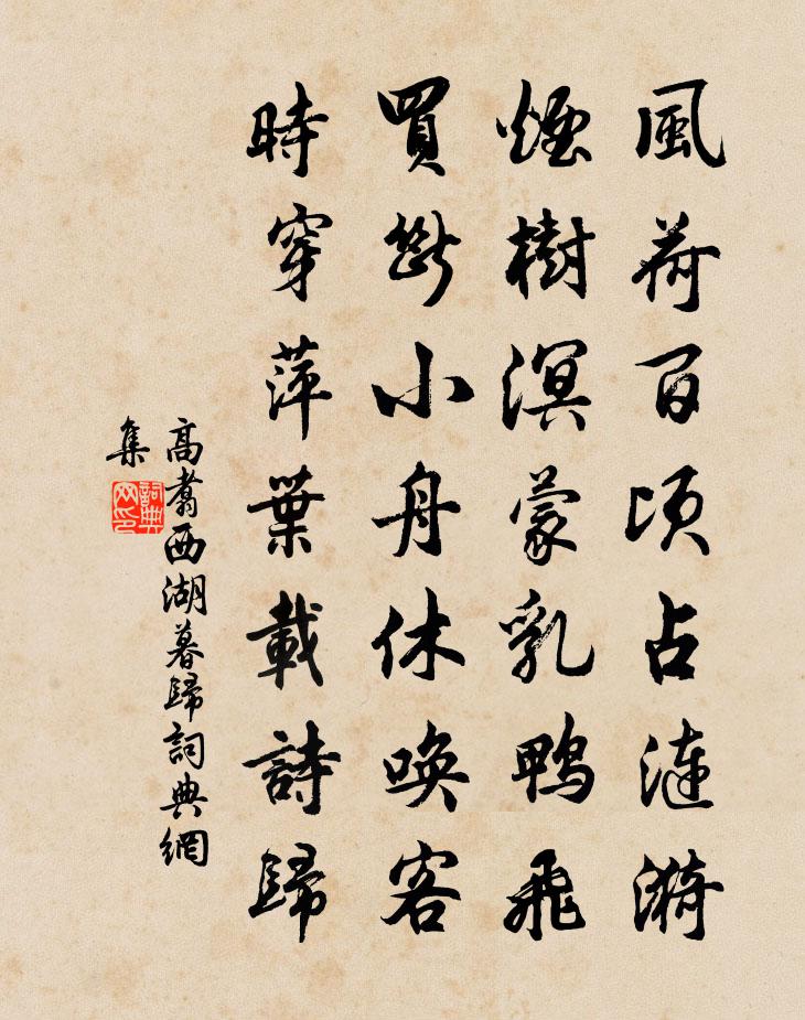 詩詞名句歷史字典書法欣賞書法字典國語詞典說文解字康熙字典古漢語字典標 題 作 者 詩 句 西湖暮歸作者:高翥 朝代:宋代西湖暮歸原文風荷百頃占漣漪,煙樹溟濛乳鴨飛。買斷小舟休喚客,時穿萍葉載詩歸。詩詞問答問:西湖暮歸的作者是誰?答:高翥問:西湖暮歸寫於哪個朝代?答:宋代高翥西湖暮歸書法欣賞西湖暮歸書法作品詩詞推薦逢靈道士護國〔唐代〕浮丘山上見黃冠,松柏森森登古壇。一莖青竹以為杖,數顆仙桃仍未餐。長安市里仍賣卜,武陵溪畔每燒丹。縮地青杏兒姬翼〔元代〕一氣貫寥寥。冥混里孰謂鵬蜩。千形萬狀隨空化,乾坤運轉,游塵野馬,都在扶搖。曳屣挈簞瓢。異玉食、肥馬金雨後釋行海〔宋代〕雨過山林近暮鍾,片懷寂寂對孤松。夜深笛怨梅花落,月照人間睡正濃。題泠然洞朱真人〔宋代〕不踏輕紅塵,扁舟寄此身。江湖雙短鬢,天地一閒人。換酒穿紅鯉,調羹芼紫蓴。醉來歌一曲,流韻滿青苹。明日復雨涼,再用韻范成大〔宋代〕濺瓦排檐散萬絲,顛狂風筱要扶持。恩深到骨吾能報,急賦新涼第一詩。疏影·梅影張炎〔宋代〕黃昏片月。似碎陰滿地,還更清絕。枝北枝南,疑有疑無,幾度背燈難折。依稀倩女離魂處,緩步出、前村時節。和於中丞登越王樓王嚴〔唐代〕雉堞臨朱檻,登茲便散愁。蟬聲怨炎夏,山色報新秋。江轉穿雲樹,心閒隨葉舟。仲宣徒有嘆,謝守幾追游。遠浦歸潮舒岳祥〔宋代〕遠眺滄洲十里強,早潮舉網夜鳴榔。倦遊不作吳松客,白髮歸來樂故鄉。次令衿游玉壺高詠十絕對換席羲叟〔宋代〕絕景頻因警句夸,莫傳俚耳便紛拿。須知味道耽岩穴,志意難將富貴加。次韻答樊山 其四王冕〔元代〕市廛餘熱惱,岩壑足清涼。水靜魚兒樂,風微桂子香。異邦人苦雨,故國雁啼霜。秋晚何多事?吟詩送客忙。七十八詠六言十首劉克莊〔宋代〕大絳縣人五歲,小魯申公二年。楞嚴已難筆受,尚書尚可口傳。題尹真人祠郎士元〔唐代〕窅窅雲旗去不還,陰陰祠宇閉空山。我來始悟丹青妙,稽首如逢冰雪顏。雨後晨起懷斯遠趙蕃〔宋代〕百鳥喧嘲工敗眠,靜聽黃鳥獨清圓。何雲絲竹不如肉,佳處政因出自然。夜抵德清縣偶題仲並〔宋代〕溪山奪目壯哉縣,風露侵肌老矣身。斷岸橫舟偏得月,小橋曳杖不逢人。成安道中懷寄馮惟逸賀鑄〔宋代〕蒼面黃須過壯時,欲投閒去兩難期。人生自是無根物,南北東西任所之。晨發故關寄逢吉司馬光〔宋代〕畫戟衣中趨絳帳,驛亭門外拂征鞍。已嗟漂泊三年別,更負從容十日歡。煖席未窮談笑樂,陟岡相望滯留難。楊鞭次韻何伯溫三首洪咨夔〔宋代〕出門夾徑松,春盡花滿林。毿毿塵尾黃,裊裊雲氣深。仙人左元放,騎龍夜相尋。飯我花杪露,實腹虛其心。落第後東遊留別皇甫冉〔唐代〕功成方自得,何事學乾求。果以浮名誤,深貽達士羞。九江連漲海,萬里任虛舟。歲晚同懷客,相思波上鷗。武陵春万俟詠〔宋代〕燕子飛來花在否,微雨退、掩重門。正滿院梨花雪照人。獨自個、怯黃昏。輕風淡月總消魂。羅衣暗惹啼痕。謾覷初冬山居即事十首吳芾〔宋代〕自笑謀生拙,空驚歲月除。年衰惟藉藥,發少不禁梳。盡日扃蓬戶,無人過草廬。晚來閒策杖,緩步當柴車。名句推薦桃李出深井,花艷驚上春。李白《中山孺子妾歌》 燕子巢方就,盆池小,新荷蔽。杜安世《鶴沖天·清明天氣》 西風來勸涼雲去,天東放開金鏡。史達祖《齊天樂·中秋宿真定驛》 酒是燒身硝焰,色為割肉鋼刀馮夢龍《警世通言·卷十一》 出不入兮往不反,平原忽兮路超遠。屈原《國殤》 又爭知、一字相思,不到吟邊。王沂孫《高陽台·殘萼梅酸》 客醉倚河橋,清光愁玉簫。高觀國《菩薩蠻·何須急管吹雲暝》 人生不相見,動如參與商。杜甫《贈衛八處士》 正其末者端其本,善其後者慎其先。房玄齡《晉書·列傳·第二十五章》 青春須早為,豈能長少年。孟郊《勸學》