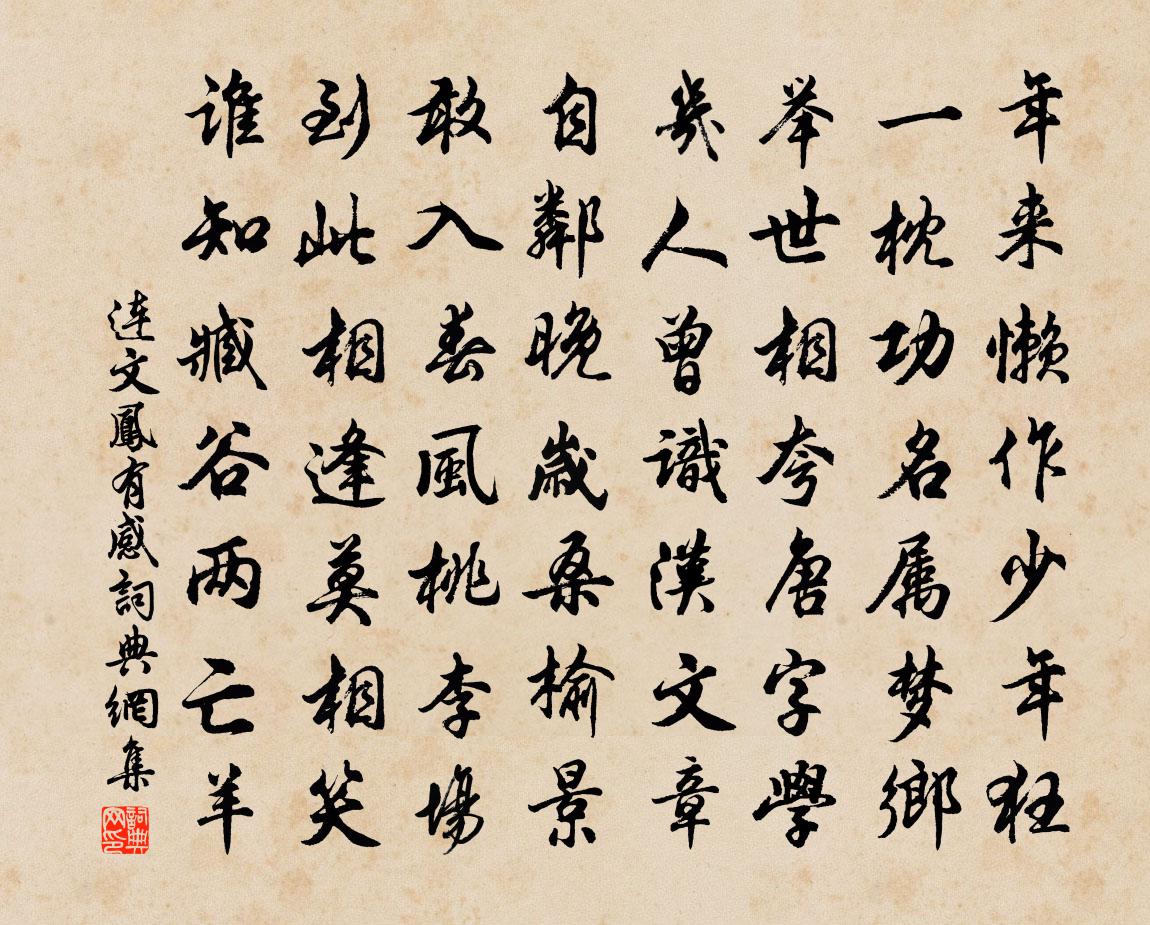 詩詞名句歷史字典書法欣賞書法字典國語詞典說文解字康熙字典古漢語字典標 題 作 者 詩 句 有感作者:連文鳳 朝代:宋代有感原文年來懶作少年狂,一枕功名屬夢鄉。舉世相夸唐字學,幾人曾識漢文章。自鄰晚歲桑榆景,敢入春風桃李場。到此相逢莫相笑,誰知臧谷兩亡羊。詩詞問答問:有感的作者是誰?答:連文鳳問:有感寫於哪個朝代?答:宋代連文鳳有感書法欣賞有感書法作品詩詞推薦題越觀和方孚若韻李曾伯〔宋代〕檐陰寂寂轉西遲,檢點春工倍費詩。煙樹郁蒼何處洞,雨苔斑駁舊人碑。清泉白石仙遊地,芳草綠陰晴晝時。目送贊佛眼和尚釋道行〔宋代〕因我得禮你,玄沙出窠臼,龍門與薦燈後。咄!句聞人武子〔宋代〕蹤跡共徘徊。高郵逢人約襄陽之游曾鞏〔宋代〕一川風月高郵夜,玉麈清談畫鷁舟。一時屠釣英雄盡,千載河山戰伐余。楚漢舊歌流俚耳,韓彭遺壁冠荒墟。可憐詠聲韋應物〔唐代〕萬物自生聽,太空恆寂寥。還從靜中起,卻向靜中消。送碧梧入府許月卿〔宋代〕人勸酒公入相,酒我勸公早酒歸。今以酒副樞入,好以元樞回。易為六經宗,學易貴知時。時止則時行,時義大矣題李氏敬聚堂家鉉翁〔宋代〕千載河間舊典刑,詩書習氣至今存。故家喬木知誰在,五世同居是義門。次徐相公韻十首入塞釋行海〔宋代〕血戰胡兒盡墮鞍,一番奏凱一封官。兵梟鐵鷂威方猛,酒賜金蕉膽不寒。雁塞月陰青燐淡,漁陽雪苦紫茸乾。胡亡送史同叔通判過霅川釋寶曇〔宋代〕莫嫌畫鷁北風瞋,苕霅溪聲解喚人。一日便拚千日醉,十分留得九分春。匣琴書卷先行李,虹星車旆委後塵。屈指沁園春 壽東泉郡公 漢文帝紀,初為郡守,為洪希文〔元代〕農樂豐年,擊壞西東,千倉腐紅。正火劑漫山,丹青炫轉,朱華冒水,雲錦繽紛。鍾秀燕山,分付壺嶠,鬱鬱蔥蔥挽周宣教宗沂二首廖行之〔宋代〕始別猶承笑語溫,昭暉相望幾晨昏。伻來駭德言傳異,淚哽悲懷飽不餐。歸拜文帷人已去,痛瞻靈室像徒存。反思戀繡衾陸游〔宋代〕無方能駐臉上紅。笑浮生、擾擾夢中。平地是、沖霄路,又何勞、千日用功。飄然再過蓮峰下,亂雲深、吹下暮鍾寄王道源胡仲弓〔宋代〕南來趨斗祿,出處最分明。不受吏塵觸,常依古道行。宦情雲樣薄,心事水邊清。待洗巢由耳,欹風聽鳳鳴。甘州/八聲甘州沈欽〔宋代〕有吳僧、醉倒墨池邊,西風暗吹芳。對蒼髯冷掛,龍珠萬顆,晴映經窗。卻似仙人黃鶴,笛里換時光。靜處觀生意攤聲浣溪沙(吳興僧舍竹下與王明之飲)毛滂〔宋代〕雨色流香繞坐中。映階疏竹一叢叢。不奈晚來蕭瑟意,子猷風。瀲灩滿傾金鑿落,淋漓從濕繡芙蓉。吸盡百川天上遊宦十年於外歸自浙東睹西山先塋周圍林木氣虞儔〔宋代〕萬畝墳山遍野陰,幾年樵採到如今。藩籬有限重加護,斤斧無端免見侵。缺處更須頻檢校,暇時何惜一登臨。先君家園即事十三首鄭清之〔宋代〕人心似鐵爐猶在,世事如棋路不移。閒著目光牛背上,英雄千古竟兒嬉。偈頌十七首釋智愚〔宋代〕晷運推移,日南長至。東海鯉魚,鼓腮振鬣。南山鱉鼻,伸眉吐氣。唯有趙州老兒沒意智,拖個破席日裡睡。淨慈江城子(席上賦)王質〔宋代〕細風微揭碧鱗鱗。繡幃深。不聞聲。時見推簾,籠袖玉輕輕。不似綺樓高卷幔,相指點,總分明。斜灣叢柳暗陰陰梅花喜神譜爛熳二十八枝宋伯仁〔宋代〕粉黛巧妝施,菱花還自照。底事不爭妍,又恐西施笑。名句推薦飛雪過江來,船在赤欄橋側。呂渭老《好事近·飛雪過江來》 若是前生未有緣,待重結、來生願。樂婉《卜運算元·答施》 淮南秋雨夜,高齋聞雁來。韋應物《聞雁》 辭君向天姥,拂石臥秋霜。李白《別儲邕之剡中》 音塵絕,西風殘照,漢家陵闕。李白《憶秦娥·簫聲咽》 居上不寬,為禮不敬,臨喪不哀,吾何以觀之哉?孔子弟子《論語·八佾篇》 自伐者無功;自矜者不長。老子《老子·道經·第二十四章》 一看腸一斷,好去莫回頭。白居易《南浦別》 泥落畫梁空,夢想青春語。吳文英《生查子·秋社》 明月如霜,好風如水,清景無限。蘇軾《永遇樂·彭城夜宿燕子樓》