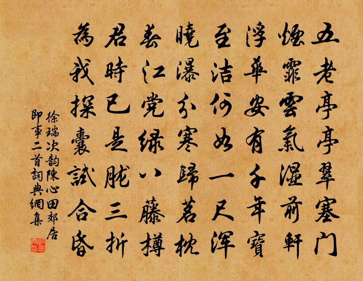 詩詞名句歷史字典書法欣賞書法字典國語詞典說文解字康熙字典古漢語字典標 題 作 者 詩 句 次韻陳心田郊居即事二首作者:徐瑞 朝代:宋代次韻陳心田郊居即事二首原文五老亭亭翠塞門,煙霏雲氣濕前軒。浮華安有千年寶,至潔何如一尺渾。曉瀑分寒歸茗枕,春江黨綠八藤樽。君時已是朧三折,為我探囊試合昏。詩詞問答問:次韻陳心田郊居即事二首的作者是誰?答:徐瑞問:次韻陳心田郊居即事二首寫於哪個朝代?答:宋代徐瑞次韻陳心田郊居即事二首書法欣賞次韻陳心田郊居即事二首書法作品詩詞推薦麥秀歌先秦無名〔先秦〕麥秀漸漸兮禾黍油油。彼狡童兮不與我好兮。村居感興楊朴〔宋代〕一壺村酒膠牙酸,十數胡皴徹骨乾。隨著四婆裙子後,杖頭挑去賽蠶官。臨川許月卿〔宋代〕臨川攝守得仁侯,閔兩精誠貫顯幽。五日不將京兆看,豐年惟切杜陵憂。先欣霢霂滋青稻,佇見滂沱漲碧流。物外東軒陸游〔宋代〕僻巷地無喧,閒人慮不煩。刺舟回北渚,岸幘倚東軒。乳鵲行苔徑,馴獐觸筍藩。作勞憐野老,喚取倒清樽。賦張寺丞樗寮釋道璨〔宋代〕樗寮先生千載士,草木有誰同臭味。外無刀斧斫削痕,中有冰霜不老氣。紅紫紛紛滿上林,我自無心趁桃李。蘇秦雲峰陳岩〔宋代〕有動皆從靜處生,嵐光正與晶爭熏。山靈要眩遊人眼,石縫中間旋出雲。北園籬外放步陸游〔宋代〕北園西出路逶迤,荊作門扉枳縛籬。鋤麥正忙人滿野,營巢未定鵲爭枝。招呼父老嘗新釀,約束兒童築壞陂。遇興詠狗蚤佚名〔唐代〕與虱都來不較多,zh挑筋斗太嘍羅。忽然管著一籃子,有甚心情那你何。句孫升〔宋代〕慈竹筍抽疑夏籜,木犀花發認春香。重陽日酬李觀皇甫冉〔唐代〕不見白衣來送酒,但令 * 自開花。愁看日晚良辰過,步步行尋陶令家。到荊州春物正佳樞使王公招宴歡甚已而幕府諸孫應時〔宋代〕華亭冠層城,滿城桃與李。微風散晴煙,七澤多春水。龍山集眄,章台見遺址。感物思無窮,對酒差可喜。以長歌意無極好為老夫聽為韻奉別沔鄂親友姜夔〔宋代〕宦達羞故妻,賤貧厭丘嫂。上書雲雨迥,還舍筍蕨老。江皋鋤帶經,決計恨不早。士無五羖皮,沒世抱枯槁。赴京初入汴口曉景即事先寄兵部李郎中杜牧〔唐代〕清淮控隋漕,北走長安道。檣形櫛櫛斜,浪態迤迤好。初旭紅可染,明河澹如掃。澤闊鳥來遲,村飢人語早。露蔓游叔虞祠張伯玉〔宋代〕廟中桐葉手中文,閒讀高碑拂素塵。異隴歸禾曾是主,徒林射兕獨留神。關河莫問周秦事,花木誰分漢魏春。惟有和堯夫首尾吟司馬光〔宋代〕堯夫非是愛吟詩,安樂窩中無所為。古道白頭無處用,今時青眼幾人知。嵩山洛水長相見,秋月春風不失期。筋力李花強至〔宋代〕地暖春才半,蹊深氣已暄。風光何處好,雪浪此時翻。勻似金刀翦,裝成玉杖繁。夭桃漫相壓,吏部竟誰言。臨平道贈同舟人皇甫冉〔唐代〕遠山誰辨江南北,長路空隨樹淺深。流蕩飄颻此何極,唯應行客共知心。皇后閣端午帖子許應龍〔宋代〕重午宮衣賜百工,香羅疊雪葛含風。誰知此日榮恩被,端自稱絲效繭功。挽劉大監思恭度正〔宋代〕簪紱源流遠,詩書氣味香。啼鶯翔澗谷,鳴鳳瑞朝陽。壯志欣辰告,羸軀痛夕亡。萬夫今失望,擬欲問蒼蒼。郊遊遇黃府女孫潘用中〔宋代〕誰教窄路恰相篷,脈脈靈犀一點通。最恨無情芳草路,匿蘭含蕙各西東。名句推薦處富貴之地,要知貧賤的痛癢;當少壯之時,須念衰老的辛酸。洪應明《菜根譚·概論》 一霎荷塘過雨,明朝便是秋聲。項鴻祚《清平樂·池上納涼》 朝見馬嶺黃沙合,夕望龍城陣雲起。盧思道《從軍行》 零落江南不自由。兩綢繆。料得吟鸞夜夜愁。姜夔《憶王孫·番陽彭氏小樓作》 相逢意氣為君飲,系馬高樓垂柳邊。王維《少年行四首》 明日相思莫上樓,樓上多風雨。游次公《卜運算元·風雨送人來》 日日望鄉國,空歌白薴詞。張籍《薊北旅思 / 送遠人》 新豐美酒斗十千,鹹陽遊俠多少年。王維《少年行四首》 雲開汶水孤帆遠,路繞樑山匹馬遲。高適《東平別前衛縣李寀少府 / 送前衛縣李宷少府》 江間波浪兼天涌,塞上風雲接地陰。杜甫《秋興八首·其一》