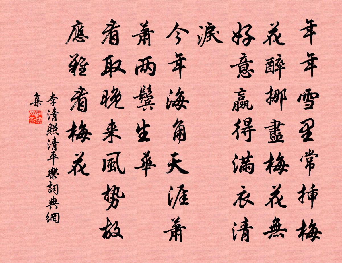 年年雪裡,常插梅花醉,挪盡梅花無好意,贏得滿衣清淚!今年海角天涯,蕭蕭兩鬢生華。看取晚來風勢,故應難看梅花。