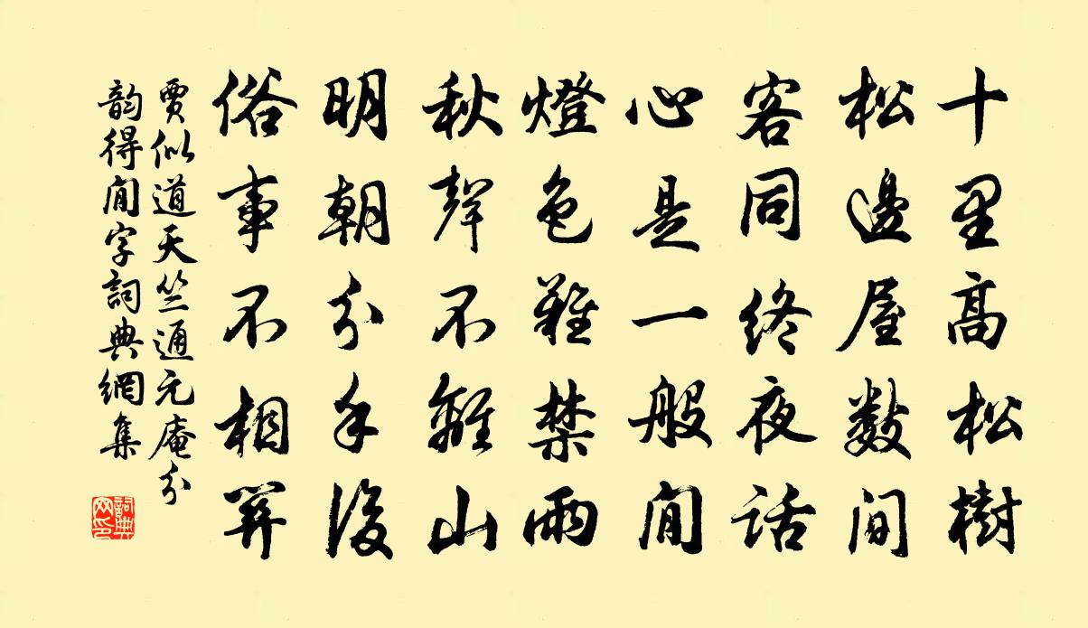 詩詞名句歷史字典書法欣賞書法字典國語詞典說文解字康熙字典古漢語字典標 題 作 者 詩 句 天竺通元庵分韻得閒字作者:賈似道 朝代:宋代天竺通元庵分韻得閒字原文十里高松樹,松邊屋數間。客同終夜話,心是一般閒。燈色難禁雨,秋聲不離山。明朝分手後,俗事不相關。詩詞問答問:天竺通元庵分韻得閒字的作者是誰?答:賈似道問:天竺通元庵分韻得閒字寫於哪個朝代?答:宋代賈似道天竺通元庵分韻得閒字書法欣賞天竺通元庵分韻得閒字書法作品詩詞推薦去春劉克莊〔宋代〕去春烽火照江邊,曾草軍書夕廢眠。萬里旌旗真屬命,一丘耕釣且隨緣。偶然謝客元非病,間亦尋僧不為禪。尚有生查子洪适〔宋代〕七月到盤洲,枕簟新涼早。岸曲側黃葵,沙際排紅蓼。團團歌扇疏,整整爐煙裊。環坐待橫參,要乞珠絲巧。秋蕊香·池苑清陰欲就晏幾道〔宋代〕池苑清陰欲就。還傍送春時候。眼中人去難歡偶。誰共一杯芳酒。 朱闌碧砌皆如舊。記攜手。有情不管別離久。萬年歡慢/萬年歡佚名〔宋代〕當今聖主,理化感四塞,永減狼煙。太平朝野無征戰,國內晏然。風調雨順歌聲喧。簫韶韻,九奏鈞天。願王永壽仙岩行白玉蟾〔宋代〕醉攜七尺霜前行,雲錦山前灣幾曲。溪頭秋雨添寒綠,蛟龍冷浸一壺玉。蓼花錦岸紅欲流,稻田高下鋪棋局。碧岩滿江紅(辛丑年假守沅州,蒙恩貶罷,歸次長沙道中作)呂勝己〔宋代〕憶昔西來,春已暮、余寒猶力。正迤邐、登山臨水,未嗟行役。雲笈偶尋高士傳,桃川又訪秦人跡。向此時、遊宦奉和送金城公主適西蕃崔日用〔唐代〕聖后經綸遠,謀臣計畫多。受降追漢策,築館計戎和。俗化烏孫壘,春生積石河。六龍今出餞,雙鶴願為歌。枕上得句寄潛君升胡仲參〔宋代〕無奈蓬窗雪打聲,夢魂才穩又還驚。枕食如許猶嫌冷,多少閻閭睡不成。生查子陸游〔宋代〕還山荷主恩,聊試扶犁手。新結小茅茨,恰占清江口。風塵不化衣,鄰曲常持酒。那似宦遊時,折盡長亭柳。籌思亭王安石〔宋代〕昔人何計亦何思,許國憂民適此時。寓興中園為遠趣,託名華榜有新詩。數株碧柳蒼苔地,一丈紅蕖淥水池。坐聽讀前輩詩文有感陸游〔宋代〕我無前輩千鈞筆,造物爭功謝不能。已分文章歸委靡,可憐意氣尚憑陵。鸞旗廣殿晨排仗,鐵馬黃河夜踏冰。此事感懷鄧深〔宋代〕一棹載愁歸,翩翩旅{方兆}飛。鶺鴒空自急,鴻雁失相依。水澀灘膠艇,風斜雨濕衣。感時無意緒,佇立暮煙霏贈琴僧知白梅堯臣〔宋代〕上人南方來,手抱伏犧器。頹然造我門,不顧門下吏。上堂弄金徽,深得太古意。清風蕭蕭生,修竹搖晚翠。聲妙謠俗詞曹操〔魏晉〕瓮中無斗儲,發篋無尺繒。友來從我貸,不知所以應。山莊書事方岳〔宋代〕晨興抹兩屨,為口見驅迫。課童督秋刈,野獲夜彭魄。田翁適過予,繿縷黑而瘠。具言土力貧,年登苦囏阨。一飯句崔覲〔宋代〕斷煙橫沔水,孤鶩入洋州。晚靄昏斜谷,晴陽靈斗山。江水不流廉節去,清名長解勝貪泉。豈知王子山前月,曾照春晏北園三首宋祁〔宋代〕日晏休塵慮,中園眷物華。驚禽曳啼去,弱柳受吹斜。暝早月沈碧,涼生水進涯。悠然望層堞,千翅度昏鴉。鶴鳴亭絕句四首辛棄疾〔宋代〕舊時秋水醉吟者,且作西山病叟呼。可惜黃花逢令節,樽中酒燥筆頭枯。賀新郎·輦路東風裡劉克莊〔宋代〕輦路東風裡。試回頭、金閨昨夢,侵尋三紀。歲晚巋然靈光殿,仆與君侯而已。漫過眼、幾番桃李。珠履金釵常滿壽定叟弟張栻〔宋代〕今年 * 開花早,手擷芳新壽一杯。不用南陽三十斜,家山根蒂好栽培。名句推薦登高壯觀天地間,大江茫茫去不還。李白《廬山謠寄盧侍御虛舟》 今日江頭兩三樹,可憐和葉度殘春。元稹《離思五首》 水晶簾外娟娟月,梨花枝上層層雪。楊基《菩薩蠻·水晶簾外娟娟月》 君使臣以禮,臣事君以忠。孔子弟子《論語·八佾篇》 漢月垂鄉淚,胡沙費馬蹄。岑參《磧西頭送李判官入京》 甘居人下者鮮。御之失謀,非犯,則篡耳。來俊臣《羅織經·治下卷第三》 人有氣、有生、有知,亦且有義,故最為天下貴也。荀子《荀子·王制》 明日隔山嶽,世事兩茫茫。杜甫《贈衛八處士》 出家人莫說在家話。吳承恩《西遊記·第三十二回》 素臣稱有道,守在於四夷。田錫《塞上曲》