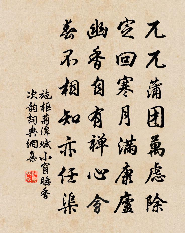 詩詞名句歷史字典書法欣賞書法字典國語詞典說文解字康熙字典古漢語字典標 題 作 者 詩 句 菊潭賦小窗睡香次韻作者:施樞 朝代:宋代菊潭賦小窗睡香次韻原文兀兀蒲1~1團萬慮除,定回寒月滿康廬。幽香自有禪心會,春不相知亦任渠。詩詞問答問:菊潭賦小窗睡香次韻的作者是誰?答:施樞問:菊潭賦小窗睡香次韻寫於哪個朝代?答:宋代施樞菊潭賦小窗睡香次韻書法欣賞菊潭賦小窗睡香次韻書法作品詩詞推薦和天慶觀瑞香花李覯〔宋代〕聞說仙花玉染紅,別留春色在壺中。瑤台若見飛瓊面,不與人間夢寐同。淮壖晁補之〔宋代〕淮壖日沒風卷沙,黃昏飛雪如落花。孤舟有客寒不飲,欹枕關篷夜憶家。雪飛篷底灑我額,篷隙虛明來曉色。紙屏寄李彥平吳芾〔宋代〕日佇同軒過,從容慰別離。已乖桂子約,還失菊花期。正爾思一面,忽然掀兩眉。聞君有召節,平步上丹墀。登樓釋紹嵩〔宋代〕二月春方好,登樓望欲迷。關情山簇簇,餘思草萋萋。小浦依林曲,長天向水低。鄉心正無限,恰恰一鶯啼。水亭寫興釋文珦〔宋代〕為愛幽亭枕碧流,乘閒於此對沙鷗。荷傾宿雨明珠碎,蒲颭輕風翠帶柔。列岫周遭疑雉堞,斷霞零落似汀洲。無人漁具詩罩陸龜蒙〔唐代〕左手揭圓罛,輕橈弄舟子。不知潛鱗處,但去籠煙水。時穿紫屏破,忽值朱衣起。貴得不貴名,敢論魴與鯉。思山居一十首思登家山林嶺李德裕〔唐代〕自知無世用,只是愛山游。舊有嵇康懶,今慚趙武偷。登巒未覺疾,泛水便忘憂。最惜殘筋力,捫蘿遍一丘。寄里中諸友賞菊二首姜特立〔宋代〕夢寐家園百裡間,秋來青蕊想班班。但得諸公為臨賞,也如老子對南山。好事近(生日詞)程大昌〔宋代〕日繹五千言,未說年齡可續。且得襟期蕭散,遠氛囂寵辱。鬢須白盡秀眉生,來伴老眸綠。人道雪霜林里,有翠松題朱銳雪景冊楊皇后〔宋代〕雪吹醉面不如寒,信腳千山與萬山。天甃瓊階三十里,更飛柳絮與君看。送僧見泉不庵釋智愚〔宋代〕大阿橫按血淋淳,鐵作心肝也皺眉。入得門來翻死款,不庵未必得饒伊。以酒渴愛江清作五小詩寄廖明略學士兼簡初和黃庭堅〔宋代〕斯人絕少可,白眼視公卿。每與俗物逢,三沐取潔清。我亦漫浪者,君何許同盟。試問盧溪叟,猶得多可名。登高張耒〔宋代〕懷不展兮居無聊,默誶語兮浩長謠。寫我心兮登彼高,陟萬仞兮捫九霄。命清風兮披浮雲,瞰四荒兮視天垠。大海殺氣不在邊孟郊〔唐代〕殺氣不在邊,凜然中國秋。道險不在山,平地有摧輈。河南又起兵,清濁俱鎖流。豈唯私客艱,擁滯官行舟。況余河廣佚名〔先秦〕誰謂河廣?一葦杭之。誰謂宋遠?跂予望之。誰謂河廣?曾不容刀。誰謂宋遠?曾不崇朝。泊大孤山作黃庭堅〔宋代〕匯澤為彭蠡,其容化◇鵬。中流擢寒山,正色且無朋。其下蛟龍臥,宮譙珠貝層。朝雲與暮雨,何處會高陵。不見望海潮陳德武〔宋代〕南冠一載,西流萬里,離懷孰不傷情。富貴邯鄲,雨雲巫峽,回頭一夢空驚。誰辱又誰榮。問當時道德,今日功名懷伊川郊居李德裕〔唐代〕衰疾常懷土,郊園欲掩扉。雖知明目地,不及有身歸。鞏樹秋陰遍,伊原霽色微。此生看白首,良願已應違。明月引(和白雲趙宗簿自度曲·引令)陳允平〔宋代〕雨余芳草碧蕭蕭。暗春潮。盪雙橈。紫鳳青鸞,舊夢帶文簫。綽約佩環風不定,雲欲墮,六銖香,天外飄。相思為首尾吟邵雍〔宋代〕堯夫非是愛吟詩,詩是堯夫處否時。信道而行安有悔,樂天之外更何疑。受疑始見周公旦,經阨方明孔仲尼。大聖名句推薦將壇醇酒冰漿細,元夜邀賓燈火新。趙時春《元宵飲陶總戎家二首》 雄州霧列,俊采星馳。王勃《滕王閣序》 穿針人在合歡樓,正月露、玉盤高瀉。嚴蕊《鵲橋仙·碧梧初出》 忍淚佯低面,含羞半斂眉。韋莊《女冠子·四月十七》 行行重行行,與君生別離。佚名《行行重行行》 遙想公瑾當年,小喬初嫁了,雄姿英發。蘇軾《念奴嬌·赤壁懷古》 日夕涼風至,聞蟬但益悲。孟浩然《秦中感秋寄遠上人 / 秦中寄遠上人》 千門萬戶曈曈日,總把新桃換舊符。王安石《元日》 光陰可惜,譬諸逝水。顏之推《顏氏家訓·勉學篇》 尊嚴而憚,可以為師荀子《荀子·致士》