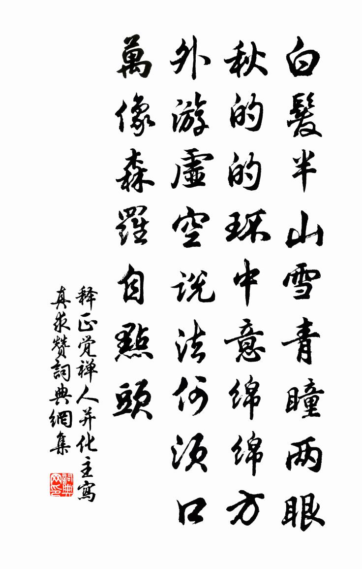 詩詞名句歷史字典書法欣賞書法字典國語詞典說文解字康熙字典古漢語字典標 題 作 者 詩 句 禪人並化主寫真求贊作者:釋正覺 朝代:宋代禪人並化主寫真求贊原文白髮半山雪,青瞳兩眼秋,的的環中意,綿綿方外游。虛空說法何須口,萬像森羅自點頭。詩詞問答問:禪人並化主寫真求贊的作者是誰?答:釋正覺問:禪人並化主寫真求贊寫於哪個朝代?答:宋代釋正覺禪人並化主寫真求贊書法欣賞禪人並化主寫真求贊書法作品詩詞推薦翠竹人家鄧深〔宋代〕戶外不平不肯流,短籬疏竹翠光浮。畦蔬繞舍畲田粟,一飽無求百不憂。摸魚子許有孚〔元代〕買陂花塘旋栽楊花柳,閒人花有此忙務。平泉綠野吾無羨,僅看一蓑煙雨。舟泊渚。更把釣觀魚,宛在池中嶼。掀清勝軒夜話白玉蟾〔宋代〕殘燈結花滿堂紅,酒興未已詩興濃。寒雲蠹星鎖翠空,一林幽竹夜呼風。逸士倚樓嘯玉龍,秋聲泣露落梧桐。把酒題笙羅鄴〔唐代〕筠管參差排鳳翅,月堂淒切勝龍吟。最宜輕動纖纖玉,醉送當觀灩灩金。緱嶺獨能征妙曲,嬴台相共吹清音。好將追賦畫江潭苑四首李賀〔唐代〕吳苑曉蒼蒼,宮衣水濺黃。小鬟紅粉薄,騎馬佩珠長。路指台城迥,羅薰褲褶香。行雲沾翠輦,今日似襄王。贈王漁山釋行海〔宋代〕冷觀天地只浮漚,勝水名山遍去游。書劍傳家拋弟侄,漁樵作隊賤公侯。臥聽瀑布分僧榻,醉插梅花上酒樓。篋里蠶婦辭陳普〔宋代〕東鄰採桑婦,西鄰養蠶女,年年役役為蠶苦。桐花如雪麥如雲,鳴鳩醉椹 * 雨。踏踏登竹梯,山煙鎖春樹。不管泊定海夜哭李鄴嗣〔清代〕我實愁來此,荒荒天地昏。悲風嘶虎石,毅鬼立蛟門。國史千年寄,臣心一日論。關河戎馬在,何地可招魂?偈頌七十八首釋正覺〔宋代〕即日貴人,舊家富漢。兄弟相成,尊賓互換。突曉途中眼不開,夜明簾外機旋轉。騎牛戴帽異中來,百鍊真金色不九日群公出遊郊外余方臥郡齋聽水因寄一絕呈寇準〔宋代〕菊老東籬人病酒,西風黃葉滿荒田。不知今日登高興,何似虛堂聽水眠。送范道卿赴省試晁公溯〔宋代〕君之先世真文雄,異時奏賦蓬萊宮。誰傳副墨過沙漠,至今猶稱長嘯公。芝蘭不乏後來秀,謂將褎然為舉首。至音初夏二首舒邦佐〔宋代〕盧橘金珠似,梅梅火齊如。燕銜春去後,蟬噪夏陰初。藥訪三年艾,心凝一束書。老身仍著病,節物最關渠。題鑒軒石延慶〔宋代〕一軒曾揭鑒為名,軒下方池徹底清。坐客不須頻拂拭,主人猶恐太分明。一塵不染原無物,萬象俱涵豈有情。堪笑送徐殿院回鄉林霆龍〔宋代〕三十年來人委靡,如今勁節似秋橫。三條鯁亮為時重,一葉翩翾去國輕。莘老不還司諫職,廖公應顯 * 名。遐沖詠露李正封〔唐代〕霏霏靈液重,雲表無聲落。沾樹急玄蟬,灑池棲皓鶴。流塵清遠陌,飛月澄高閣。宵潤玉堂簾,曙寒金井索。佳人晚皈再度西橋四首楊萬里〔宋代〕水落沙灘倍有情,漩來漩去不成行。暗叢飛下小瀑布,欄住溪聲獨作聲。白雲庵四首逍遙子〔宋代〕洞底草蒲綠作坡,松根況有茯苓多。自能飽飯太平日,不學式微歌浩歌。六言五首為倉部弟壽劉克莊〔宋代〕薄田足可躬稼,餘俸尚堪買山。家庭有個郊疇,姬院欠他素蠻。絕句夏完淳〔明代〕扁舟明月兩峰間,千頃蘆花人未遠。縹緲蒼茫不可接,白雲空翠洞庭山。已亥雜詩 231龔自珍〔清代〕九流觸手意縱橫,極動當筵炳燭情。若使魯戈真在手,斜陽只乞照書城。名句推薦料峭春寒中酒,交加曉夢啼鶯。吳文英《風入松·聽風聽雨過清明》 鈍學累功,不妨精熟顏之推《顏氏家訓·文章篇》 法莫如顯,而術不欲見韓非及後人《韓非子·難三》 俯視洛陽川,茫茫走胡兵。李白《古風·其十九》 看書須放開眼孔,做人要立定腳跟王永彬《圍爐夜話·第四二則》 我醉欲眠卿且去,明朝有意抱琴來。李白《山中與幽人對酌》 烽火連三月,家書抵萬金。杜甫《春望》 將軍玉帳貂鼠衣,手持酒杯看雪飛。劉基《北風行》 兩個黃鸝鳴翠柳,一行白鷺上青天。杜甫《絕句》 平生塞北江南,歸來華發蒼顏。辛棄疾《清平樂·獨宿博山王氏庵》