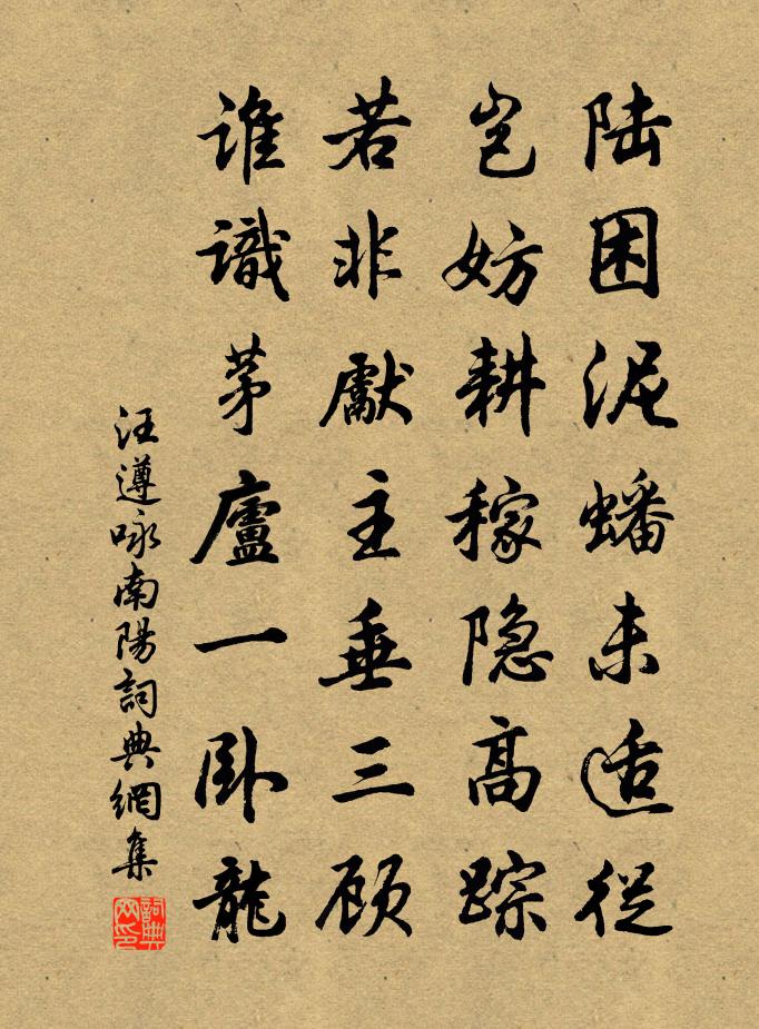 詩詞名句歷史字典書法欣賞書法字典國語詞典說文解字康熙字典古漢語字典標 題 作 者 詩 句 詠南陽作者:汪遵 朝代:唐代詠南陽原文陸困泥蟠未適從,豈妨耕稼隱高蹤。若非先主垂三顧,誰識茅廬一臥龍。詩詞問答問:詠南陽的作者是誰?答:汪遵問:詠南陽寫於哪個朝代?答:唐代問:詠南陽是什麼體裁?答:七絕汪遵詠南陽書法欣賞詠南陽書法作品注釋陸困泥蟠:指諸葛亮未出世之前猶如蛟龍困在泥土之中一樣。適從:既沒有機會施展抱負。耕稼:指《出師表》中諸葛亮“躬耕於南陽”。先主:指蜀漢昭烈皇帝劉備。臥龍:諸葛亮的號。詩文賞析這是一首詠古的七言絕句,作者以“三顧茅廬”的典故為題材,肯定了劉備尋訪賢才為國效力的誠摯心情,同時也慨嘆身逢亂世的人才報國無門的抑鬱。詩詞推薦晴色湖光唐寅〔明代〕紅霞瀲灩碧波平,晴色湖光盡不成。此際欄桿能獨倚,分明身是試登瀛。雨中遣興呈遠齋父子孫丈昆仲趙蕃〔宋代〕睡思昏然晝掩門,覺來山雨已翻盆。黃梅應熟騷人念,綠野可耕田父言。林外竹雞時自語,階前花鴨故相喧。詩材郡圃宋祁〔宋代〕側曲艷歌閒送日,晚花初葉暗留春。舞狂風蝶時過樹,啼熟林鶯不避人。送包通判兼寄滕季度葉適〔宋代〕風雨逍遙地,衙排印簏新。鈿車分路闊,寶瑟聽歌頻。燈市曉侵月,花田晚占春。卻過張翰宅,方信有閒人。卜運算元佚名〔宋代〕你為情多淚亦多。酬殷明佐見贈五雲裘歌李白〔唐代〕我吟謝朓詩上語,朔風颯颯吹飛雨。謝朓已沒青山空,後來繼之有殷公。粉圖珍裘五雲色,曄如晴天散彩虹。文章太上皇帝合端午帖子詞汪應辰〔宋代〕漏轉銅壺永,風來玉殿清。天申佳節近,比屋盡歡聲。送鹹安公主孫叔向〔唐代〕鹵簿遲遲出國門,漢家公主嫁烏孫。玉顏便向穹廬去,衛霍空承明主恩。白蓮池王之道〔宋代〕白蓮如玉人,高潔謝脂澤。圓荷作翠蓋,掩映秋水碧。小亭日相對,無言倚輕策。賀新郎劉學箕〔宋代〕往事何堪說。念人生、消磨寒暑,漫營裘葛。少日功名頻看鏡,綠鬢鬅鬙未雪。漸老矣、愁生華髮。國恥家讎何年絕句歐陽鈇〔宋代〕篷窗臥聽疏疏雨,卻是芭蕉夜半聲。煙浪蔽天天倚蓋,略容一點白鷗明。監宿同鄰幾賦韓維〔宋代〕浮雲吐寒月,餘霰清夜氣。蕭條廣文直,冷冽久不寐。所欣同心友,談笑亦來塈。高步南樓陰,清風散餘醉。仰看題李十四莊兼贈綦毋校書孟浩然〔唐代〕聞君息蔭地,東郭柳林間。左右瀍澗水,門庭緱氏山。抱琴來取醉,垂釣坐乘閒。歸客莫相待,緣源殊未還。詠荊軻柳宗元〔唐代〕燕秦不兩立,太子已為虞。千金奉短計,匕首荊卿趨。窮年徇所欲,兵勢且見屠。微言激幽憤,怒目辭燕都。朔風西湖游上人相訪於白沙翌日如金山求詩章甫〔宋代〕剝啄驚春睡,蕭然湖上僧。篝燈夜深語,多說鑒巴陵。沙頭雨(寓點絳唇)張輯〔宋代〕帶醉歸時,月華猶在 * 處。晚愁情緒。忘卻匆匆語。客里風霜,詩鬢空如許。江南去。岸花迎櫓。遙隔沙頭雨。訪友人庵居釋雲岫〔宋代〕好憶行盡眼重開,菜葉流金逐水來。莫謂間門容易掩,松邊有路不生苔。藤李嶠〔唐代〕吐葉依松磴,舒苗長石台。神農嘗藥罷,質子寄書來。色映蒲萄架,花分竹葉杯。金堤不見識,玉潤幾重開。文淵閣賜茶乾隆〔清代〕層閣文華殿後峨,昨春慶宴覺無何。具瞻楠架四庫貯,且喜芸編三面羅。十載春秋成不日,極天淵海尚餘波。待鈔游野航次元應韻三首李流謙〔宋代〕平地坐我帆檣中,翠峰出沒工為容。輕鷗舞晴水照影,蒼蛟吼浪雪薄胸。漁舠系月江一曲,樵斧斫雪山幾重。詩翁名句推薦夜吟敲落霜紅,船傍楓橋系。吳文英《荔枝香近·送人游南徐》 翰林風月三千首,寄與吳姬忍淚看。劉著《鷓鴣天·雪照山城玉指寒》 獨自下層樓,樓下蛩聲怨。程垓《卜運算元·獨自上層樓》 奢侈之敗家,猶出常情;而慳吝之敗家,必遭奇禍。王永彬《圍爐夜話·第五九則》 我居北海君南海,寄雁傳書謝不能。黃庭堅《寄黃幾復》 為我引杯添酒飲,與君把箸擊盤歌。白居易《醉贈劉二十八使君》 曲終漏盡嚴具陳,月沒星稀天下旦。佚名《雞鳴歌》 蕭蕭梧葉送寒聲,江上秋風動客情。葉紹翁《夜書所見》 刻薄成家,理無久享;倫常乖舛,立見消亡。朱柏廬《朱子家訓·全文》 它山之石,可以攻玉。佚名《鶴鳴》