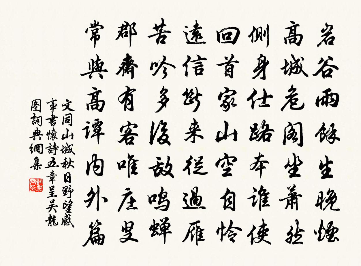 詩詞名句歷史字典書法欣賞書法字典國語詞典說文解字康熙字典古漢語字典標 題 作 者 詩 句 山城秋日野望感事書懷詩五章呈吳龍圖作者:文同 朝代:宋代原文岩穀雨餘生晚煙,高城危閣坐蕭然。側身仕路本誰使,回首家山空自憐。遠信斷來從過雁,苦吟多後敵鳴蟬。郡齋有客唯莊叟,常與高譚內外篇。詩詞問答問:《山城秋日野望感事書懷詩五章呈吳龍圖》的作者是誰?答:文同問:該詩寫於哪個朝代?答:宋代書法欣賞山城秋日野望感事書懷詩五章呈吳龍圖書法作品詩詞推薦偶成陳著〔宋代〕赤日途中嚼冰雪,紅塵城外見林泉。一時邂逅猶快意,十載清閒我謝天。送王秘書歸江東耿湋〔唐代〕回首望知音,逶迤桑柘林。人歸海郡遠,路入雨天深。萬木經秋葉,孤舟向暮心。唯餘江畔草,應見白頭吟。三山先賢祠落成八首熊禾〔宋代〕共惟無極翁,混元再開闢。關洛與考亭,杲杲行世日。惟此五大賢,人極賴以立。謂宜昭明薦,千古為令式。枕上四首呈子景舒劉宰〔宋代〕等閒游目送飛鴻,適意何妨酒一鄉。蓮社未應尋盛遠,竹林中亦著濤戎。黑青賈似道〔宋代〕黑者須當黑似漆,仔細看來無別色。更兼牙肚白如銀,名號將軍為第一。聞箏作劉子翬〔宋代〕月高夜鳴箏,聲從綺窗來。隨風更迢遞,縈雲暫徘徊。餘音若可玩,繁弦互相催。不見理箏人,遙知心所懷。寧悲次韻和安陸王工部郡圃早春宋庠〔宋代〕鄖波翻縠抱城流,夢比春風第一州。槁質枉陪溫樹密,勝襟還負峴亭游。風英百種紛如繡,溪羽千聲巧命儔。遙識宋江三十六贊龔開〔宋代〕有飛飛兒,出家尤好。與爾同袍,佛也被惱。舫齋晚憩范成大〔宋代〕心作萬緣起,境生千劫忙。誰同油幕靜,獨對篆煙長。有盡天魔力,無窮海印光。雨餘弦月上,塵界本清涼。滿江紅·翠幕深庭吳文英〔宋代〕翠幕深庭,露紅晚、閒花自發。春不斷、亭台成趣,翠陰蒙密。紫燕雛飛簾額靜,金鱗影轉池心闊。有花香、竹色瑞香三首范成大〔宋代〕一叢三百朵,細細拆濃檀。簾幕護花氣,不知窗外寒。秋江霽望許棠〔唐代〕高秋偏入望,霽景倍關情。落木滿江水,離人懷渭城。山高孤戍斷,野極暮天平。漁父時相問,羞真道姓名。再題龍泉寺上方方乾〔唐代〕牛斗正齊群木末,鳥行橫截眾山腰。路盤砌下兼穿竹,井在岩頭亦統潮。海岸四更看日出,石房三月任花燒。未能園蔬十詠韭劉子翬〔宋代〕肉食嘲三九,終憐氣韻清。一畦春雨足,翠發剪還生。旅中早秋劉威〔唐代〕金威生止水,爽氣遍遙空。草色蕭條路,槐花零落風。夜來萬里月,覺後一聲鴻。莫問前程事,颯然沙上蓬。謁金門陳雲厓〔宋代〕春晝永。接葉鳴禽相應。風定落紅香一徑。疏疏窗竹影。寂寞年時酒病。遠笛悠悠吹醒。閒上層樓天又暝。雲山青孤標上人留宿真山民〔宋代〕山僧留我宿,我亦似山僧。香茗半甌雪,寒虀一籌冰。廊風響黃葉,壁雨暗青燈。參透詩三昧,何須契一乘。攤破浣溪沙·菡萏香銷李璟〔唐代〕菡萏香銷翠葉殘,西風愁起綠波間。還與韶光共憔悴,不堪看。細雨夢回雞塞遠,小樓吹徹玉笙寒。多少淚珠無限和孔純老按屬邑六首王之道〔宋代〕客里宵寒夢易醒,起看殘月照窗明。招提正在山多處,過雨流泉碎玉鳴。袷饗太廟佚名〔宋代〕洪緒載德,盛際講畫。精崇袷事,恭展孝思。肸鄉錫義,齊莊受釐。猗歟聲烈,垂貺本支。名句推薦為有雲屏無限嬌,鳳城寒盡怕春宵。李商隱《為有》 生年不滿百,常懷千歲憂。佚名《生年不滿百》 天地之性,人為貴。 人之行,莫大於孝。孔子及其弟子《孝經·聖治》 采菱人語隔秋煙,波靜如橫練。王惲《平湖樂·采菱人語隔秋煙》 君子引而不發,躍如也。孟子《孟子·盡心章句上·第四十一節》 賈生年少虛垂淚,王粲春來更遠遊。李商隱《安定城樓》 孤燈寒照雨,濕竹暗浮煙。司空曙《雲陽館與韓紳宿別》 記得別伊時,桃花柳萬絲。納蘭性德《菩薩蠻·新寒中酒敲窗雨》 北斗七星高,哥舒夜帶刀。西鄙人《哥舒歌》 又是春將暮,無語對斜陽。葛長庚《水調歌頭·江上春山遠》