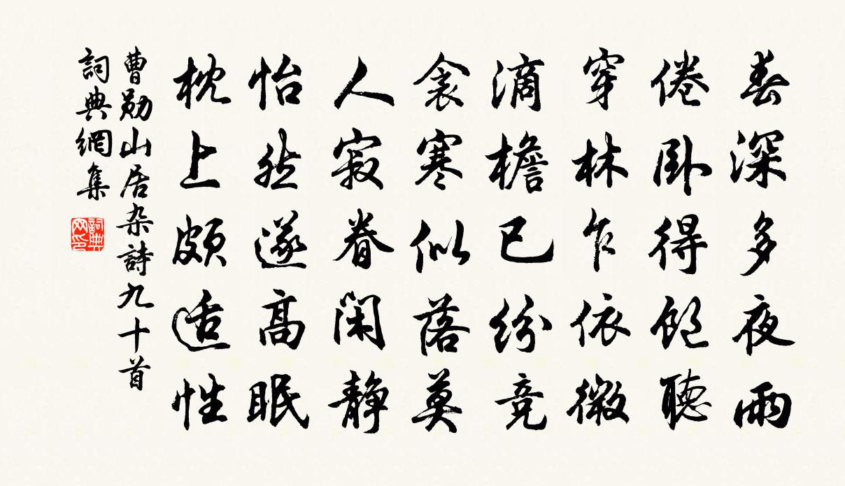 詩詞名句歷史字典書法欣賞書法字典國語詞典說文解字康熙字典古漢語字典標 題 作 者 詩 句 山居雜詩九十首作者:曹勛 朝代:宋代山居雜詩九十首原文春深多夜雨,倦臥得飽聽。穿林乍依微,滴檐已紛競。衾寒似落莫,人寂眷閒靜。怡然遂高眠,枕上頗適性。詩詞問答問:山居雜詩九十首的作者是誰?答:曹勛問:山居雜詩九十首寫於哪個朝代?答:宋代曹勛山居雜詩九十首書法欣賞山居雜詩九十首書法作品詩詞推薦相和歌辭。昭君詞戴叔倫〔唐代〕漢宮若遠近,路在沙塞上。到死不得歸,何人共南望。龍安院陳岩〔宋代〕蔓草叢生伴棘薪,古藤直上繞松身。寺前寺後清幽處,山鳥飛來不避人。新秋有感李中〔唐代〕門巷涼秋至,高梧一葉驚。漸添衾簟爽,頓覺夢魂清。暗促蓮開艷,乍催蟬發聲。雨降炎氣減,竹引冷煙生。戍客後天易吟三十首方回〔宋代〕震位東方木,胡為以帝言。一芽觀出處,主宰見天根。題圓通院趙蕃〔宋代〕吾家舊築爐峰宅,豈不懷歸困轉蓬。奔走微官遍林谷,卻尋清磬到圓通。清平樂陳師道〔宋代〕為改之曰官樣黃,作清平樂詞,且令方內知有此名也。重重疊疊。娜裊裙千襵。時樣官黃香百葉。一歲相逢兩節|寧鄉道上遇張伯聲戴復古〔宋代〕山禽調舌待舂哢,江雨收聲開曉晴。偶遇故人同杖履,梅花樹下一詩成。新豐主人儲光羲〔唐代〕新豐主人新酒熟,舊客還歸舊堂宿。滿酌香含北砌花,盈尊色泛南軒竹。雲散天高秋月明,東家少女解秦箏。醉來長沙勸耕真德秀〔宋代〕千金難買是鄉鄰,恩意相歡即至親。年若少時宜敬老,家才足後合憐貧。句高似孫〔宋代〕無詩如鄭谷,有發似馮唐。瑞鶴仙(壽南康錢守·正月初六)哀長吉〔宋代〕天基佳節後。又詩詠嵩生,賢歌天佑。千齡運非偶。慶一堂風虎,雲龍感召,相門華胄。盛少屈、一錢太守。聽吏惜花詞施肩吾〔唐代〕千樹繁紅繞碧泉,正宜尊酒對芳年。明朝欲飲還來此,只怕春風卻在前。題城南書院三十四詠張栻〔宋代〕秋風颯颯林塘晚,萬綠叢中數點紅。若識榮枯是真實,不知何物更談空。次韻王適細魚蘇轍〔宋代〕群魚一何微,僅比毛髮大。嬉遊極草草,須鬣自個個。造物賦群形,偶然如一唾。吞舟雖雲巨,其樂不相過。若言次弟觀二首呈雪航陳著〔宋代〕如今事如許,我得強痴頑。避世貧為福,信天忙亦閒。乾坤孤注外,風月兩顰閒。剩有游山記,從地野筆刪。玩華胥侯善淵〔元代〕古岸蟠桃初綻。新月素光交燦。塵世幾人窺,我留心高盼。長嘆。長嘆。回首遠遊仙梵。雪寒百司作暇獨入局觀雪簡張直閣項安世〔宋代〕書生賦分合清愁,官與休辰不自休。特地忍寒開省署,誰家見雪似瀛洲。白銀殿閣雲中看,素李園林月下游。說與天台書事十三首曹勛〔宋代〕香火尋盟欲過門,相迎道地盍先論。路從舍北清溪曲,家在縣東黃葉村。戒飲仇遠〔宋代〕腹無貯酒腸,小飲輒大醉。醉餘嗽即作,痰唾連涕泗。酒亦有何好,上策當自治。無錢賒不來,不飲特易事。何如贈筆工沈秀榮仇遠〔宋代〕吾家歙石鋒芒出,不但挫墨亦挫筆。老懶作事苦不多,一筆才供兩三日。近知沈子藝希有,洗擇圓齊易入手。不論名句推薦誰念遷客歸來,老大傷名節。李綱《六么令·次韻和賀方回金陵懷古鄱陽席上作》 不管三七二十一馮夢龍《醒世恆言·卷一》 攜壺酌流霞,搴菊泛寒榮。李白《九日》 良辰當五日,偕老祝千年。權德輿《端午日禮部宿齋有衣服彩結之貺以詩還答》 天地之大也,人猶有所憾。故君子語大,天下莫能載焉,語小,天下莫能破焉。子思《中庸·第十二章》 疲馬山中愁日晚,孤舟江上畏春寒。張謂《杜侍御送貢物戲贈》 必得之事,不足賴也;必諾之言,不足信也。管仲《管子·形勢》 水中可居者曰洲,小洲曰陼,小陼曰沚,小沚曰坻。佚名《爾雅·釋水》 楊枝飄泊,桃根嬌小,獨自個思量。項鴻祚《太常引·客中聞歌》 蠻姜豆蔻相思味。算卻在、春風舌底。吳文英《杏花天·詠湯》