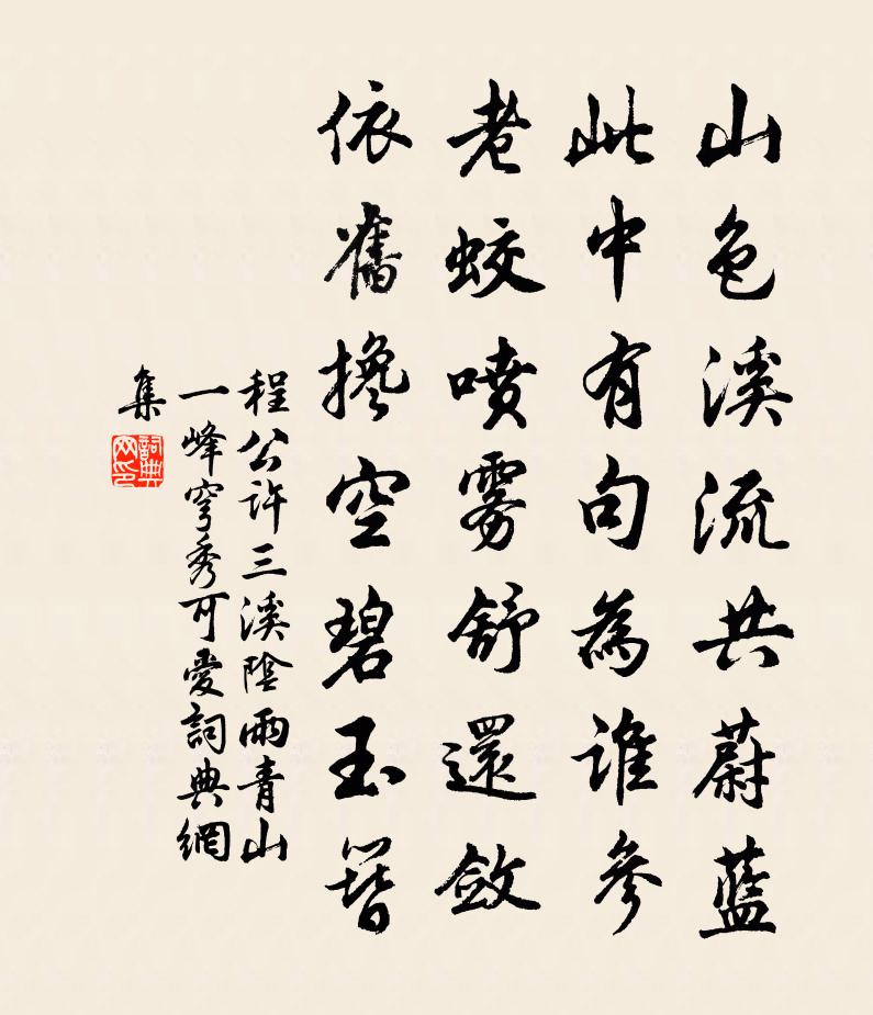 詩詞名句歷史字典書法欣賞書法字典國語詞典說文解字康熙字典古漢語字典標 題 作 者 詩 句 三溪陰雨青山一峰穹秀可愛作者:程公許 朝代:宋代三溪陰雨青山一峰穹秀可愛原文山色溪流共蔚藍,此中有句為誰參。老蛟噴霧舒還斂,依舊攙空碧玉簪。詩詞問答問:三溪陰雨青山一峰穹秀可愛的作者是誰?答:程公許問:三溪陰雨青山一峰穹秀可愛寫於哪個朝代?答:宋代程公許三溪陰雨青山一峰穹秀可愛書法欣賞三溪陰雨青山一峰穹秀可愛書法作品詩詞推薦題游叫岩范端臣〔宋代〕溪心磧石圓如磨,岩腹精廬冷似冰。弭楫來游沖夜雨,翛然一叟對孤僧。句鄭剛中〔宋代〕一寸雲萬斛泉。獵罷夜飲示獨孤生陸游〔宋代〕白袍如雪寶刀橫,醉上銀鞍身更輕。帖草角鷹掀兔窟,憑風羽箭作鴟鳴。關河可使成南北?豪傑誰堪共死生。欲疏洞仙歌(夜宴梁季全大卿賞牡丹作)管鑒〔宋代〕化工妙手,慣與花為主。忍便摧殘任風雨。翦姚黃、移魏紫,齊集梁園,春艷艷,何必尊前解語。繡屏深照影,簾感懷方岳〔宋代〕非乾寵辱不能驚,一付之天莫我攖。舉世忙時贏得懶,是人愛處放教輕。生為柱國身何在,死象祁連冢亦平。千古偈頌五十一首釋大觀〔宋代〕世尊不說說,正月孟春猶寒。迦葉不聞聞,二月仲春漸暄。從人覓小胡孫許寄杜甫〔唐代〕人說南州路,山猿樹樹懸。舉家聞若駭,為寄小如拳。預哂愁胡面,初調見馬鞭。許求聰慧者,童稚捧應癲。上元大雪重賦方岳〔宋代〕愁霖半月辦此雪,元夕山城特地寒。頓有園林春富貴,略無燈火夜闌珊。年飢那得花成市,天巧聊將玉作欄。百紫漁家傲楊端臣〔宋代〕樓鼓數聲人跡散。馬蹄不響街塵軟。門戶深深扃小院。簾不捲。背燈盡燭紅條短。歸路恍如春夢斷。千愁萬恨知河浣溪沙(即席次韻王正之覓遷哥鞋)史浩〔宋代〕一握鉤兒能幾何。弓弓珠蹙杏紅羅。即時分惠謝奴哥。香壓幽蘭蘭尚淺,樣窺初月月仍多。只堪掌上懨瓊波。六月望夜紀飲陳藻〔宋代〕年老聊依年少游,月圓庭上似中秋。舉杯問月爭多少,一度猶行甲子周。小飲袁說友〔宋代〕殘蟬古路無人跡,瑟瑟西風已三日。杜門卻掃處一室,顛倒筆硯理書帙。平生但恐辜吟筆,薄宦雲浮奚固必。客來夜坐齊己〔唐代〕百蟲聲里坐,夜色共冥冥。遠憶諸峰頂,曾棲此性靈。月華澄有象,詩思在無形。徹曙都忘寢,虛窗日照經。柳梢青(黃梅)黃人傑〔宋代〕恰則年時。風前雪底,初見南枝。可?匆匆,花才清瘦,子已紅肥。安排酒盞相隨。看金彈、累累四垂。渴後情懷訪白陂陳處士樂史〔宋代〕清風不見面,白汗呈波流。走來君洞裡,雲樹冷颼颼。更瀉葡萄綠,千杯活倒愁。魂疑更回首,殘熱又為讎。賢者之孝二百四十首郭巨林同〔宋代〕為養寧埋子,那知地有金。如何有天賜,且復怕官侵。和陶淵明歸田園居六詩陳造〔宋代〕一室類蜂房,為食來窮山。僅救飢火煎,跋履恐雕年。平生丘壑念,回首魚脫淵。鄉居何許家,菰茭滿中田。有兒友人李先輩醜父嘗以夷成詩二帙示余莫知為何劉克莊〔宋代〕筋力都非少壯時,不煩攬鏡覺吾衰。展禽出仕曾三已,表聖歸休有四宜。飽閱交情悲世道,差強人意賴君詩。此生北固山看大江孔尚任〔清代〕孤城鐵瓮四山圍,絕頂高秋坐落暉。眼見長江趨大海,青天卻似向西飛。途中有作杜荀鶴〔唐代〕無論南北與西東,名利牽人處處同。枕上事仍多馬上,山中心更甚關中。川原晚結陰沈氣,草樹秋生索漠風。百歲名句推薦丹灶初開火,仙桃正落花。孟浩然《清明日宴梅道士房 / 宴梅道士山房》 故國三千里,深宮二十年。張祜《宮詞·故國三千里》 淚眼倚樓頻獨語。雙燕飛來,陌上相逢否?馮延巳《鵲踏枝·幾日行云何處去》 春晚綠野秀,岩高白雲屯。謝靈運《入彭蠡湖口》 不怕慢,只怕站。佚名《增廣賢文·下集》 情似遊絲,人如飛絮。淚珠閣定空相覷。周紫芝《踏莎行·情似遊絲》 草螢有耀終非火,荷露雖團豈是珠。白居易《放言五首·其一》 道私者亂,道法者治。韓非及後人《韓非子·詭使》 春衫著破誰針線,點點行行淚痕滿。黃公紹《青玉案·年年社日停針線》 白錦無紋香爛漫,玉樹瓊葩堆雪。丘處機《無俗念·靈虛宮梨花詞》