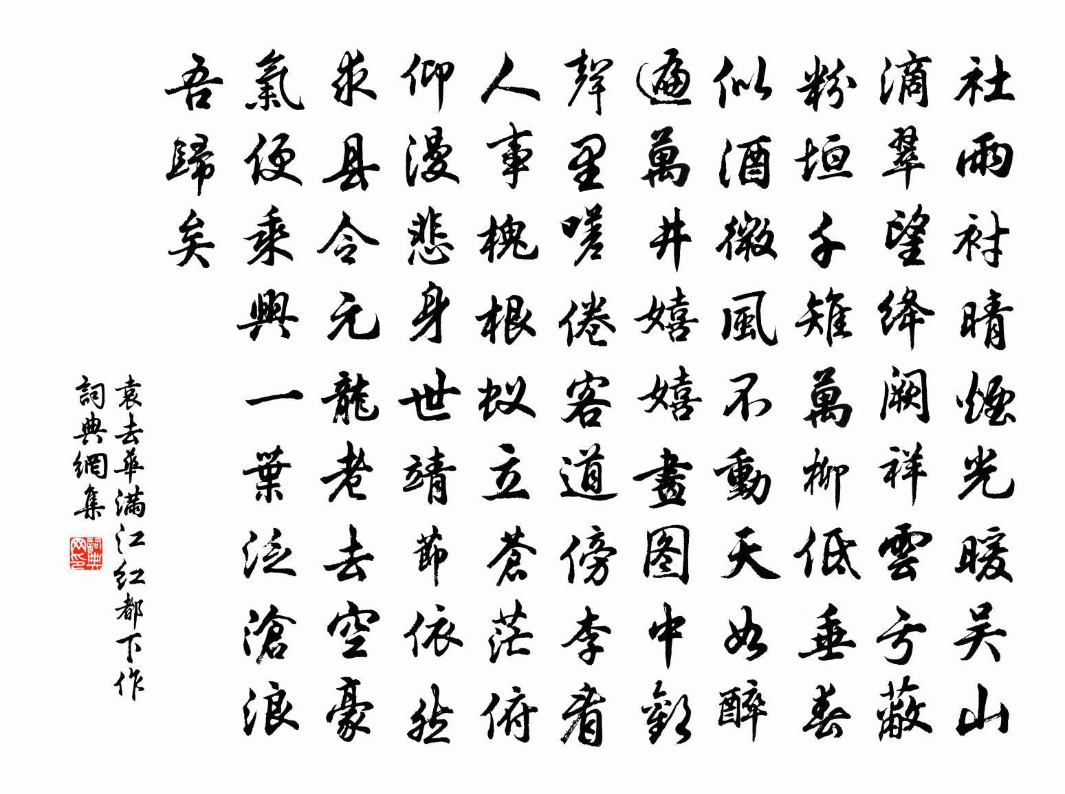 詩詞名句歷史字典書法欣賞書法字典國語詞典說文解字康熙字典古漢語字典標 題 作 者 詩 句 滿江紅(都下作)作者:袁去華 朝代:宋代滿江紅(都下作)原文社雨襯晴,煙光暖、吳山滴翠。望絳闕、祥雲虧蔽,粉垣千雉。萬柳低垂春似酒,微風不動天如醉。遍萬井、嬉嬉畫圖中,歡聲里。嗟倦客,道傍李。看人事,槐根蟻。立蒼茫俯仰,漫悲身世。靖節依然求縣令,元龍老去空豪氣。便乘興、一葉泛滄浪,吾歸矣。詩詞問答問:滿江紅(都下作)的作者是誰?答:袁去華問:滿江紅(都下作)寫於哪個朝代?答:宋代袁去華滿江紅(都下作)書法欣賞滿江紅(都下作)書法作品詩詞推薦滿宮花·花正芳張泌〔唐代〕花正芳,樓似綺,寂寞上陽宮裡。鈿籠金鎖睡鴛鴦,簾冷露華珠翠。嬌艷輕盈香雪膩,細雨黃鶯雙起。東風惆悵欲奉和正日臨朝岑文本〔唐代〕時雍表昌運,日正葉靈符。德兼三代禮,功包四海圖。逾沙紛在列,執玉儼相趨。清蹕喧輦道,張樂駭天衢。拂蜺游邊感懷二首張喬〔唐代〕貧游繚繞困邊沙,卻被遼陽戰士嗟。不是無家歸不得,有家歸去似無家。兄弟江南身塞北,雁飛猶自半年余。夜來用前韻勉陳進之赴省項安世〔宋代〕痴翁切莫強笞兒,子之勤勞我所知。但看匡衡穿壁苦,難雲寗越讀書遲。能來伴我滄浪艇,共看一年橙橘時。莫為奉和九月九日登慈恩寺浮屠應制岑羲〔唐代〕寶台聳天外,玉輦步雲端。日麗重陽景,風搖季月寒。梵堂遙集雁,帝樂近翔鸞。願獻延齡酒,長承湛露歡。荊江漁父竹枝詞九首和夔師□侍郎韻為荊師範項安世〔宋代〕七歌漁父壽香堆,花霧深深撥不開。水邊借得春風送,荷花吹上戟門來。勸學張詠〔宋代〕大化不自言,委之在英才。玄門非有閉,苦學當自開。世上百代名,莫遣寒如灰。晨雞固自勉,男子胡為哉。胸中鼎丁謂〔宋代〕妙盡三才象,精皆九貢金。克商遷洛邑,興漢出汾陰。郜賂慚非道,秦求愧醜心。觀銘知考甫,傴僂戒何深。秋日見橘花二首楊萬里〔宋代〕不夜非關月,無風也自香。著花能許細,落子不多長。玊糝開猶半,金須捻更強。得秋何恨脕,胦暑卻生涼。鷓鴣天晏幾道〔宋代〕一醉醒來春又殘,野棠梨雨淚闌乾。玉笙聲里鸞空怨,羅幕香中燕未還。終易散,且長閒,莫教離恨損朱顏。誰堪賀新郎辛棄疾〔宋代〕細把君詩說。悵餘音、鈞天浩蕩,洞庭膠葛。千尺陰崖塵不到,惟有層冰積雪。乍一見、寒生毛髮。自昔佳人多薄宜春道上楊時〔宋代〕艷杏夭桃日日稀,空餘涉氣尚遲遲。誰人為作留春計,莫放風花自在飛。歐陽從道許寄金橘以詩督之黃庭堅〔宋代〕禪客入秋無氣息,想依紅袖醉毰毸。霜枝搖落黃金彈,許送筠籠殊未來。贈徐松樓鑰〔宋代〕我為浮名媿引年,老餘八十尚飄然。不如合卻談天口,歸向白雲深處眠。登頫江三絕趙宰增為四複次韻答之追和陳造〔宋代〕兩夜北風吹石裂,雪神驕蹇更淹留。羈人坐嘆肌生粟,媚白妖紅耐此不。雜興陸游〔宋代〕詩人肝肺困雕鐫,往往壽非金石堅。我獨適情無傑句,化工不忌遣長年。減字木蘭花(內子生日)程大昌〔宋代〕距春五日。吉語攙先來飲席。易卦占新。八八周輪又再輪。開年定好。定把笙歌更藥裹。舊怕無孫。今已藍袍擁繡皇孫壽詩二首陳造〔宋代〕曾簉蓬萊挹德風,日親儒保罄寅恭。學窮奧閫包賢聖,人仰英明肖祖宗。彩服近天仍樂孺,帝觴拜賜列從容。應劉宣州雜詩二十首梅堯臣〔宋代〕伍員奔吳日,蒼皇及水濱。彎弓射楚使,解劍與漁人。抉目觀亡國,鞭屍失舊臣。猶為夜濤怒,來往百川頻。水調歌頭王質〔宋代〕草蔓已多露,松竹總含風。群山左顧右盼,如虎更如龍。時見漁燈三兩,知在誰家浦漵,星斗爛垂空。萬有付一掃名句推薦豈能無意酬烏鵲,惟與蜘蛛乞巧絲。李商隱《辛未七夕》 兄弟叔侄,須分多潤寡;長幼內外,宜法肅辭嚴。朱柏廬《朱子家訓·全文》 士為知己者死,女為悅己者容。劉向《戰國策·趙一·晉畢陽之孫豫讓》 重陽獨酌杯中酒,抱病起登江上台。杜甫《九日五首·其一》 冷艷全欺雪,余香乍入衣。丘為《左掖梨花》 禍與福相貫,生與亡為鄰劉向《戰國策·楚四·或謂楚王》 向河梁、回頭萬里,故人長絕。辛棄疾《賀新郎·別茂嘉十二弟》 女也不爽,士貳其行。士也罔極,二三其德。佚名《氓》 教也者,長善而救其失者也。戴聖《禮記·學記》 重足而立,側目而視。司馬遷《史記·汲鄭列傳》