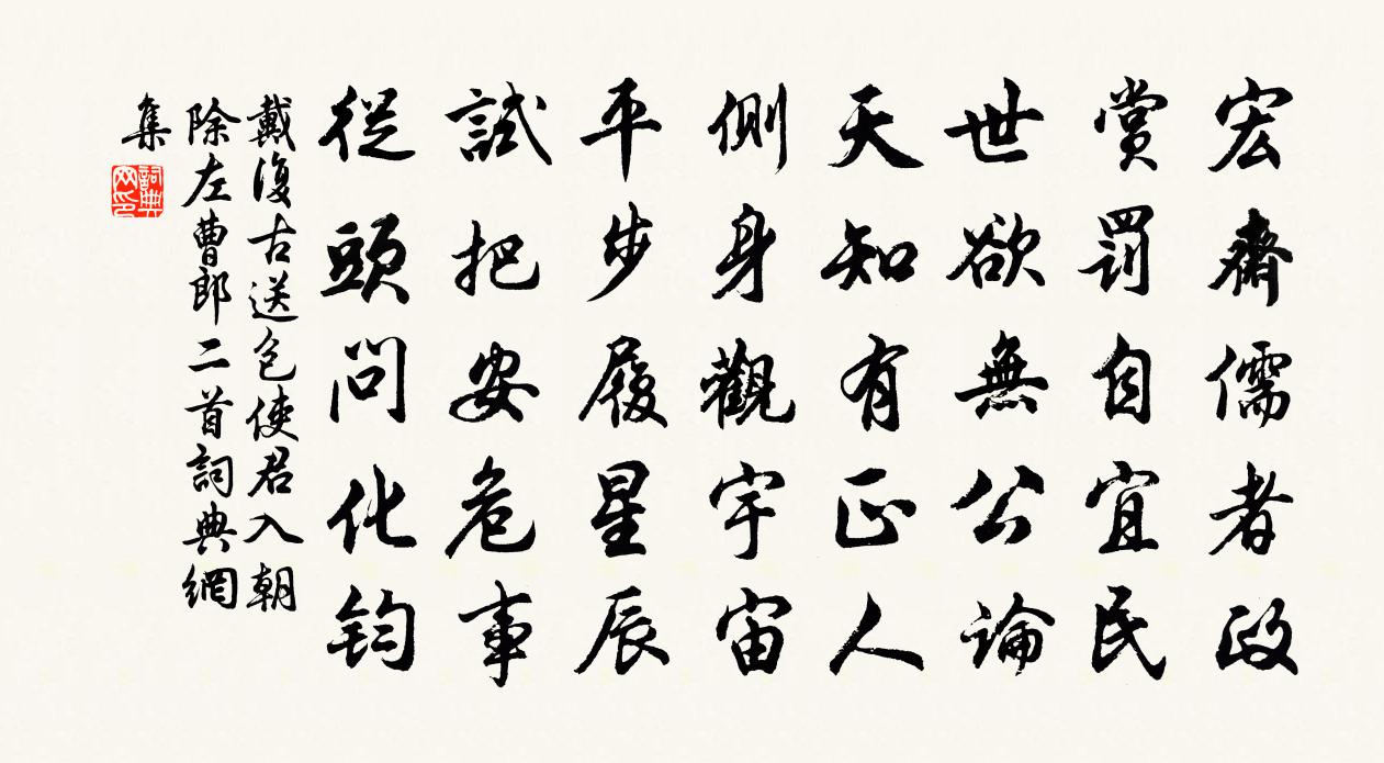 詩詞名句歷史字典書法欣賞書法字典國語詞典說文解字康熙字典古漢語字典標 題 作 者 詩 句 送包使君入朝除左曹郎二首作者:戴復古 朝代:宋代送包使君入朝除左曹郎二首原文宏齋儒者政,賞罰自宜民。世欲無公論,天知有正人。側身觀宇宙,平步履星辰。試把安危事,從頭問化鈞。詩詞問答問:送包使君入朝除左曹郎二首的作者是誰?答:戴復古問:送包使君入朝除左曹郎二首寫於哪個朝代?答:宋代問:戴復古的名句有哪些?答:戴復古名句大全戴復古送包使君入朝除左曹郎二首書法欣賞送包使君入朝除左曹郎二首書法作品詩詞推薦那吒蘇轍〔宋代〕北方天王有狂子,只知拜佛不拜父。佛知其愚難教語,寶塔令父左手舉。兒來見佛頭輒俯,且與拜父略相似。佛如安樂窩中一部書邵雍〔宋代〕安樂窩中一部書,號雲皇極意何如。春秋禮樂能遺則,父子君臣可廢乎。浩浩羲軒開闢後,巍巍堯舜協和初。炎炎混跡蘇泂〔宋代〕桃花新綠漲溪橋,楊柳傞傞弄舞腰。二月不堪寒尚在,一春無那病相撩。書編讀半懶重讀,爐籀燒殘欣復燒。老向宿建溪中宵即事歐陽詹〔唐代〕nNvF一席眠還坐,蛙噪螢飛夜未央。僮僕舟人空寂寂,隔簾微月入中倉。游虎丘林拱中〔宋代〕 * 岩前秋已闌,黑雲疏雨洗林巒。鐵花煙落石泉冷,羽井苔深霜月寒。隱浦疾帆風去飽,疏寮森木曉催丹。清齋偈頌二十五首釋道璨〔宋代〕桃花無數,李花無數。若向這裡活眼不開,平地上死人更是無數。去年踏青人今年不來,今年上墳底明年何處。日八月八日發潭州後得絕句四十首趙蕃〔宋代〕罾塘斷港劣容舟,鱍鱍盈籃叫不休。我亦買之將作臘,要和蔬茹紿飢喉。野渡宋祁〔宋代〕行路到溪窮,寒流自浼浼。客立平沙上,篙人艤船待。天申節致語口號陸游〔宋代〕宮殿紅雲捧紫皇,河清電繞擁休祥。壺中常占青春在,物外方知浩劫長。晝立龍旗風不動,曉開瓊笈遠飄香。堯年減字木蘭花洪惠英〔宋代〕梅花似雪。剛被雪來相挫折。雪裡梅花。無限精神總屬他。梅花無語。只有東君來作主。傳語東君。且與梅花作主五月齋戒,罷宴徹樂,聞韋賓客、皇甫郎中飲白居易〔唐代〕妓房匣鏡滿紅埃,酒庫封瓶生綠苔。居士爾時緣護戒,車公何事亦停杯。散齋香火今朝散,開素盤筵後日開。隨意周濟美輓詞韓元吉〔宋代〕乃翁持橐舊知名,兩郡分符見典型。禁闥方應馳儁步,中台俄忽隨修翎。故人零落風前葉,北空漂流雨後萍。白馬賀宋嗣宗除岳陽守五絕史堯弼〔宋代〕龍虎十年氣壯哉,抵排霜雪傲風雷。湖邊老樹勤封植,會有仙真邂逅來。念奴嬌蔡伸〔宋代〕歲華晼晚,念羈懷多感,佳會難卜。草草杯盤聊話舊,同剪西窗寒燭。翠袖籠香,雙蛾斂恨,低按新翻曲。無情風奉和聖制夏日游石淙山楊敬述〔唐代〕山中別有神仙地,屈曲幽深碧澗垂。岩前暫駐黃金輦,席上還飛白玉卮。遠近風泉俱合雜,高低雲石共參差。林壑畫馬圖鄭清之〔宋代〕房精夜隕渥窪水,中有天馬變如鬼。籋雲流赭登玉台,清風謖謖生雙耳。無端遣入天子閒,足底百趼如關山。隔河山亭三首李石〔宋代〕人誰憐老子,我自類痴兒。愛草留荒徑,疏泉入小池。春風隨處是,晴日與花宜。好客能相貸,攜鋤出短籬。寄歐陽振仲趙文〔宋代〕晚客他州只為飢,無人可與話心期。前生一念有今日,投老相逢復幾時。頭白可知天下事,秋深定有客中詩。何當補史十忠詩參政行丞相事陸公秀夫劉壎〔宋代〕天地無托足,海天同隰光,明知復何為。不忍隳三綱。裸薦覬少延,謳歌寧遠忘。或者莒在齊,聊且帝一方。竭蹶呈潘潭州十首趙蕃〔宋代〕微官本欲救饑寒,欲逭啼號政爾難。不是賢侯任吾恥,未容陋巷樂瓢簞。名句推薦願妾身為紅菡萏。年年生在秋江上。歐陽修《漁家傲·近日門前溪水漲》 憑高遠望,見家鄉、只在白雲深處。王瀾《念奴嬌·避地溢江書於新亭》 藍橋何處覓雲英。只有多情流水、伴人行。蘇軾《南歌子·寓意》 花明玉關雪,葉暖金窗煙。李白《折楊柳》 半生已分孤眠過,山枕檀痕涴。納蘭性德《虞美人·曲闌深處重相見》 何日請纓提銳旅,一鞭直渡清河洛。岳飛《滿江紅·登黃鶴樓有感》 無言獨上西樓,月如鉤。寂寞梧桐深院鎖清秋。李煜《相見歡·無言獨上西樓》 道狹草木長,夕露沾我衣。陶淵明《歸園田居·其三》 雁聲不到東籬畔,滿城但、風雨淒涼吳文英《惜黃花慢·菊》 甚獨抱清高,頓成淒楚。王沂孫《齊天樂·蟬》