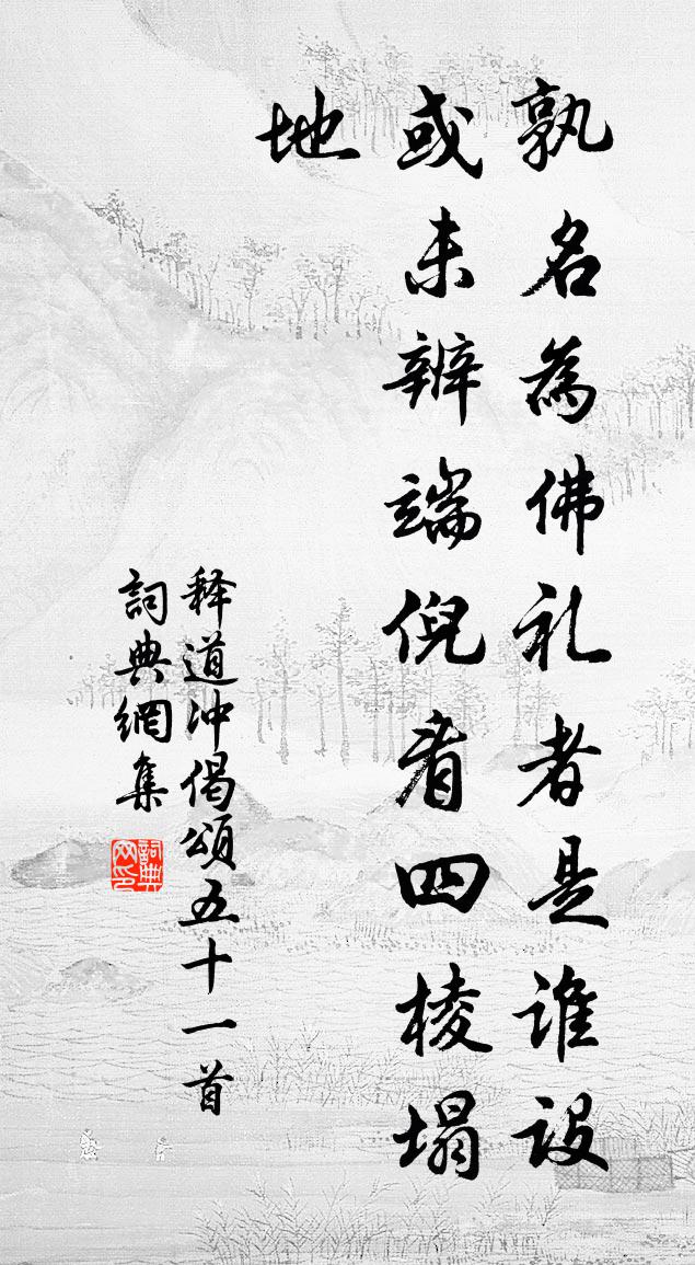 詩詞名句歷史字典書法欣賞書法字典國語詞典說文解字康熙字典古漢語字典標 題 作 者 詩 句 偈頌五十一首作者:釋道沖 朝代:宋代偈頌五十一首原文孰名為佛,禮者是誰。設或未辨端倪,看四棱塌地。詩詞問答問:偈頌五十一首的作者是誰?答:釋道沖問:偈頌五十一首寫於哪個朝代?答:宋代釋道沖偈頌五十一首書法欣賞偈頌五十一首書法作品詩詞推薦新亭梅偶作吳則禮〔宋代〕衡門宿昔只棲遲,慚愧三堂春事奇。為有叢筠傍流水,故教疏影作橫枝。香羅未辦凌波去,素魄休論啼鴃時。乞與洞玄歌長筌子〔元代〕倦遊退尺,栗里潛疏拙。浩氣凌空向誰說。醉酬春、醞釀三杯,遣幽興、滄茫一葉。更野服蕭然越林叢,拉信友,秋夜一絕韋應物〔唐代〕高閣漸凝露,涼葉稍飄闈。憶在南宮直,夜長鐘漏稀。次韻江子我蠟梅二首晃沖之〔宋代〕江城仍似錦城無,半額輕黃笑越姝。我亦少花如杜老,舍南為乞兩三株。將歸山逢友人杜荀鶴〔唐代〕儒為君子儒,儒道不妨孤。白髮多生矣,青山可住乎?徉狂寧是事,巧達又非夫。只此平生願,他人肯信無?贈敦復張耒〔宋代〕敦復想為詩,目見無全牛。天工忌其才,小邑使拘囚。漫塗以塵埃,訟訊群啾啾。尚於紛紜中,逸興時奔流。不知賦雪虞儔〔宋代〕風回雪急巧穿帷,黃竹歌殘更斂眉。燕集幾家尋鵠鷺,獵圍何處問狐狸。長飢政自愁黃獨,高臥誰能管竊脂。賴有句戴司顏〔唐代〕遠來朝鳳闕,歸去戀元侯。和陳必強韻廖行之〔宋代〕三旌之位不足貴,萬鍾於我其何加。誰如日欲無骨相,底用眼眩鳩盤茶。喔詩清籟助蕭爽,角壯餘子空雄夸。東洋梅溪徙居吾鄉北山下張埴〔宋代〕故人為糴罷,薄日杖藜明。天外飛鴻影,山中落木聲。一枝棲月靜,萬事付雲輕。只指梅花畔,留橋略{左竹右勺柳梢青(惜花)郭應祥〔宋代〕春事匆匆。花慵柳困,雨橫風狂。寄語詩人,須燒銀燭,與照紅妝。休言桃李河陽。但過眼、難尋色香。只有今宵泊橛澗觀渡梅堯臣〔宋代〕隔岸呼舟楫,臨河立馬牛。解鞍沙上憩,沉網渚間收。殘日銜沙尾,孤帆落戍頭。莫愁暄作雨,晚水白煙浮。喜同費君長官游周敦頤〔宋代〕尋山尋水侶尤難,愛利愛名心少間。此亦有君吾茂樂,不辭高遠共躋攀。初食筍蕨楊萬里〔宋代〕庖鳳烹龍世浪傳,猩唇熊掌我無緣。只逢筍蕨杯盤日,便是山林富貴天。稚子玉膚新脫錦,小兒紫臂未開拳。只嫌傷大理謝少卿顧況〔唐代〕舊館絕逢迎,新詩何處呈。空留封禪草,已作岱宗行。柳蠹風吹析,階崩雪繞平。無因重來此,剩哭兩三聲。送靈石齊物長老釋如珙〔宋代〕方丈守職莫輕忽,自然久久見全功。楊岐只是會監寺,踢出驢兒振祖風。甲午春前得雪尤袤〔宋代〕寒聲昨夜響蕭蕭,逗曉階庭亦已消。殘臘距春無幾日,一年飛雪只今朝。微陽欲動梅驚萼,餘潤才沾麥放苗。天意舟夜一章海印〔唐代〕水色連天色,風聲益浪聲。旅人歸思苦,漁叟夢魂驚。舉棹雲先到,移舟月逐行。旋吟詩句罷,猶見遠山橫。謝興公上人寄山水簇子齊己〔唐代〕半幅古潺顏,看來心意閒。何須尋鳥道,即此出人間。巘暮疑啼狖,松深認掩關。知君遠相惠,免我憶歸山。謝丁端叔直閣惠永嘉髹研句容香鬲楊萬里〔宋代〕元珍先生茁雲孫,雪竹有節豹有文。染雲作句本天巧,鏤冰生花無手痕。鵷鷺行邊舊聯翼,天祿閣中今獨直。半竿名句推薦太平之世多長壽人。王充《論衡·卷一·氣壽篇》 又莫是東風逐君來,便吹散眉間一點春皺蘇軾《洞仙歌·詠柳》 白髮漁樵江渚上,慣看秋月春風。楊慎《臨江仙·滾滾長江東逝水》 聲華實寡,危國亡土。佚名《黃帝四經·經法·亡論》 碧毯線頭抽早稻,青羅裙帶展新蒲。白居易《春題湖上》 何事非相思,江上葳蕤竹。吳均《登二妃廟》 此意有誰知,恨與孤鴻遠。楊無咎《生查子·秋來愁更深》 何須急管吹雲暝,高寒灩灩開金餅。高觀國《菩薩蠻·何須急管吹雲暝》 精誠由中,故其文語感動人深。王充《論衡·卷十三·超奇篇》 山荒聊可田,錢鎛還易辦。王守仁《謫居糧絕請學於農將田南山詠言寄懷》