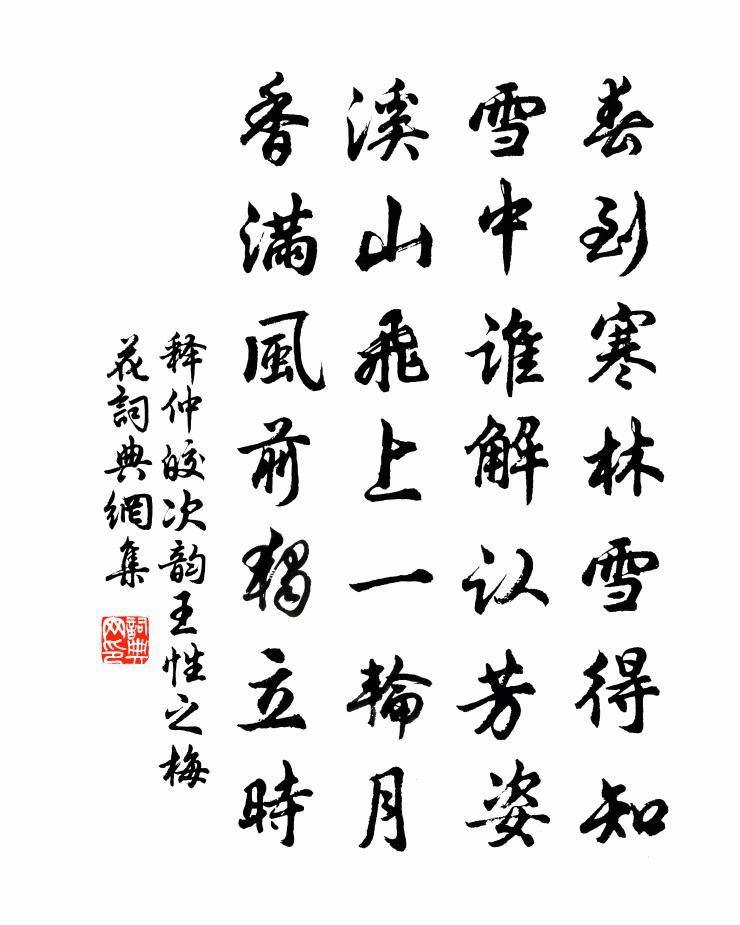 詩詞名句歷史字典書法欣賞書法字典國語詞典說文解字康熙字典古漢語字典標 題 作 者 詩 句 次韻王性之梅花作者:釋仲皎 朝代:宋代次韻王性之梅花原文春到寒林雪得知,雪中誰解認芳姿。溪山飛上一輪月,香滿風前獨立時。詩詞問答問:次韻王性之梅花的作者是誰?答:釋仲皎問:次韻王性之梅花寫於哪個朝代?答:宋代釋仲皎次韻王性之梅花書法欣賞次韻王性之梅花書法作品詩詞推薦孟子有庳陳普〔宋代〕弟兄小忍與堪憐,公義私情獲兩全。管叔若教封有庳,如凶凶罪豈無偏。荊門勉懷寄道林寺諸友齊己〔唐代〕榮枯得失理昭然,誰學離騷更問天。生下便知真夢幻,老來何必嘆流年。清風不變詩應在,明月無蹤道可傳。珍重奉化寶化石岩花鳳樊圃〔宋代〕山僧取巧蟠珍業,九苞占盡千葩紅。倚闌精彩欲飛動,百鳥不敢啼春風。題洪崖先生像錢選〔宋代〕神駕馭倒景,太虛時總轡。玄道不可分,直悟天人際。群從皆成仙,玩世不計年。何當事神遊,許我笑拍肩。夏日晚興陸游〔宋代〕高掛虛窗對綠池,鳥啼聲歇柳陰移。含風珍簟閒眠處,疊雪輕衫新浴時。泉冷甘瓜開碧玉,手香素藕罥長絲。夕陽閨情代作杜牧〔唐代〕梧桐葉落雁初歸,迢遞無因寄遠衣。月照石泉金點冷,鳳酣簫管玉聲微。佳人刀杵秋風外,盪子從征夢寐希。遙望病齒陸游〔宋代〕似病非病臂已瘳,當墮末墮齒難留。一杯藜粥吾所美,幸可自辦不待求。既無齧骨犯曲禮,亦免祝鯁煩成周。形骸偈頌七十八首釋正覺〔宋代〕雲無心而自閒,天無際而能寬。道無像而普應,神無慮而常安。隨之也不見去跡,迎之也不見來端。一藏教只成贊文筆峰余復〔宋代〕一飛一飛知幾時,斗酒落魂誰共知。胸中造物飽星斗,筆下方字盤蛟螭。甲申寧廟輓詞李曾伯〔宋代〕德化勤三紀,仁聲溢九州。汗衣昭禹儉,昃食軫文憂。潤色恢鴻業,艱難啟燕謀。中興宗漢廟,端自敬天休。浣溪沙晏殊〔宋代〕三月和風滿上林。牡丹妖艷直千金。惱人天氣又春陰。為我轉回紅臉面,向誰分付紫檀心。有情須殢酒杯深。和巨濟韻薛紹彭〔宋代〕通泉字法出官奴,日日臨池恨不如。雙鯉可無輕素練,數行惟作硬黃書。鄉關何處三秦路,馬足經年萬里余。多謝仲弟未歸歲晚有懷蔡淵〔宋代〕明月照席寒,生我愁百端。冉冉歲雲徂,遊子不顧還。相送荷花碧,相望楓葉丹。高樓日千回,散步東林隈。攀條和公實書懷鄭剛中〔宋代〕學古謾拙僻,高談成繆悠。吾今百念冷,泛泛如虛舟。參佐托裴度,道路無一愁。願同陳元龍,時臥百盡樓。玉階怨鄭鏦〔唐代〕昔日同飛燕,今朝似伯勞。情深爭擲果,寵罷怨殘桃。別殿春心斷,長門夜樹高。雖能不自悔,誰見舊衣褒。晚泊漳州營頭亭歐陽詹〔唐代〕回峰疊嶂繞庭隅,散點菸霞勝畫圖。日暮華軒卷長箔,太清雲上對蓬壺。調笑令 和師韻贈張馬二公馬鈺〔元代〕調笑。論微妙。月內銀蟾端千跳。中宵日裡金雞叫。坎虎離龍圍繞。忽然撞著奼嬰召。共守丹爐了了。蝶戀花王采〔宋代〕穠艷嬌春春婉娩。雨惜風饒,學得宮妝淺。愛把綠眉都不展。無言脈脈情何限。花下當時紅粉面。準擬新年,都向陪張舍人出郊曾季貍〔宋代〕官椏千尋大,清溪五尺流。眼年春事過,心與老農謀。節物年年好,田園事事幽。緩歸陪皂蓋,覓句待蘇州。和答王世弼黃庭堅〔宋代〕文章年少氣如虹,肯愛閒曹一禿翁。弦上深知流水意,鼻端不怯運斤風。燕堂淡薄無歌舞,鮭菜清貧只韭蔥。慚愧名句推薦風為裳,水為佩李賀《蘇小小墓》 博觀而約取,厚積而薄發蘇軾《稼說送張琥》 女蘿發馨香,菟絲斷人腸。李白《古意》 君子引而不發,躍如也。孟子《孟子·盡心章句上·第四十一節》 寵錫從仙禁,光華出漢京。張九齡《奉和聖制送尚書燕國公赴朔方》 凡治天下,必因人情。韓非及後人《韓非子·八經》 漳水出焉,東流注於河。佚名《精衛填海》 對此懷素心,千里共明月德隱《新秋晚眺》 升堂坐階新雨足,芭蕉葉大梔子肥。韓愈《山石》 回頭流水小橋東,煙掃畫樓出。雷應春《好事近·梅片作團飛》