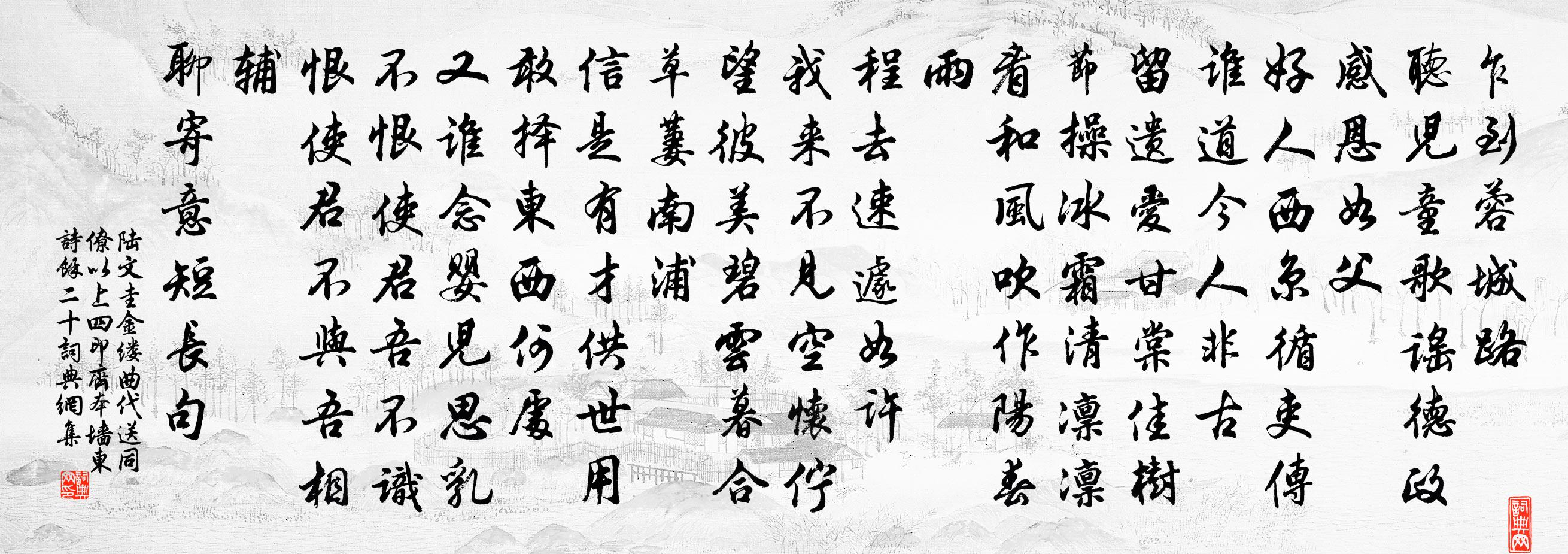 詩詞名句歷史字典書法欣賞書法字典國語詞典說文解字康熙字典古漢語字典標 題 作 者 詩 句 金縷曲 代送同僚 以上四印齊本牆東詩餘二十作者:陸文圭 朝代:元代原文乍到蓉城路。聽兒童歌謠德政,感恩如父。好人西京循吏傳,誰道今人非古。留遺愛、甘棠佳樹。節操冰霜清凜凜,看和風、吹作陽春雨。程去速,遽如許。我來不見空懷佇。望彼美、碧雲暮合,草萋南浦。信是有才供世用,敢擇東西何處。又誰念、嬰兒思乳。不恨使君吾不識,恨使君不與吾相輔。聊寄意,短長句。詩詞問答問:《金縷曲 代送同僚 以上四印齊本牆東詩餘二十》的作者是誰?答:陸文圭問:該詩寫於哪個朝代?答:元代問:該詩是什麼體裁?答:詞書法欣賞金縷曲 代送同僚 以上四印齊本牆東詩餘二十書法作品詩詞推薦送辛吉甫常州覲省陳羽〔唐代〕西去蘭陵家不遠,到家還及采蘭時。新年送客我為客,惆悵門前黃柳絲。蠟梅十五絕和陳天予韻唐仲友〔宋代〕積雪愁陰久不開,為憐花冷故徘徊。憑君琢句留金蕊,待取霜風送月來。尚書湯公輓詞樓鑰〔宋代〕奏邸崇先契,周旋古括州。殿庭觀唱第,海郡繼承流。方快飛騰上,俄聞汗漫遊。鳳凰山下路,丹旆想悠悠。慶東原張養浩〔元代〕鶴立花邊玉,鶯啼樹杪弦,喜沙鷗也解相留戀。一個沖開錦川,一個啼殘翠煙,一個飛上青天。詩句欲成時,滿地和陶命子韻示津調官吳芾〔宋代〕我愛二龔,絕勝二唐。克著清節,終始有光。夫豈不知,伊傅在商。相湯洎高,俱致明昌。訪野老陸游〔宋代〕農事元知要細評,野人有舊得尋盟。林深未見果蔬地,舍近先聞雞犬聲。春水築塘謀竭作,陽坡臥犢約同耕。老來挽吳丞相胡寅〔宋代〕黃扉清啟帝之初,俊乂招徠念遠圖。桃李舒華方雨露,鴛鴻戢翼又江湖。當年舉國蒙休烈,至死無人雪厚誣。圓覺偈頌六十八首釋法薰〔宋代〕大小大香岩,尾巴拖地。靈隱一機,全無所示。若也不會,投子道底。待斯遠不至趙蕃〔宋代〕靈溪寺下靈溪渡,跋馬欲前還又回。準擬故人能會宿,不知何事不成來。和程公辟紅梅陳襄〔宋代〕誰把繁英染絳脂,曉妝紅淡臘前時。栽培上苑無多地,囑付行人第一枝。朔雪有情相掩映,東風何事少噓吹。莫嫌贈汲郡太守詩陸雲〔魏晉〕悠悠斯民。三代直道。我求明德。惟奚攸考。緝熙暉章。天祿來保。惠心無兢。豐化有造。訓蒙二首劉克莊〔宋代〕少喜浮名謬激昂,晚溫故讀稍精詳。易全何患乾坤毀,騷在堪爭日月光。漆簡字更經學誤,玉台體出選詩亡。殘年戲贈侯常侍李洞〔唐代〕葛洪卷與江淹賦,名動天邊傲石居。兩蜀詞人多載後,同君諱卻馬相如。次韻奉和仲謨夜話唐史黃庭堅〔宋代〕貞觀規摹誠遠大,開元宗社半存亡。才聞冠蓋游西蜀,又見干戈暗洛陽。哲婦乘時傾嫡後,大閽當國定儲皇。傷心題邵古香乾坤一亭何夢桂〔宋代〕一亭亦直寄,作者知為誰。結薜開戶牖,柱桂辛一夷楣。百年此宴樂,常恐生憂悲。天地一傳舍,過客安可羈。唐齋前獨坐戲作陸游〔宋代〕閉戶學僧坐,頹然遺世情。虛窗鴿飛影,枯葉犬行聲。雪擁杉灰暖,雲垂紙帳明。清饞不可耐,一笑聽華鯨。柴門晚步張嵲〔宋代〕柴門一延竚,暮色集四山。雨歇林藹變,歲陰嵐氣寒。峰高看月上,巢昏遲烏還。游眺暫自適,裴回反長嘆。幽思朝回遊城南白居易〔唐代〕朝退馬未困,秋初日猶長。回轡城南去,郊野正清涼。水竹夾小徑,縈迴繞川崗。仰看晚山色,俯弄秋泉光。青松滿庭芳周必大〔宋代〕天壤茫茫,人心殊觀,未免因欠思餘。太山邱垤,同載一方輿。那更長沙下濕,祝融峰、才比吾廬。秋風冷,攀緣送別友人詩沈約〔南北朝〕君東我亦西。銜悲涕如霰。浮雲一南北。何由展言宴。方作異鄉人。贈子同心扇。遙裔發海鴻。連翻出檐燕。春秋名句推薦暗教愁損蘭成,可憐夜夜關情張炎《清平樂·候蛩淒斷》 菊暗荷枯一夜霜。新苞綠葉照林光。蘇軾《浣溪沙·詠橘》 功過不宜少混,混則人懷惰隳之心洪應明《菜根譚·概論》 善善不進,惡惡不退;賢者隱蔽,不肖在位;國受其害。黃石公《三略·上略》 無邊家國事,併入雙蛾翠。秋瑾《菩薩蠻·寄女伴》 十月江南天氣好,可憐冬景似春華。白居易《早冬》 黃葉古祠寒雨積,清山荒冢白雲多。于謙《岳忠武王祠》 若為化得身千億,散上峰頭望故鄉。柳宗元《與浩初上人同看山寄京華親故》 一時勸人以口,百世勸人以書。袁黃《了凡四訓·積善之方》 魄依鉤樣小,扇逐漢機團。薛濤《月》